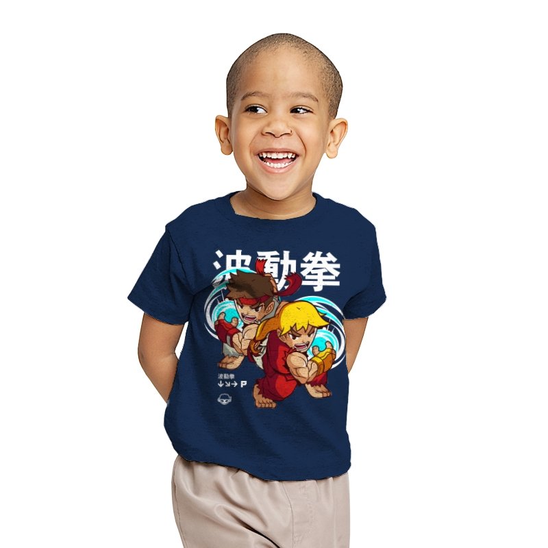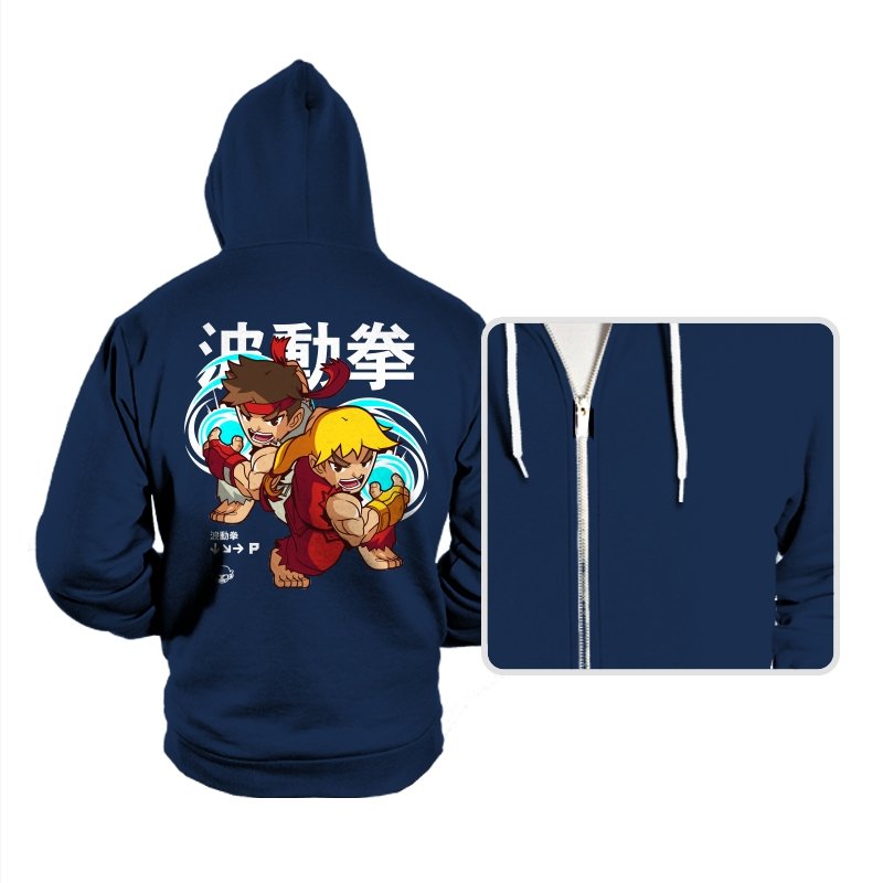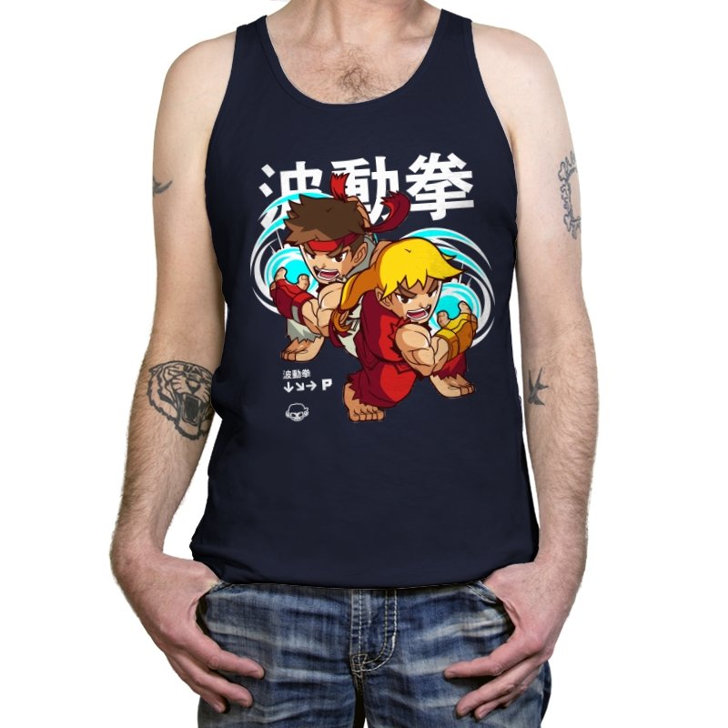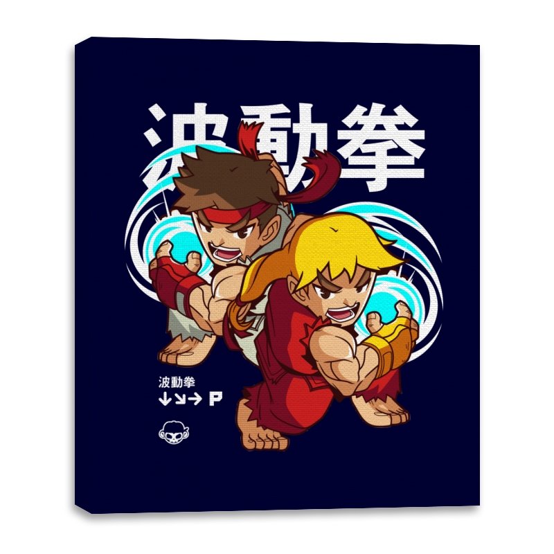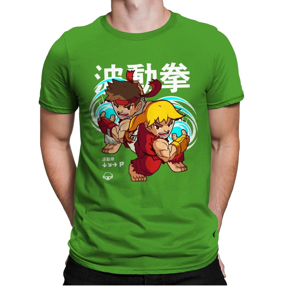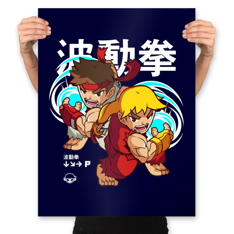 This design takes a familiar fighting game moment and filters it through a playful, chibi lens. Two compact martial artists mirror each other mid-strike, energy swirling as if frozen between inputs. The exaggerated expressions and rounded proportions soften the intensity without losing the motion. Fans who learned the move by muscle memory will spot it instantly.