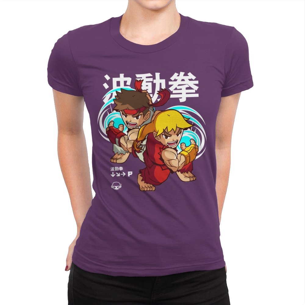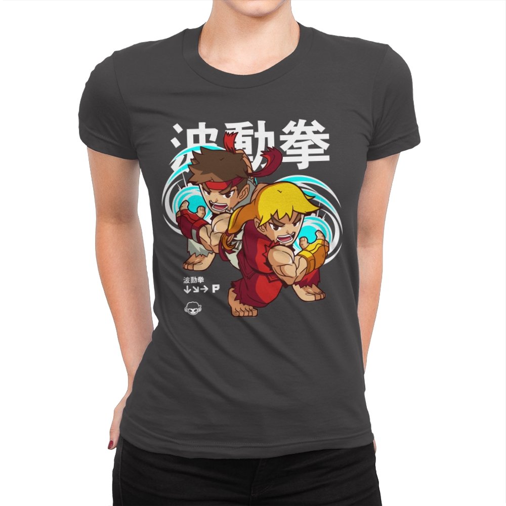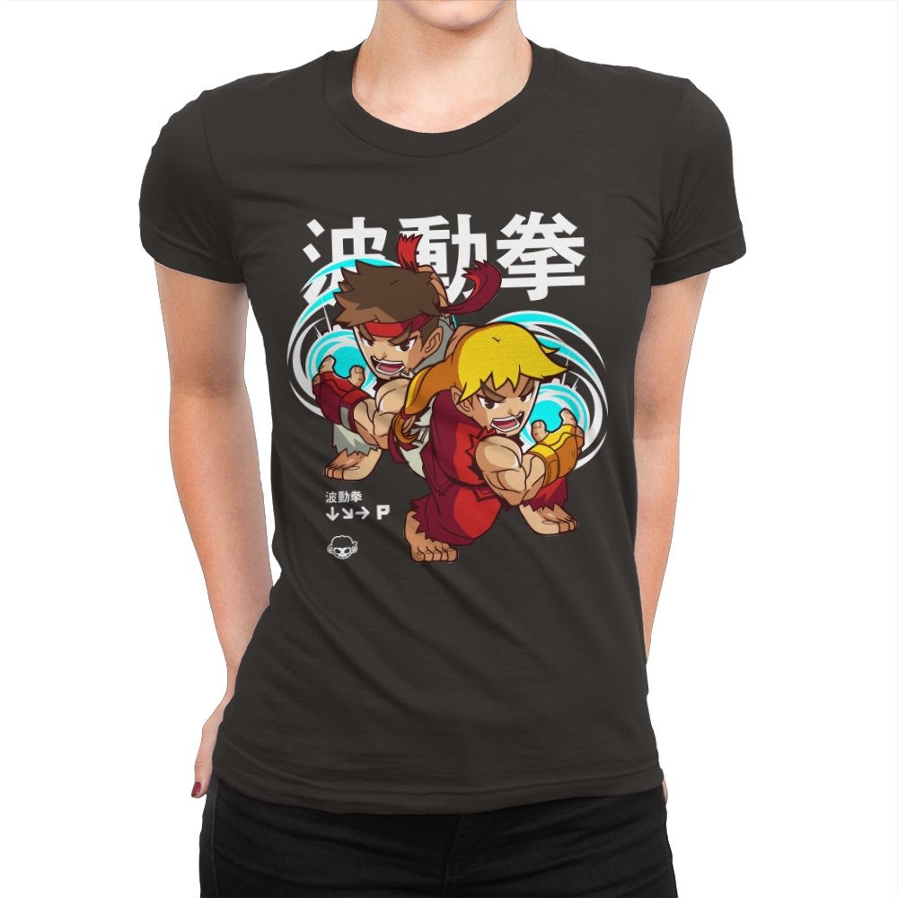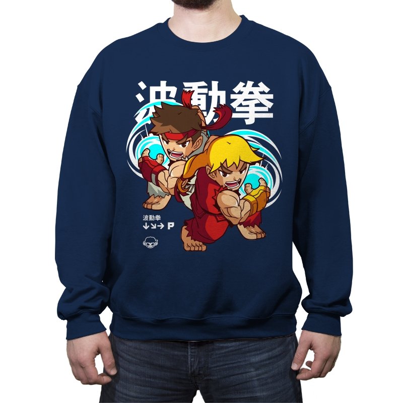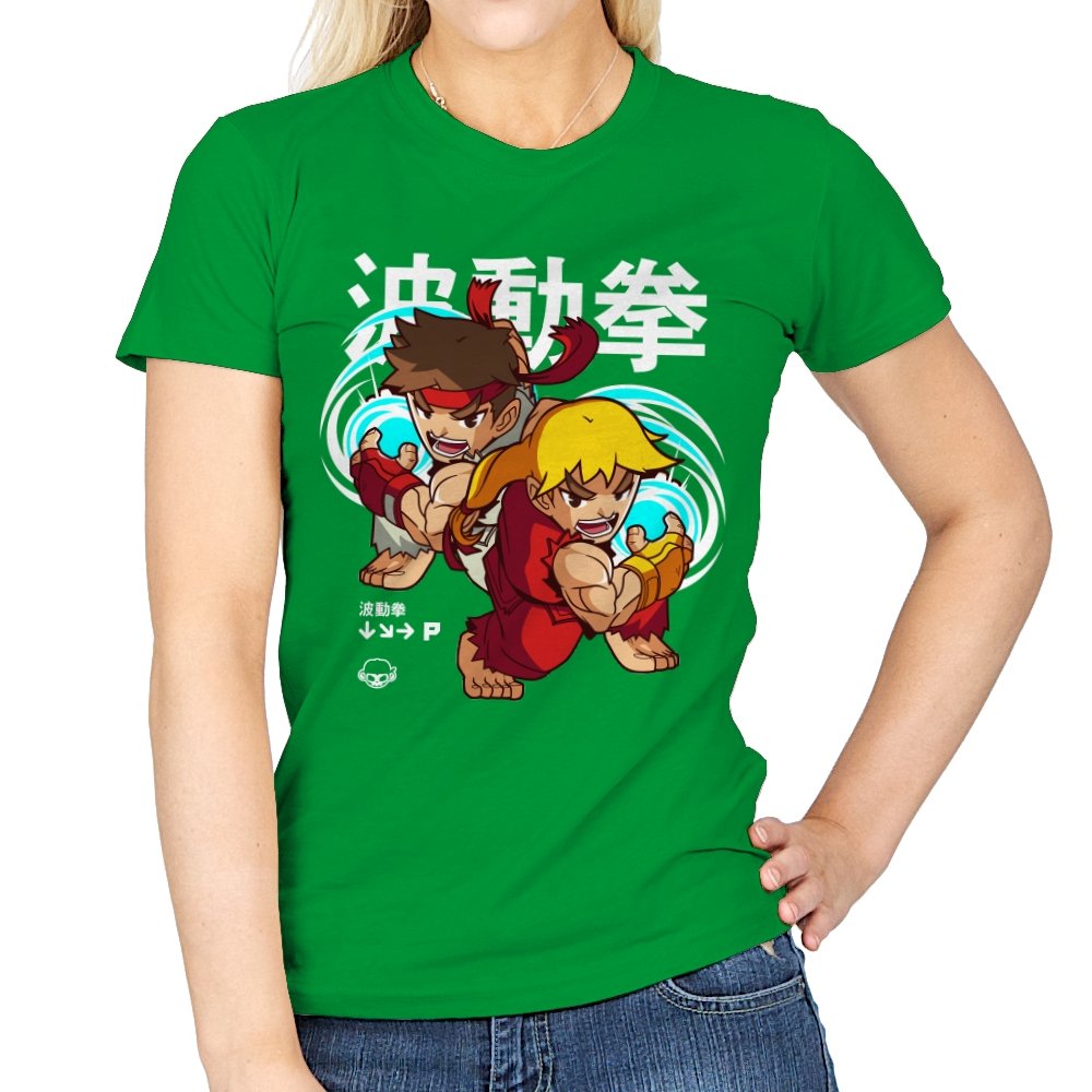 This design takes a familiar fighting game moment and filters it through a playful, chibi lens. Two compact martial artists mirror each other mid-strike, energy swirling as if frozen between inputs. The exaggerated expressions and rounded proportions soften the intensity without losing the motion. Fans who learned the move by muscle memory will spot it instantly.