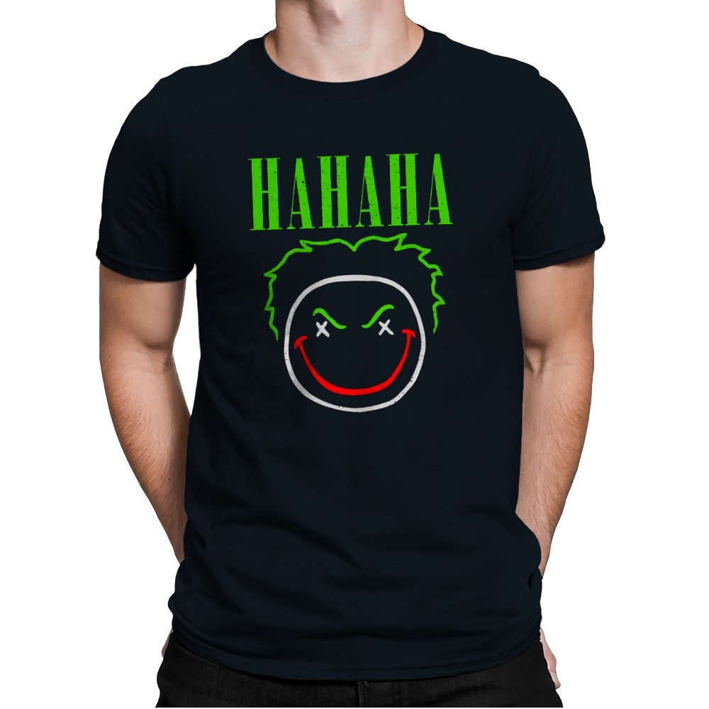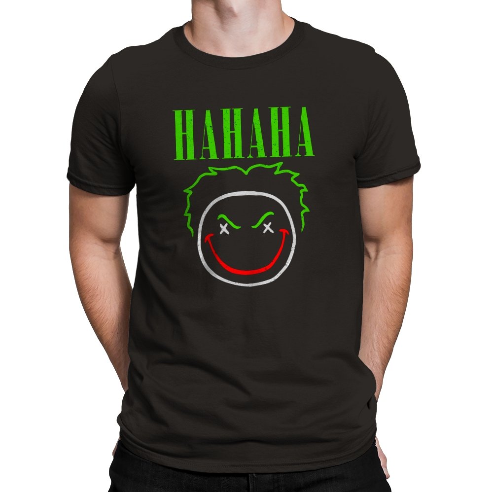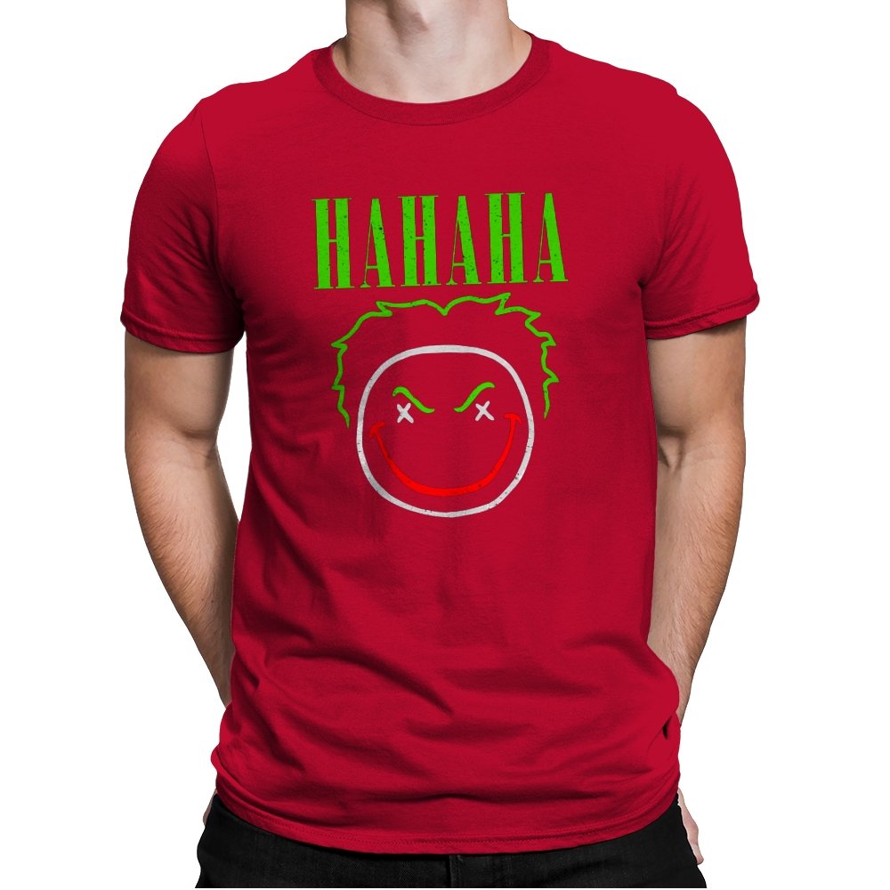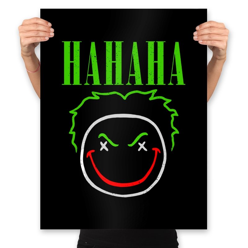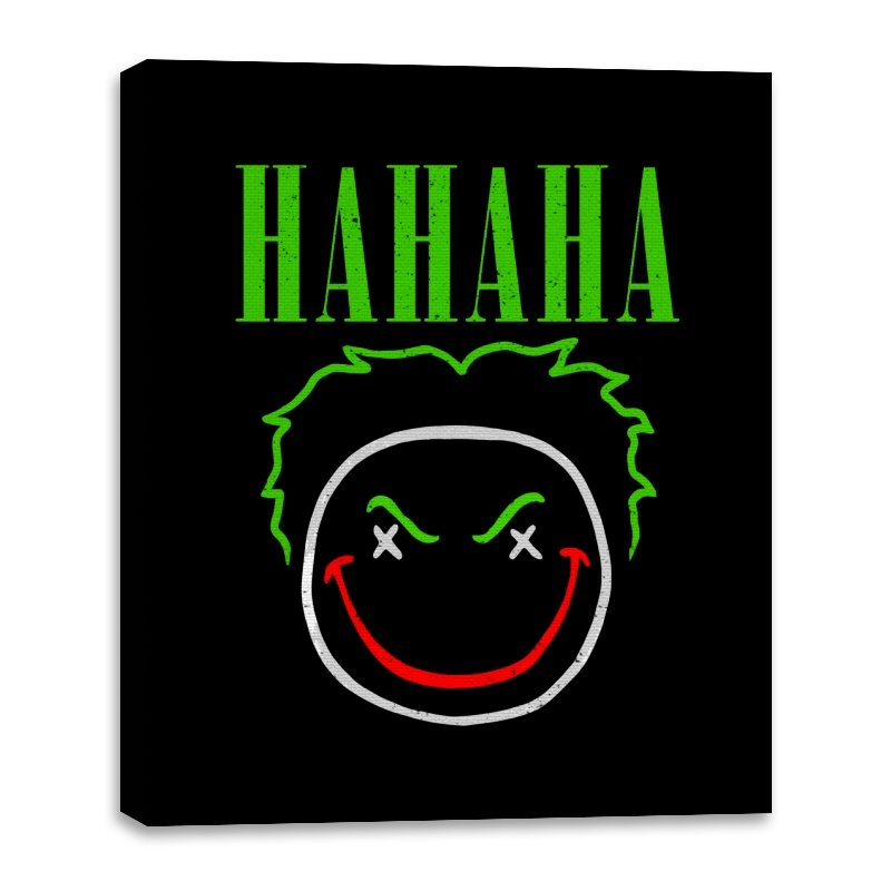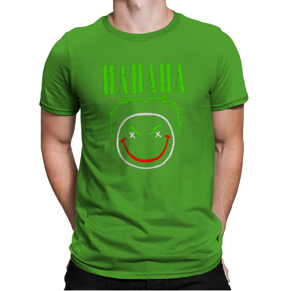 The word HAHAHA glows in neon green above a simple line drawn face with messy hair, crossed out eyes, and a red smile that looks more carved than cheerful. The whole image reads like graffiti from a chaotic comedian who treats the alleyway as their stage. Fans will recognize the villainous influence without needing a single proper name. It hits that sweet spot between street art and comic book shorthand.