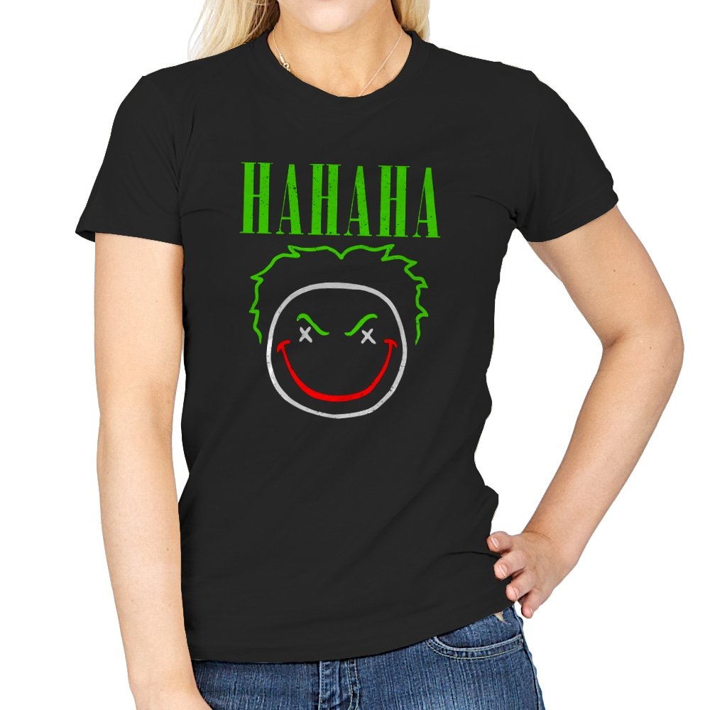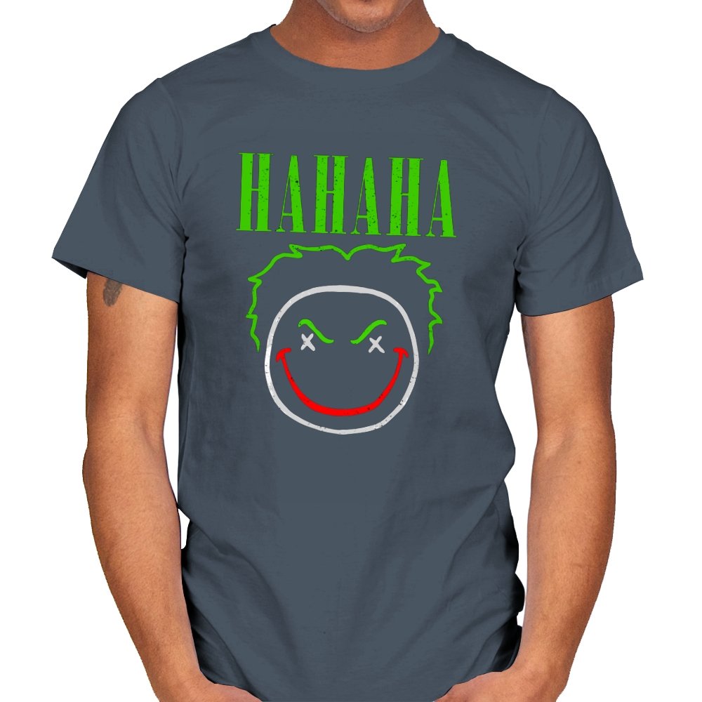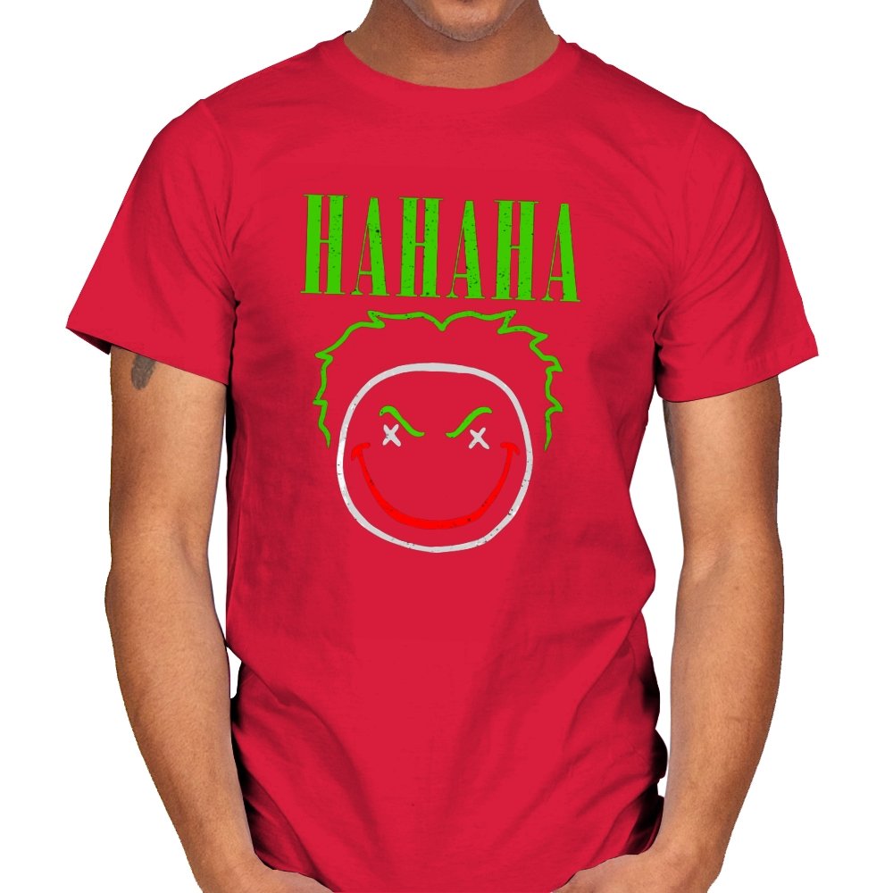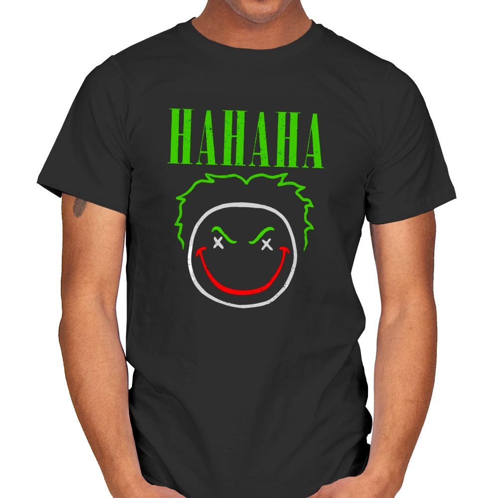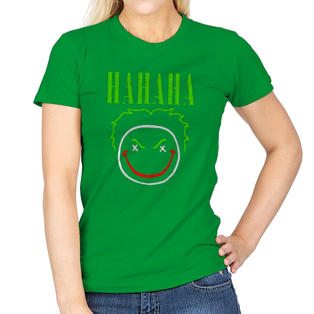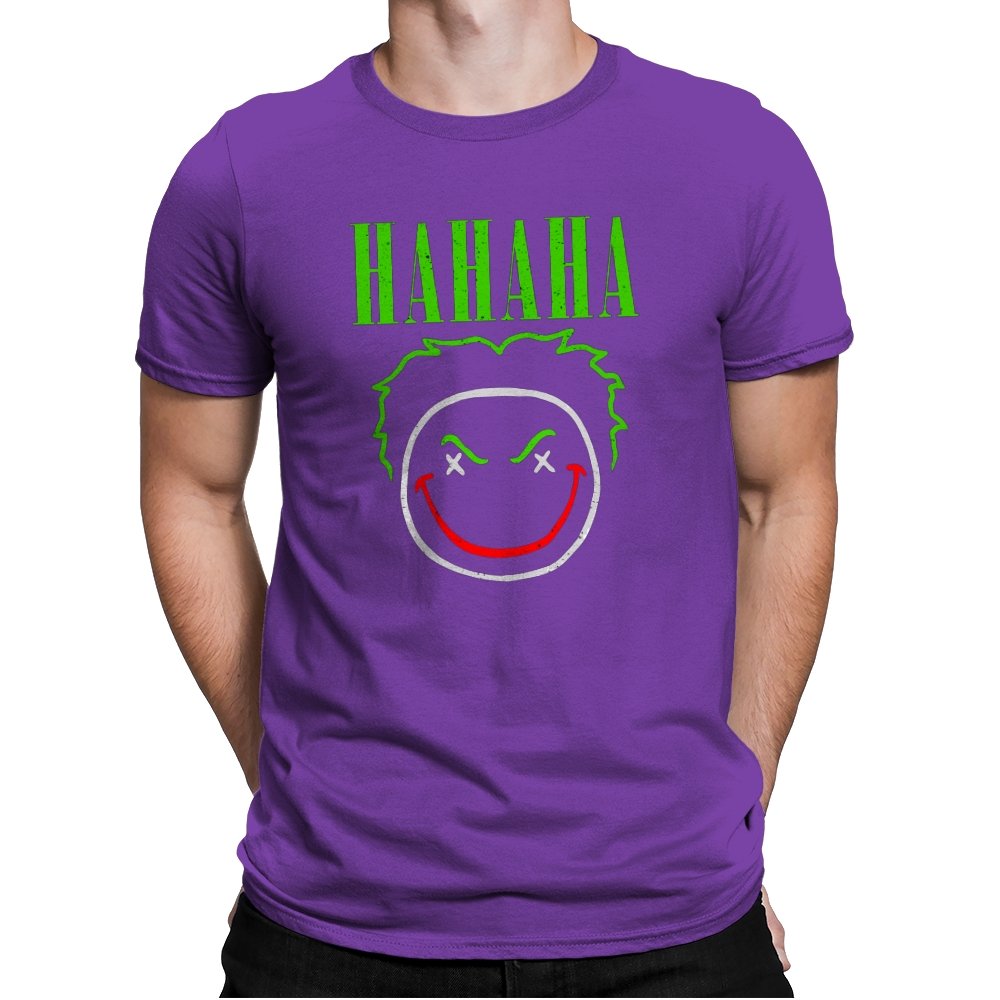The word HAHAHA glows in neon green above a simple line drawn face with messy hair, crossed out eyes, and a red smile that looks more carved than cheerful. The whole image reads like graffiti from a chaotic comedian who treats the alleyway as their stage. Fans will recognize the villainous influence without needing a single proper name. It hits that sweet spot between street art and comic book shorthand.