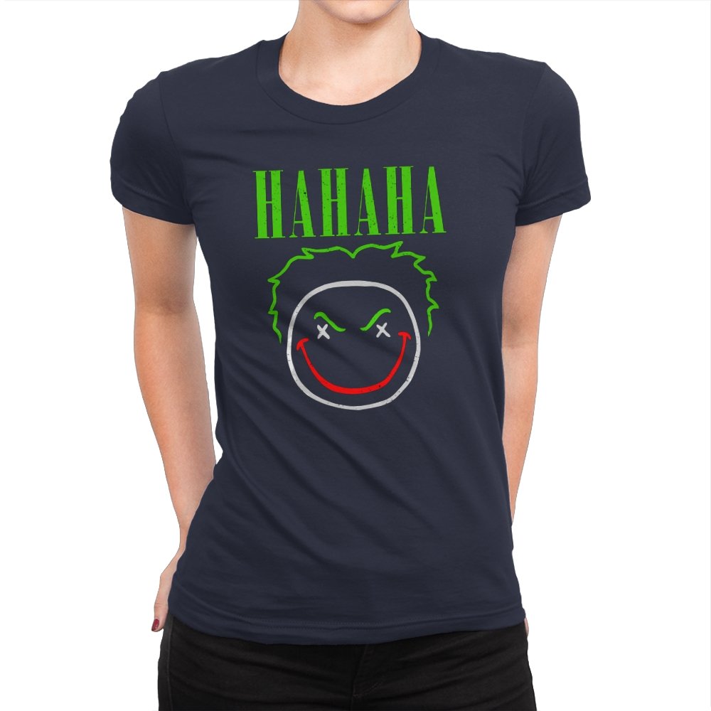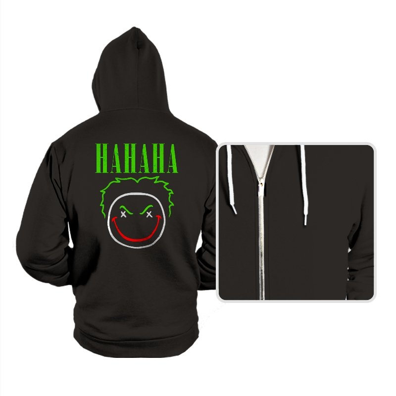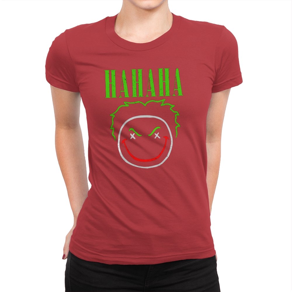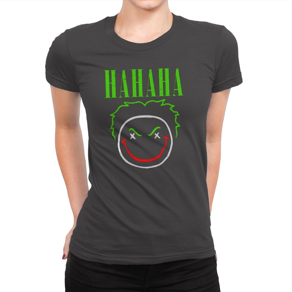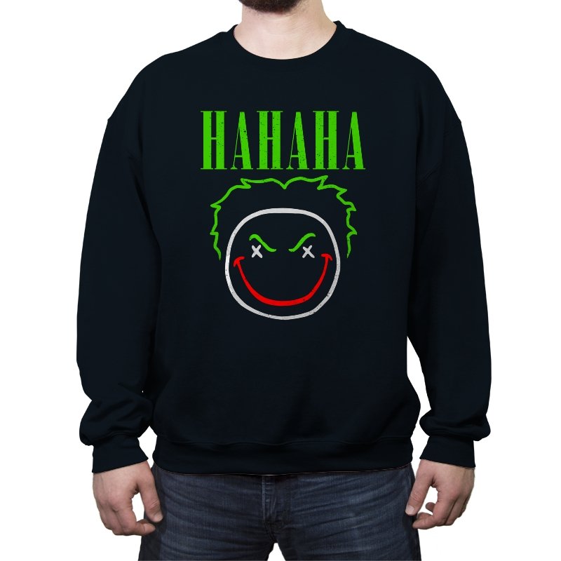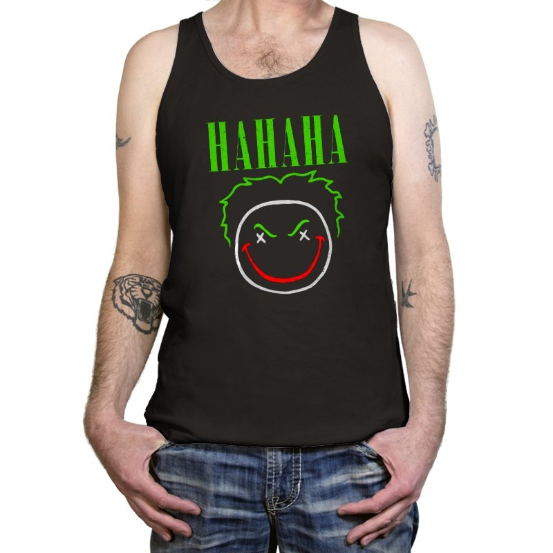 The word HAHAHA glows in neon green above a simple line drawn face with messy hair, crossed out eyes, and a red smile that looks more carved than cheerful. The whole image reads like graffiti from a chaotic comedian who treats the alleyway as their stage. Fans will recognize the villainous influence without needing a single proper name. It hits that sweet spot between street art and comic book shorthand.