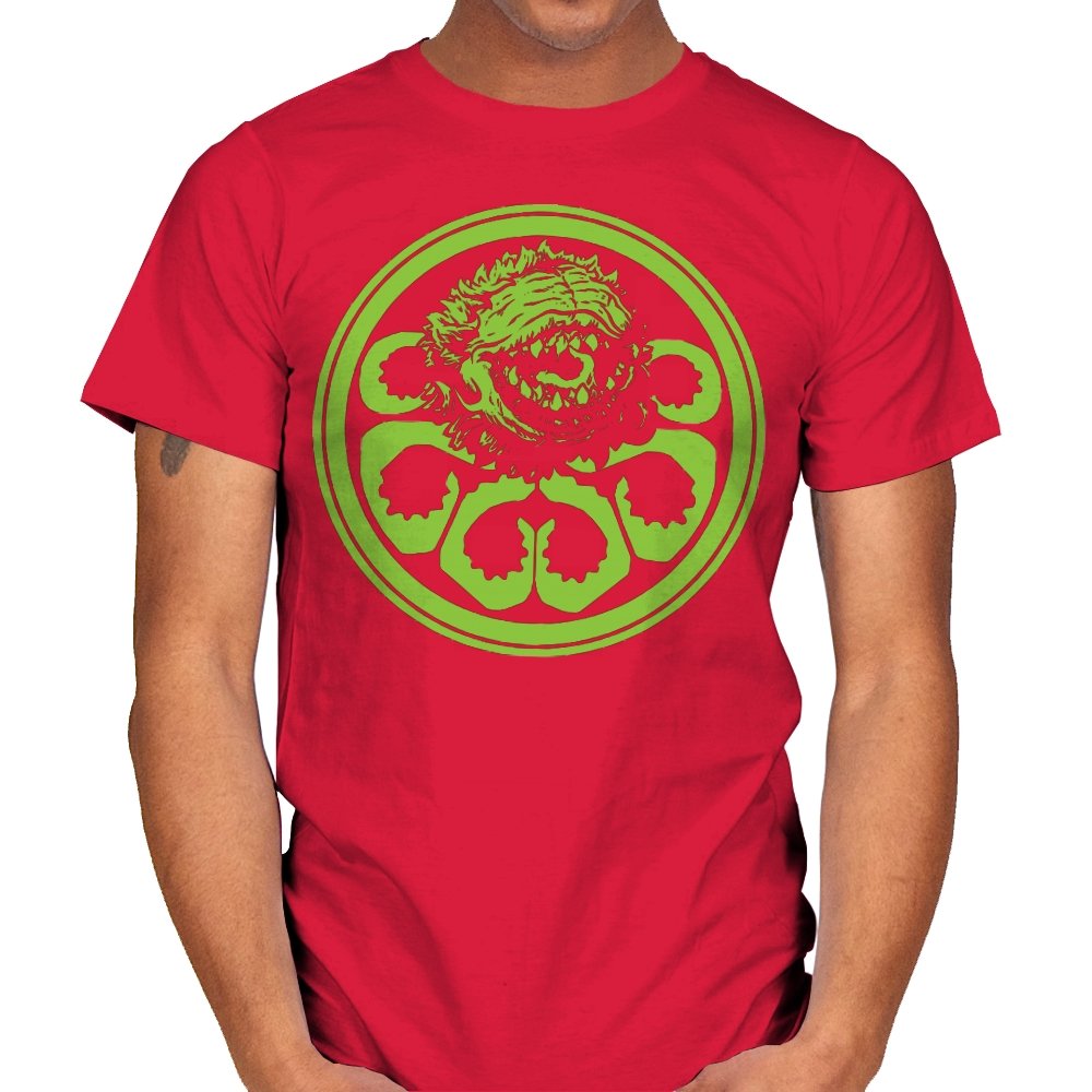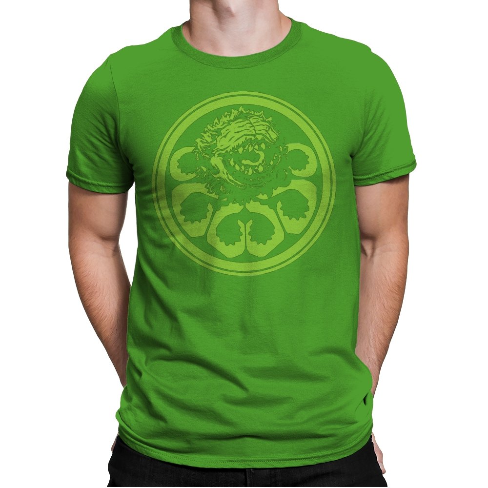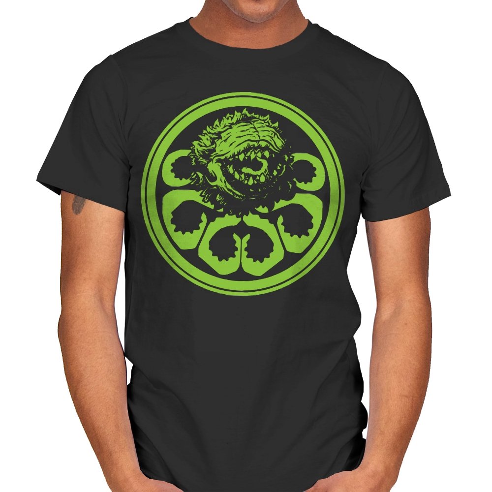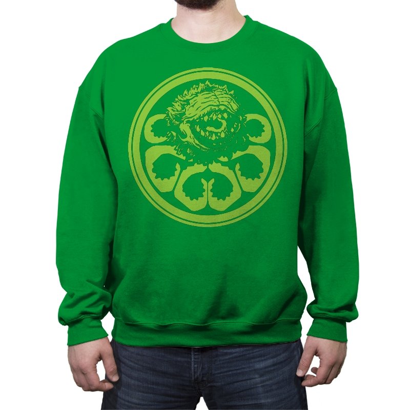 Hail, Audrey II turns a cult stage and screen menace into a lush emblem. The snarling plant head sits at the center of a circular crest, teeth bared and petals curling like a crown. The outer ring features repeating seedling shapes that hint at growth, hunger, and a plan that did not stop at the flower shop. The monochrome green palette gives it the feel of a botanical sigil rather than a straight character portrait.
