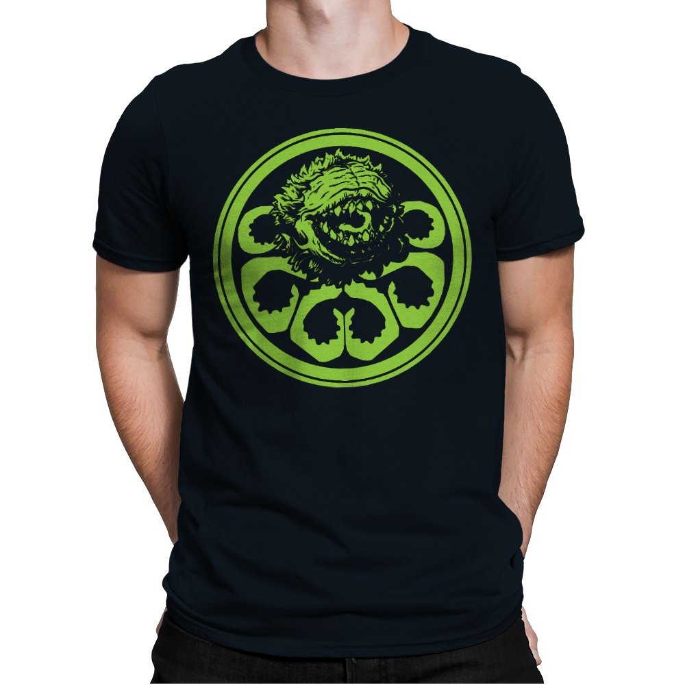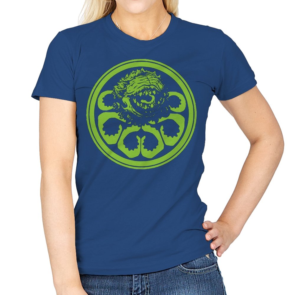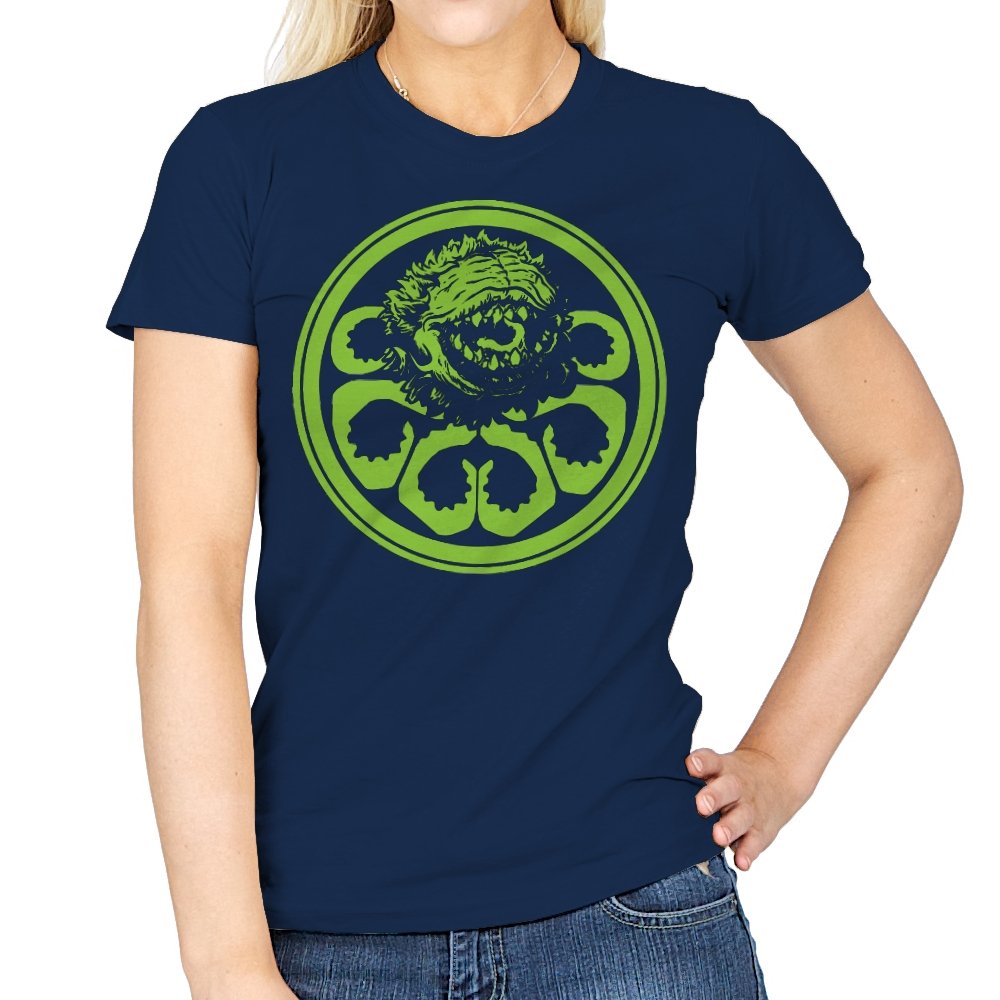 Hail, Audrey II turns a cult stage and screen menace into a lush emblem. The snarling plant head sits at the center of a circular crest, teeth bared and petals curling like a crown. The outer ring features repeating seedling shapes that hint at growth, hunger, and a plan that did not stop at the flower shop. The monochrome green palette gives it the feel of a botanical sigil rather than a straight character portrait.