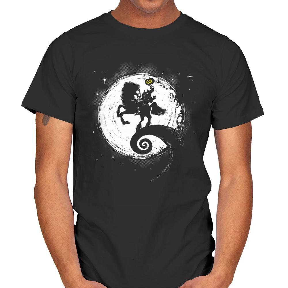 This design pulls a familiar moonlit silhouette into something sharper and more graphic. A headless rider charges across a curling hill, pumpkin held high against an oversized glowing moon. The stark black-and-white contrast gives it a cut-paper feel, while the small pop of color keeps it playful rather than grim. It reads instantly if you know, and still looks striking if you just like spooky folklore visuals.