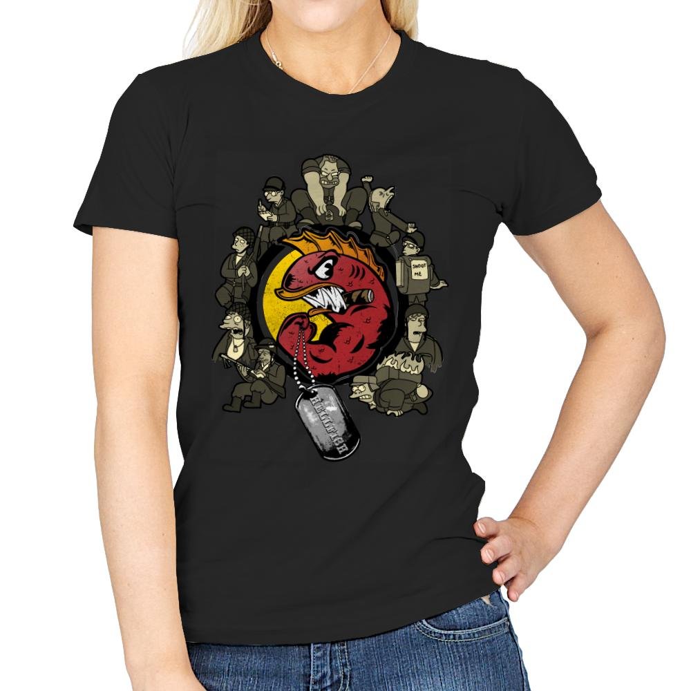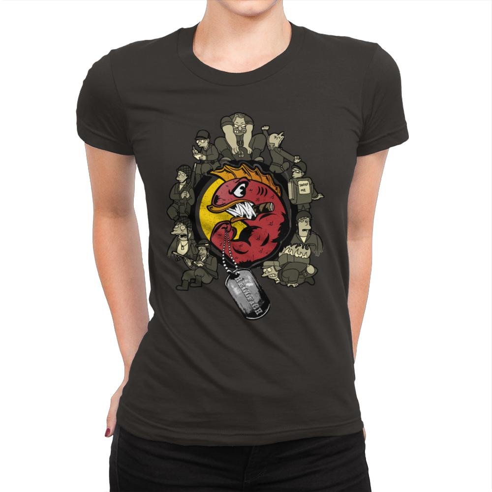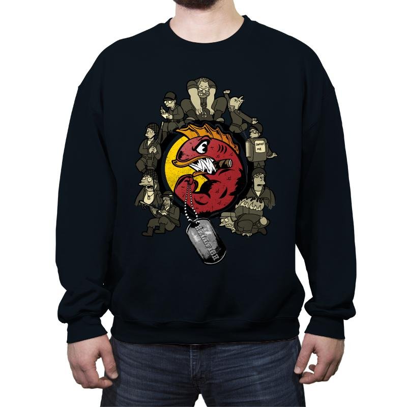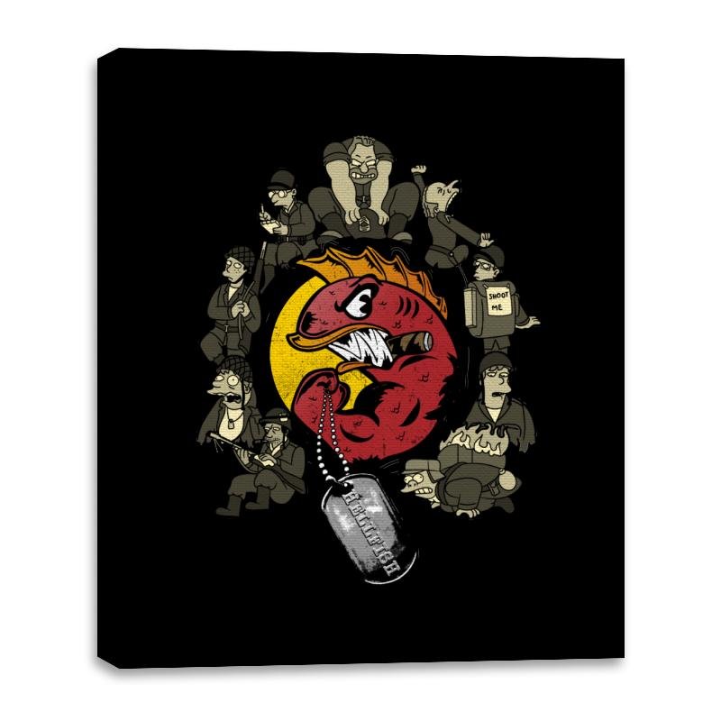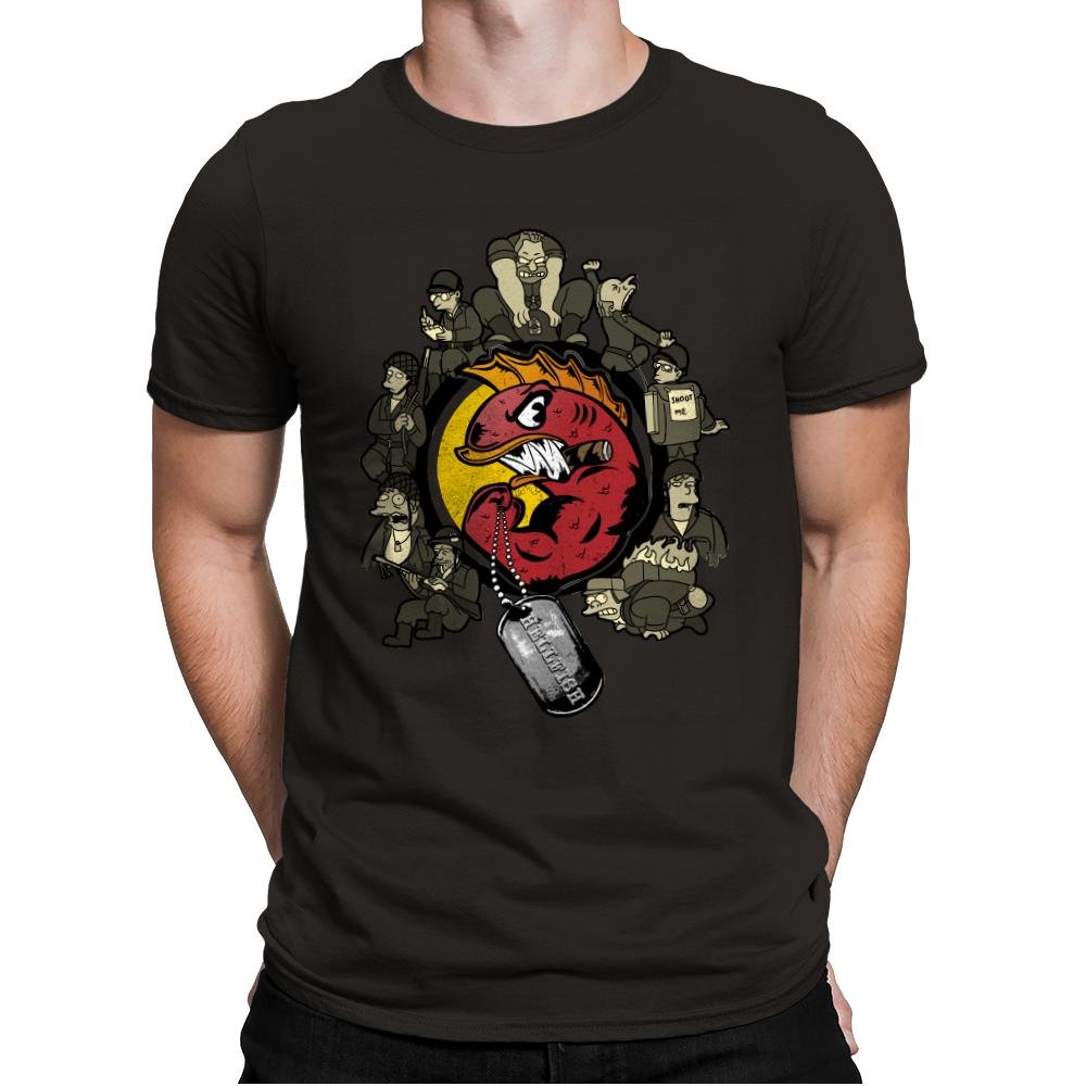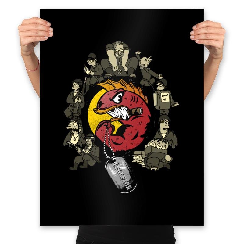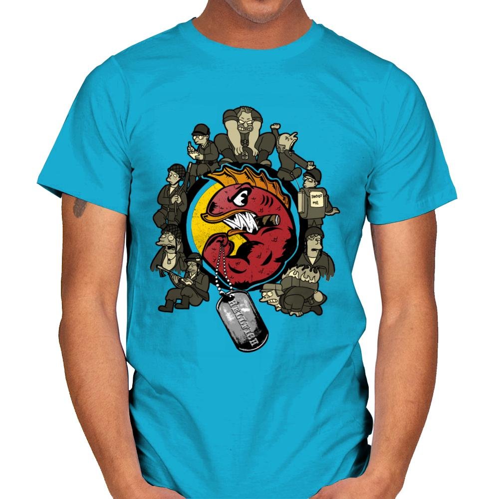 This design pulls a certain animated war story into a tribute poster for a rowdy old squad. A snarling red fish flexes front and center with dog tags hanging beneath, while a ring of supporting characters crouch, smoke, gripe, and pose around the emblem. The palette stays muted except for the hot red and yellow circle, giving the image a faded military patch vibe. Fans of televised family history and petty rivalries will recognize the reference without needing any names.