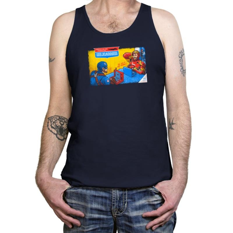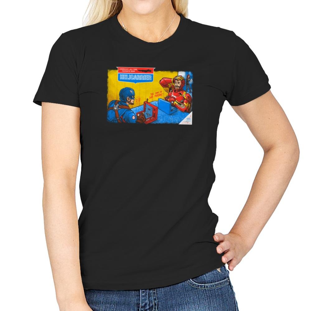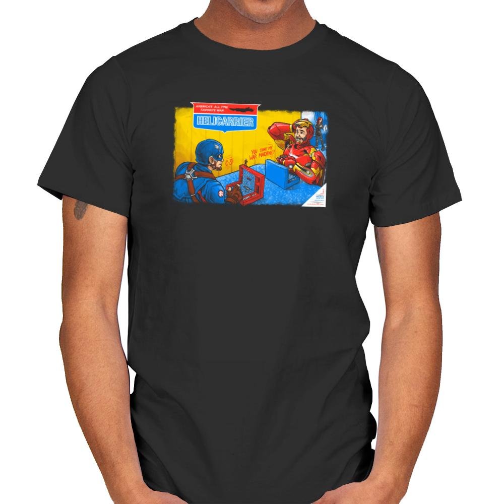 This design reimagines a classic naval board game box through a superhero rivalry lens. Two armored figures sit across from each other, focused and competitive, with control panels replacing plastic pegs and ships. The illustration style mirrors mid century game packaging, complete with bold colors and earnest seriousness that makes the crossover work. Fans who know both sides will catch the layered joke immediately.