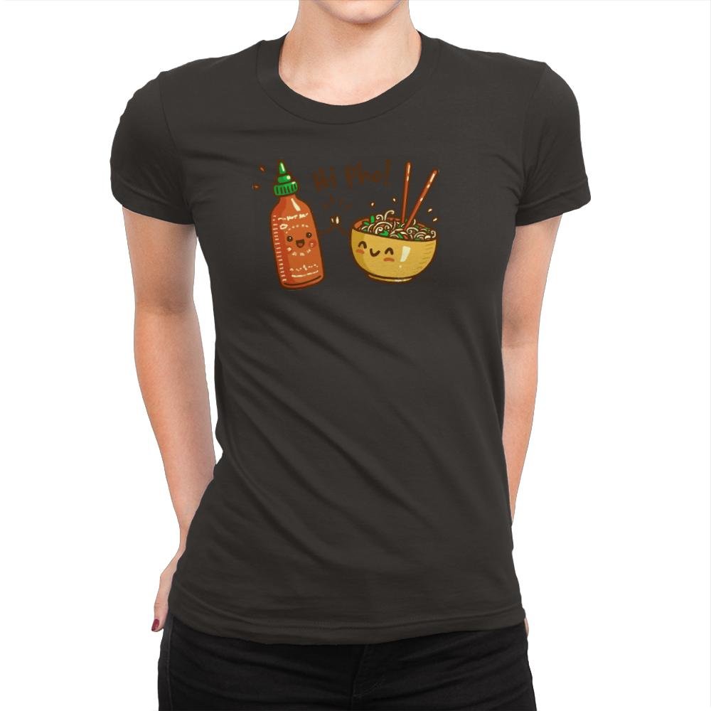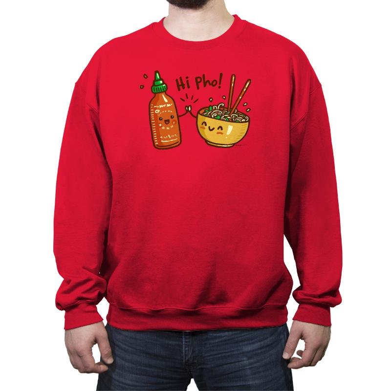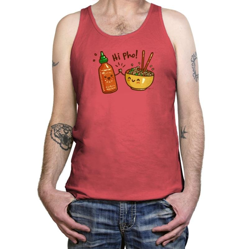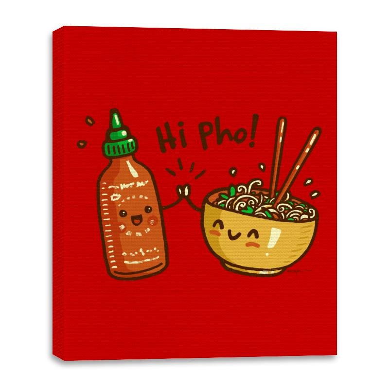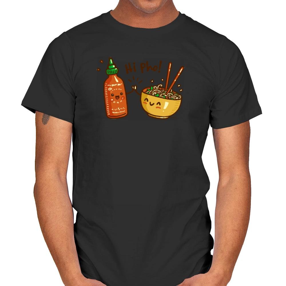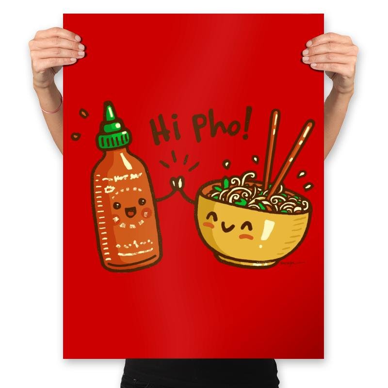 This design turns a bowl of pho and a bottle of hot sauce into cheerful characters greeting each other like old friends. The text pun seals the joke since anyone who has ever eaten pho knows the sauce always joins the party. The illustration style leans cute and expressive, with tiny arms, shining eyes, and noodles dangling around chopsticks. The red backdrop makes the whole scene feel warm and spicy.