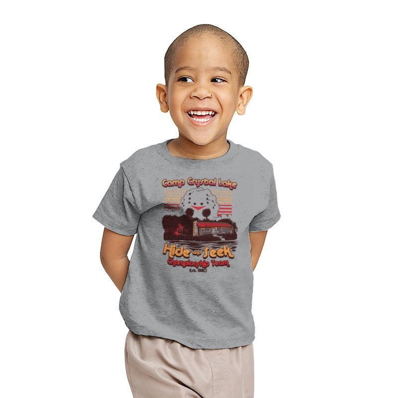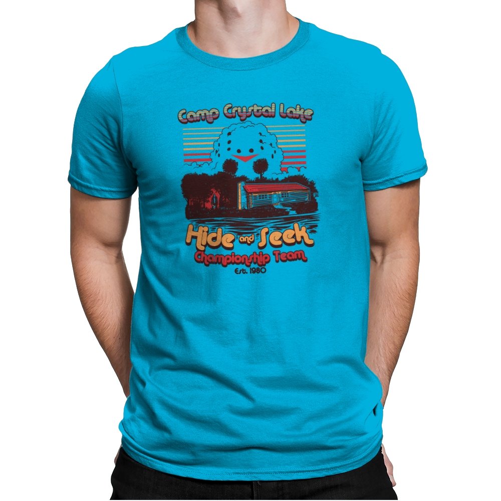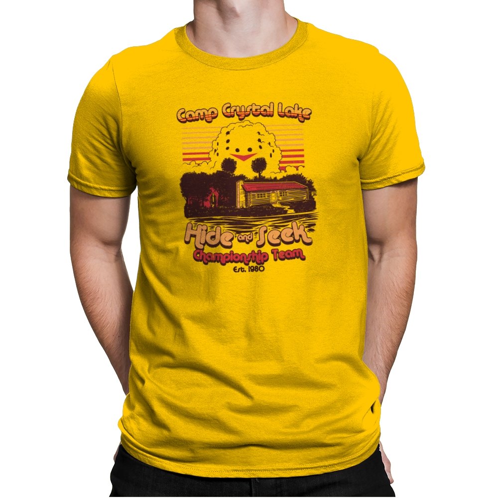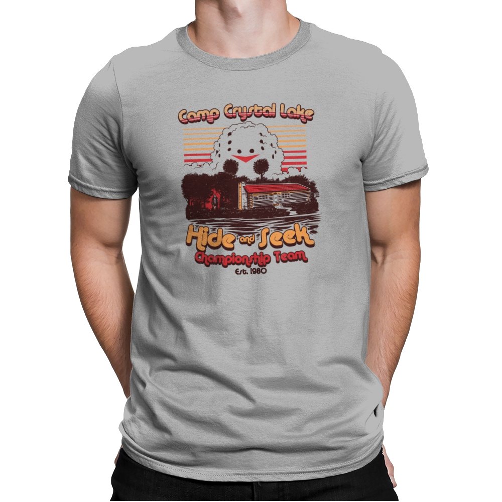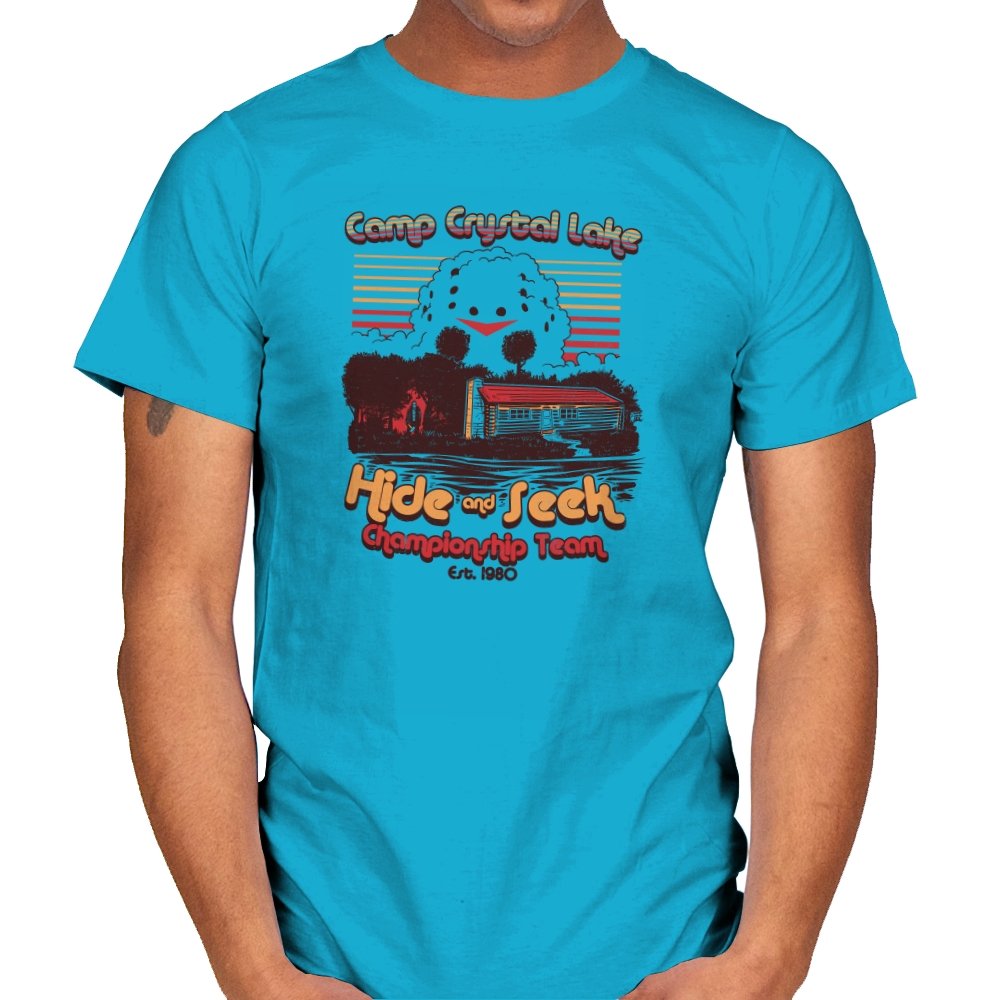 This design looks like a cheerful summer camp souvenir at first glance. Warm retro colors frame a quiet lakeside cabin, pine trees, and a smiling mascot that feels just a little too calm. The joke lands when you read the title, turning innocent camp nostalgia into something much darker without spelling it out. Fans who know the reference will catch the irony immediately.
