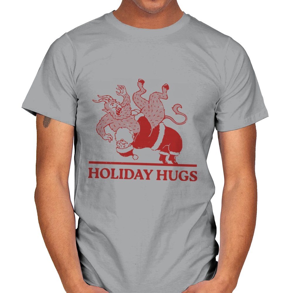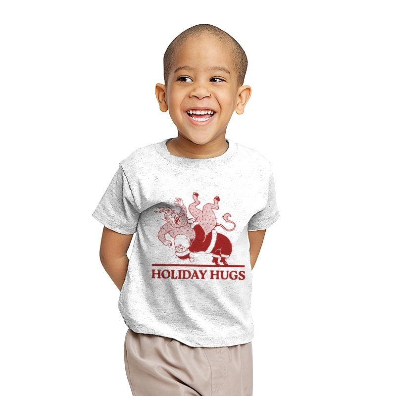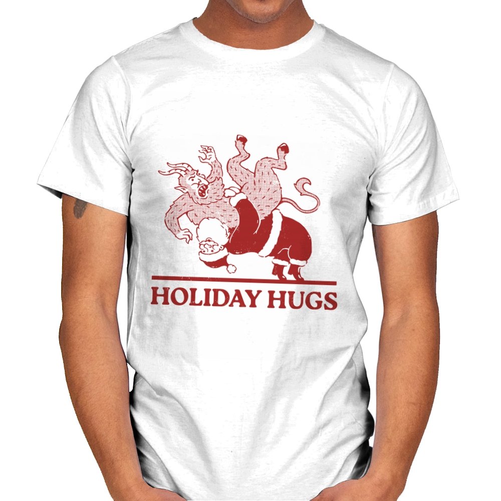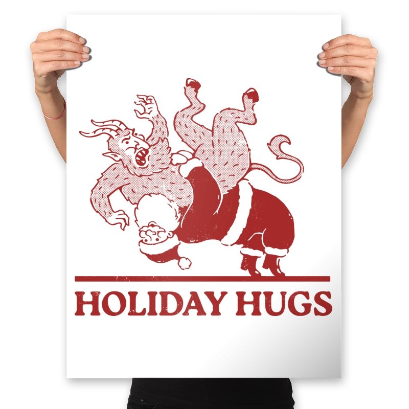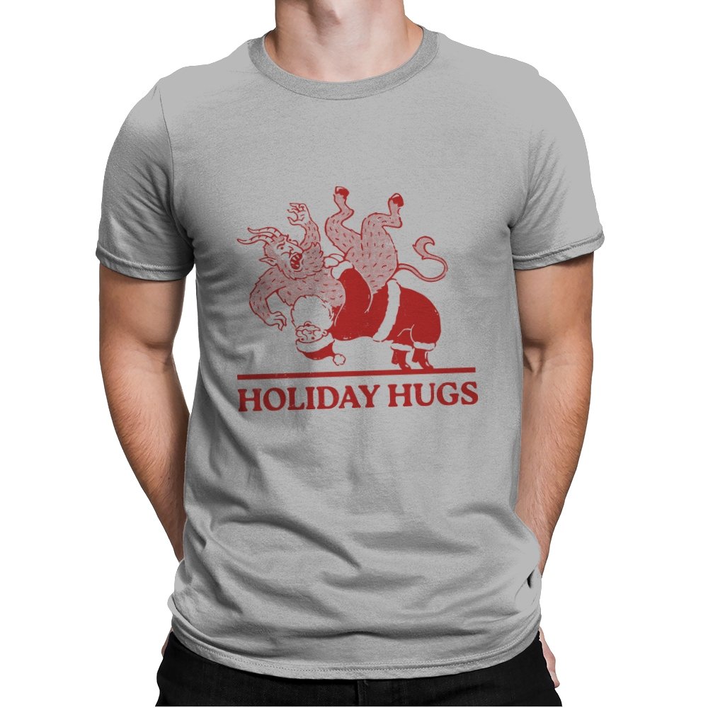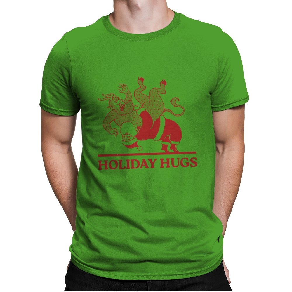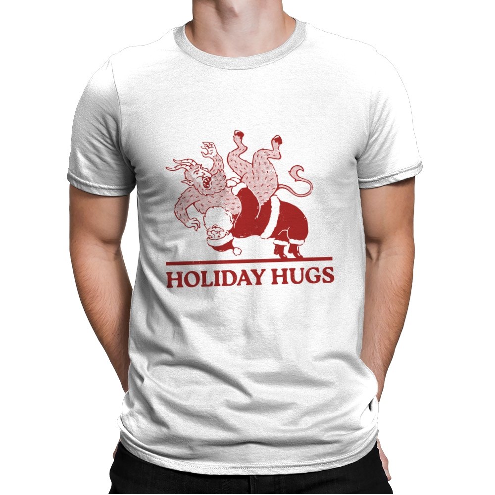 This design flips a familiar seasonal image into something far less gentle. A classic gift giver is mid-toss, flinging a snarling creature like an unruly package, rendered in a rough, vintage illustration style. The limited color palette and distressed lines make it feel like an old holiday card that never should have been printed. If you know the story behind the creature, the joke lands somewhere between menace and nostalgia.