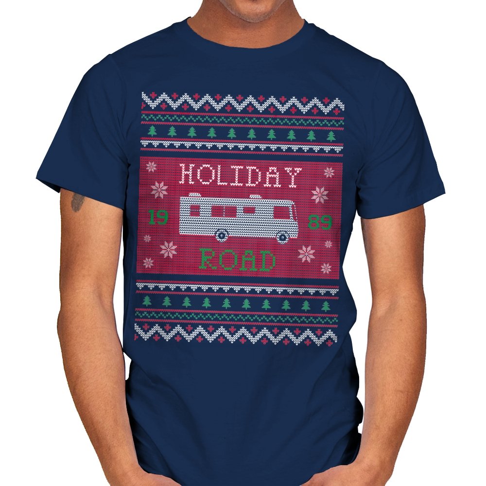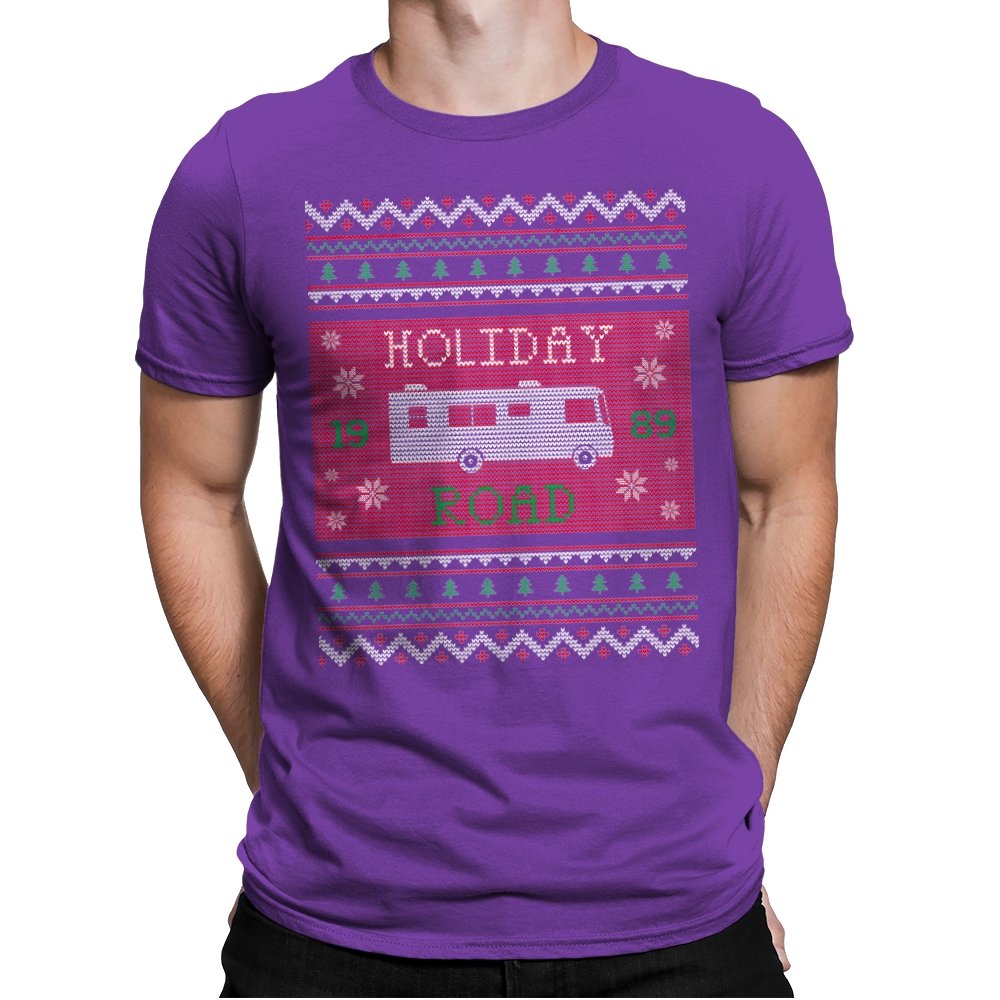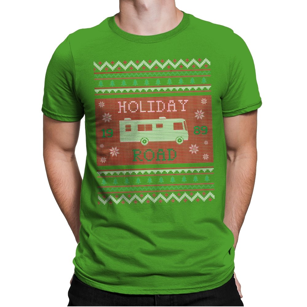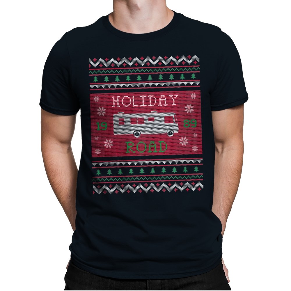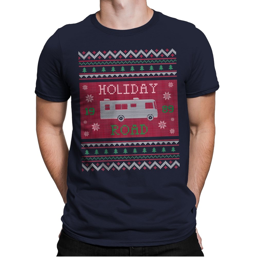 This design turns a classic family road trip into a knit-style holiday pattern. The blocky layout, winter icons, and repeating borders frame a boxy wagon cruising straight through festive chaos, with the year baked in for those who know. It looks like a sweater your relatives would question, then slowly understand. The humor lives in the format as much as the reference.