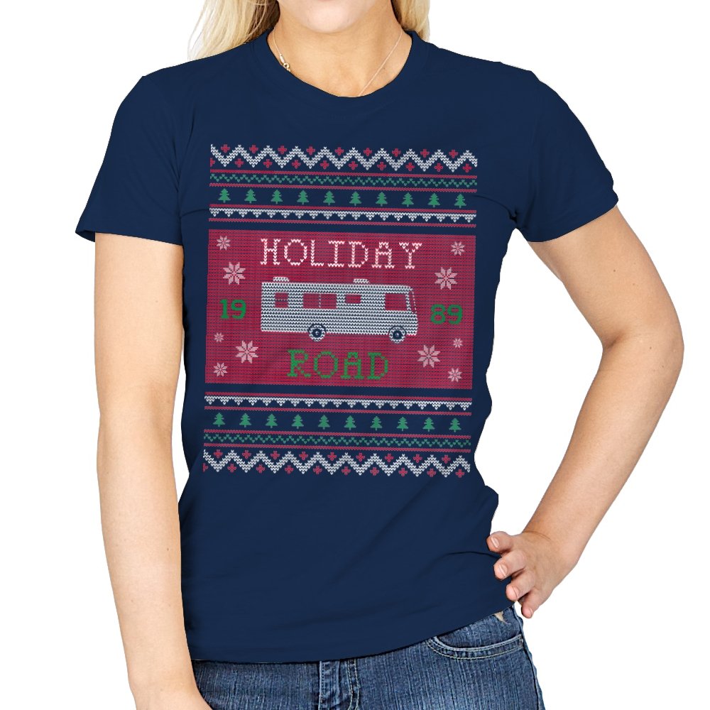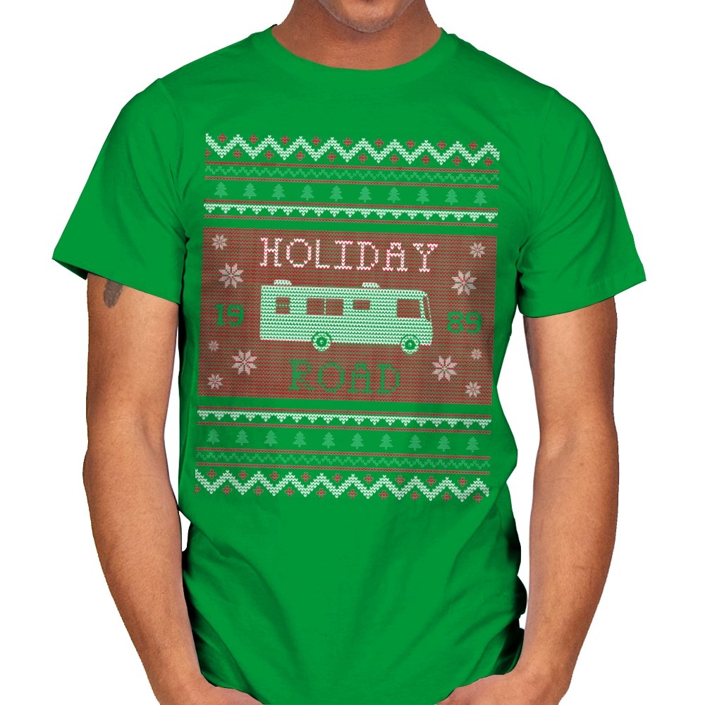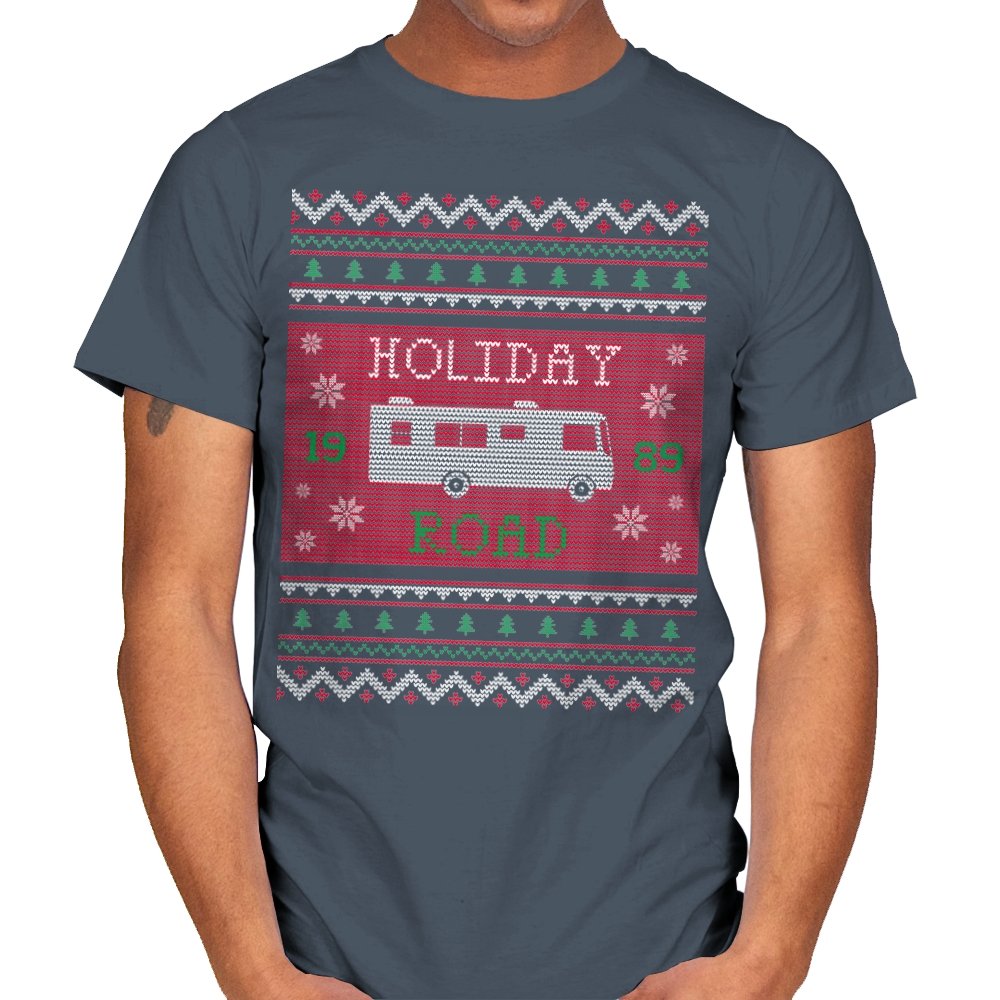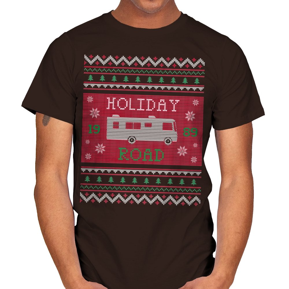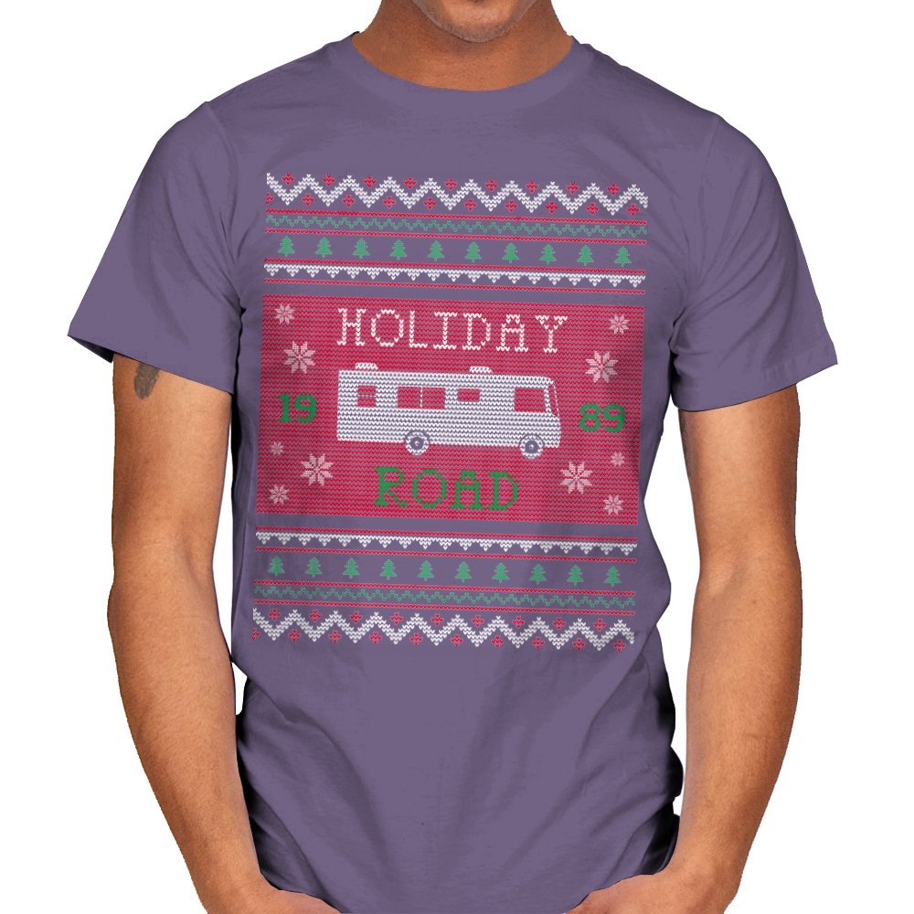This design turns a classic family road trip into a knit-style holiday pattern. The blocky layout, winter icons, and repeating borders frame a boxy wagon cruising straight through festive chaos, with the year baked in for those who know. It looks like a sweater your relatives would question, then slowly understand. The humor lives in the format as much as the reference.