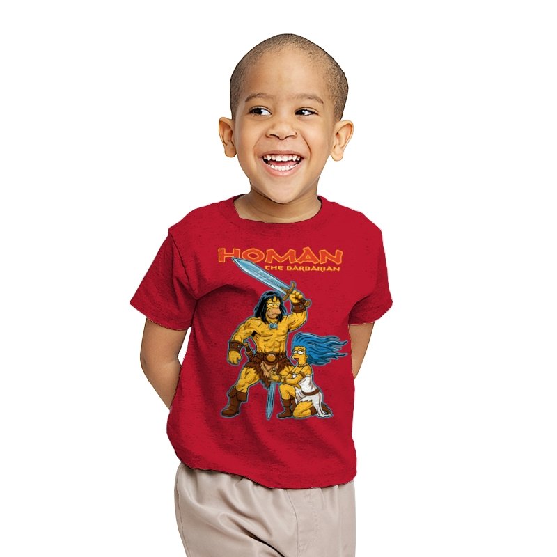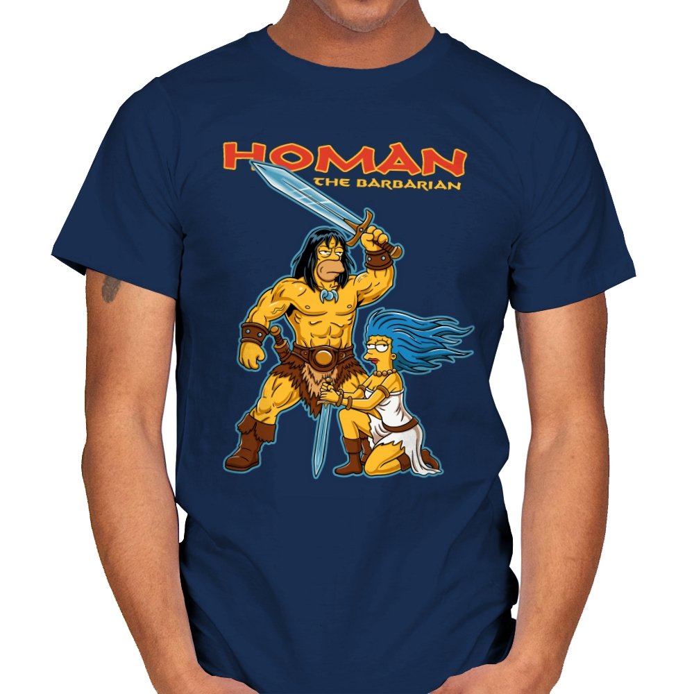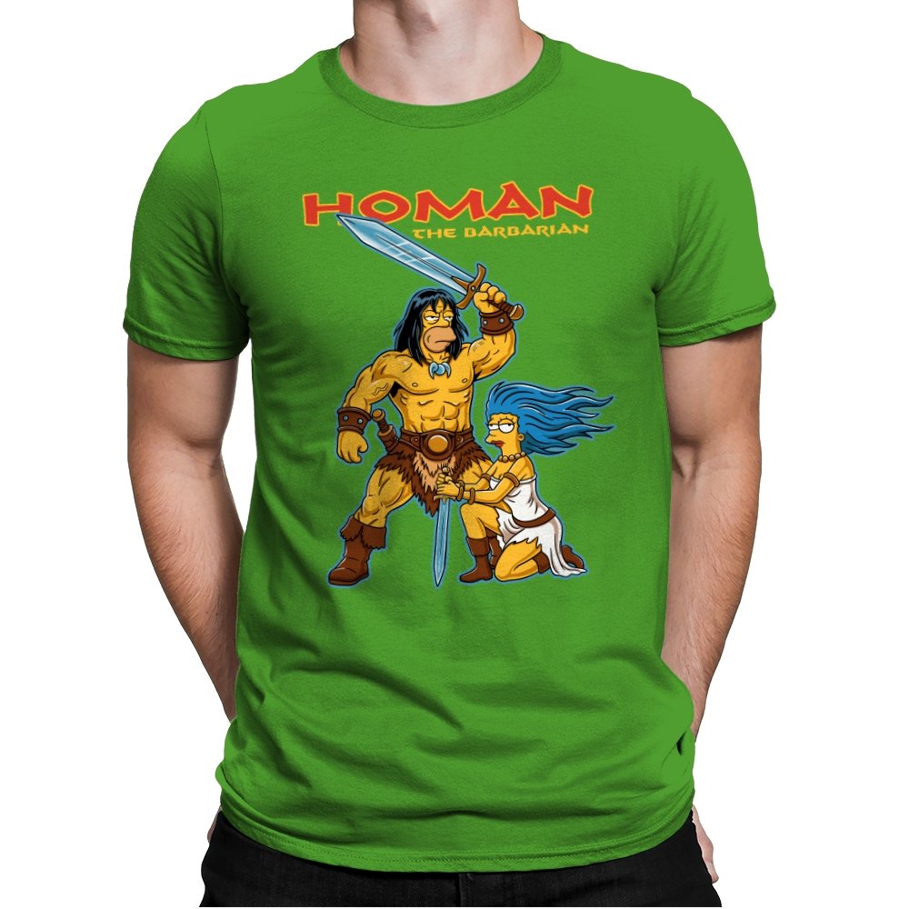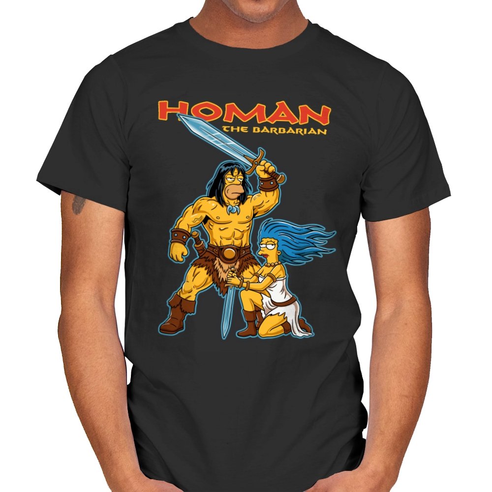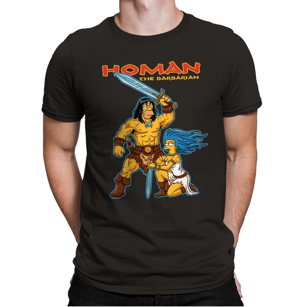 This design drops a familiar animated family dynamic into a classic sword-and-sorcery fantasy scene. A hulking barbarian raises his blade with absolute seriousness, while a blue-haired companion kneels beside him, clearly questioning every life choice that led here. The exaggerated muscles, dramatic pose, and bright cartoon colors sell the parody without needing explanation. If you know both worlds, the contrast is the entire point.