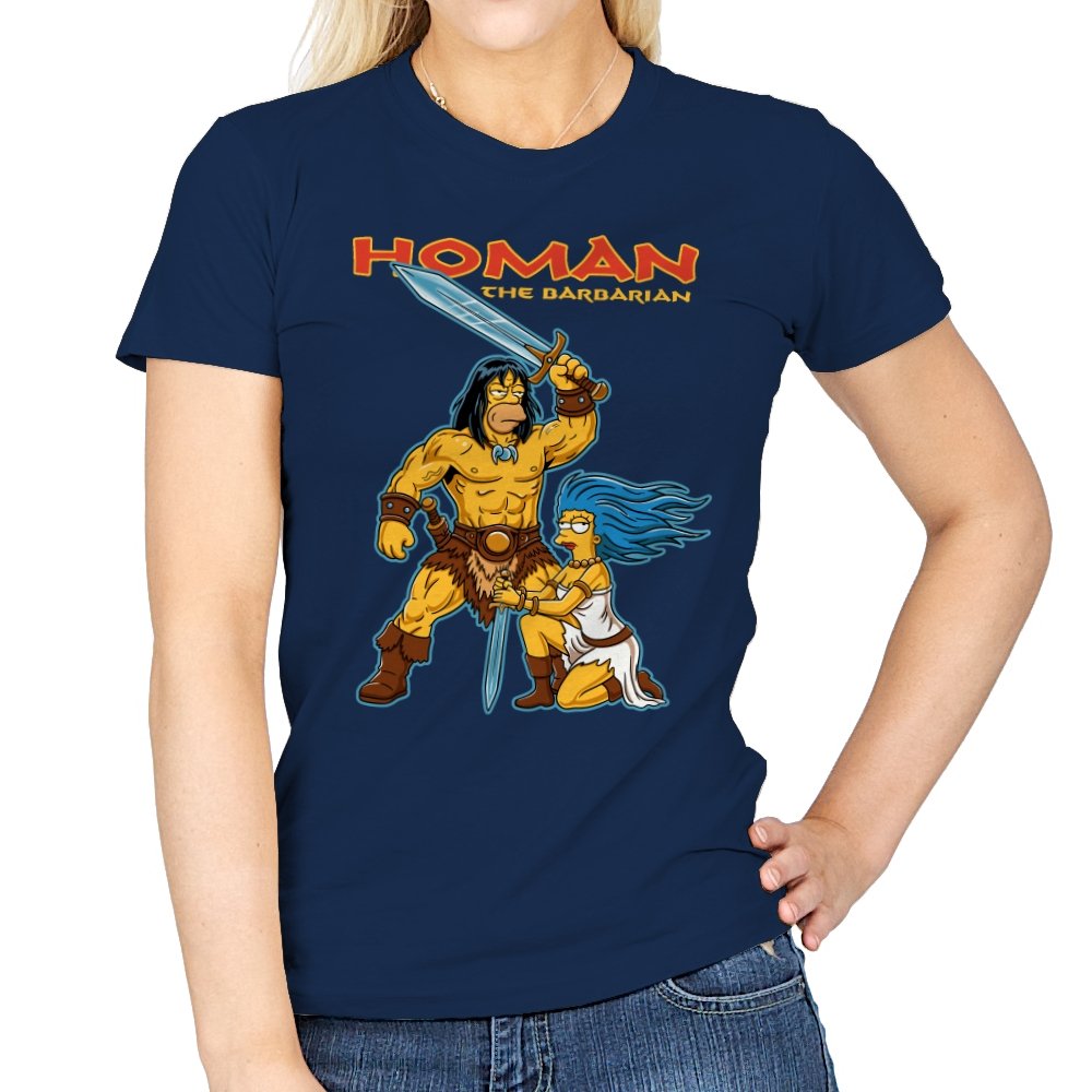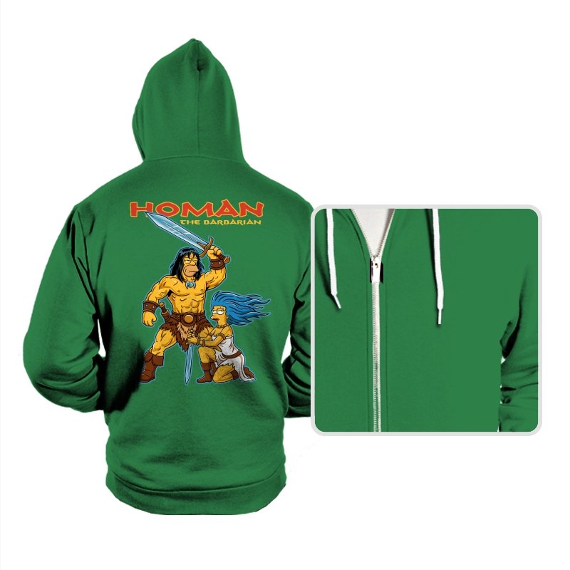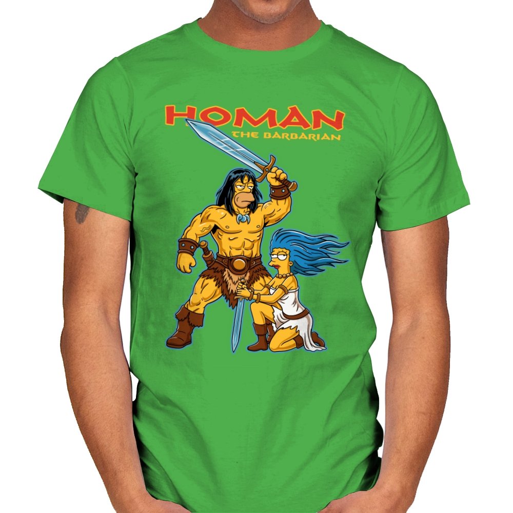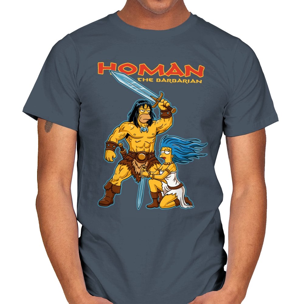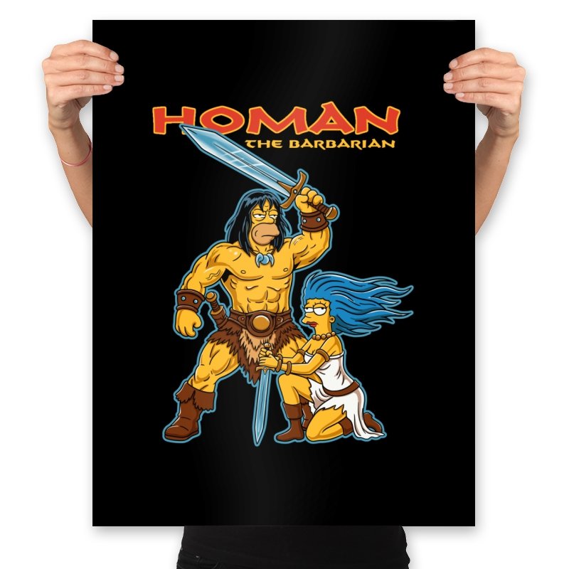 This design drops a familiar animated family dynamic into a classic sword-and-sorcery fantasy scene. A hulking barbarian raises his blade with absolute seriousness, while a blue-haired companion kneels beside him, clearly questioning every life choice that led here. The exaggerated muscles, dramatic pose, and bright cartoon colors sell the parody without needing explanation. If you know both worlds, the contrast is the entire point.