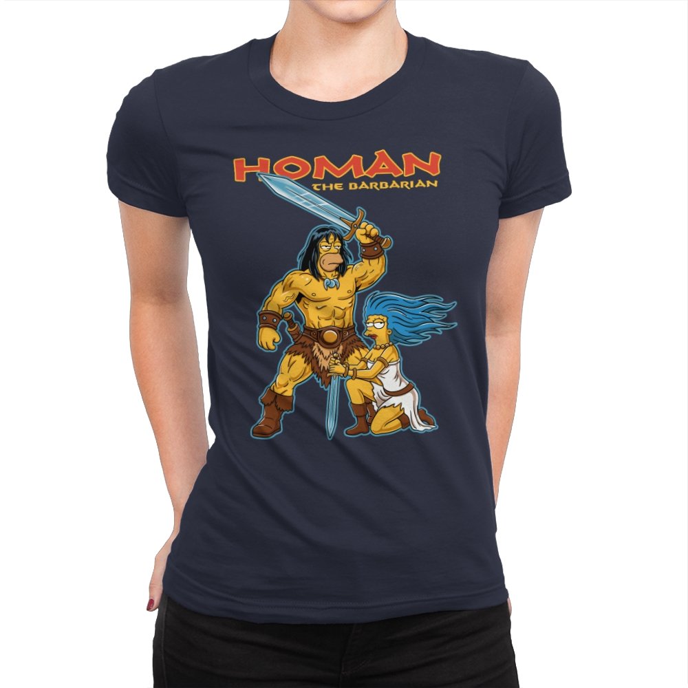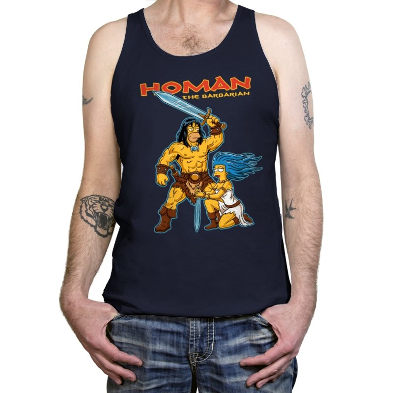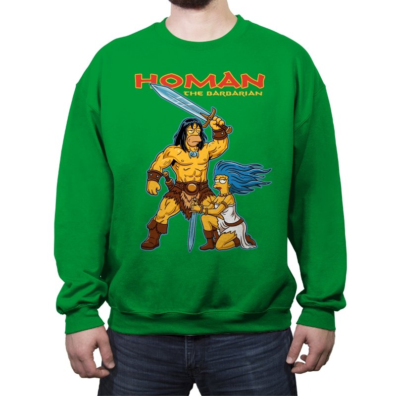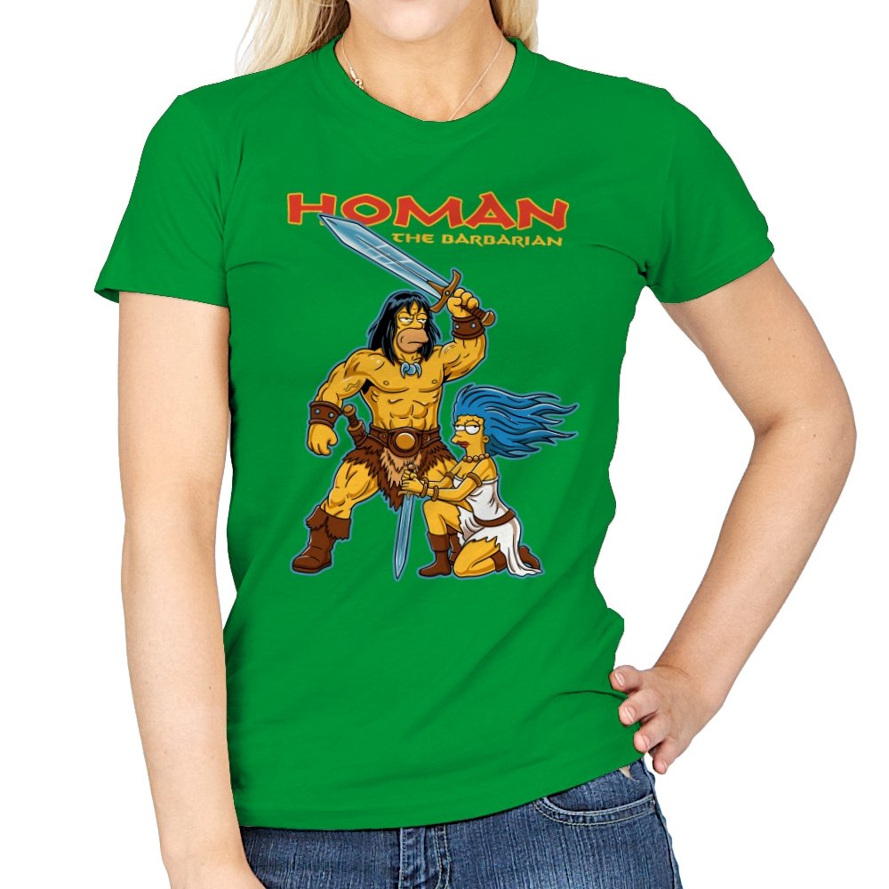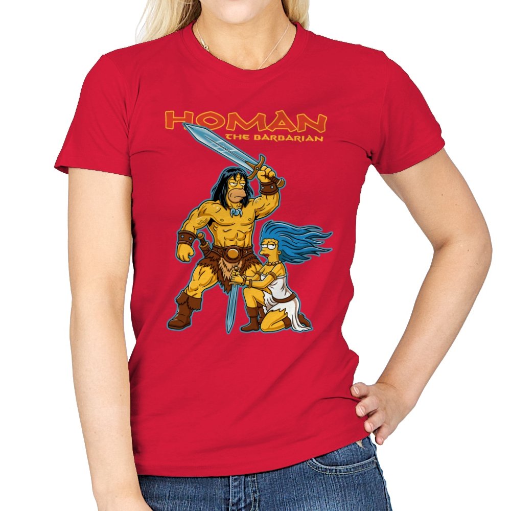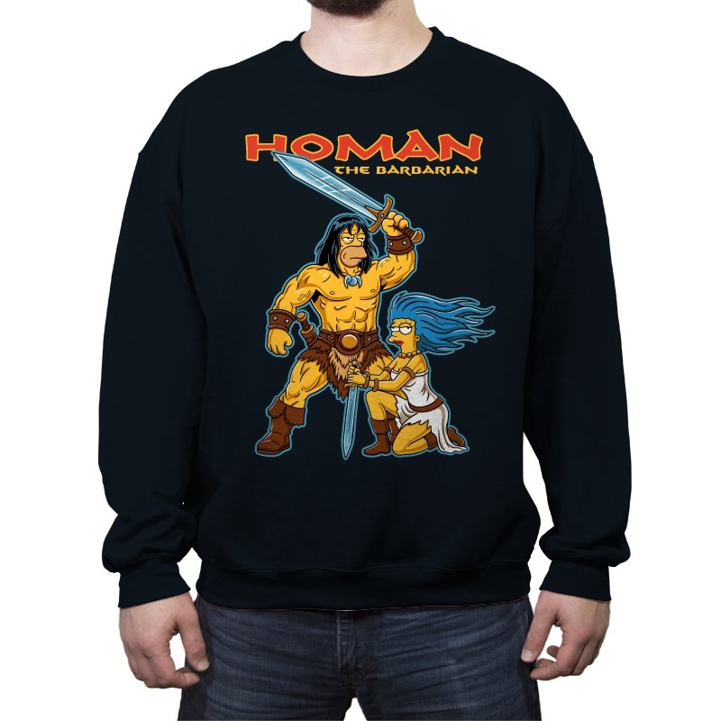 This design drops a familiar animated family dynamic into a classic sword-and-sorcery fantasy scene. A hulking barbarian raises his blade with absolute seriousness, while a blue-haired companion kneels beside him, clearly questioning every life choice that led here. The exaggerated muscles, dramatic pose, and bright cartoon colors sell the parody without needing explanation. If you know both worlds, the contrast is the entire point.