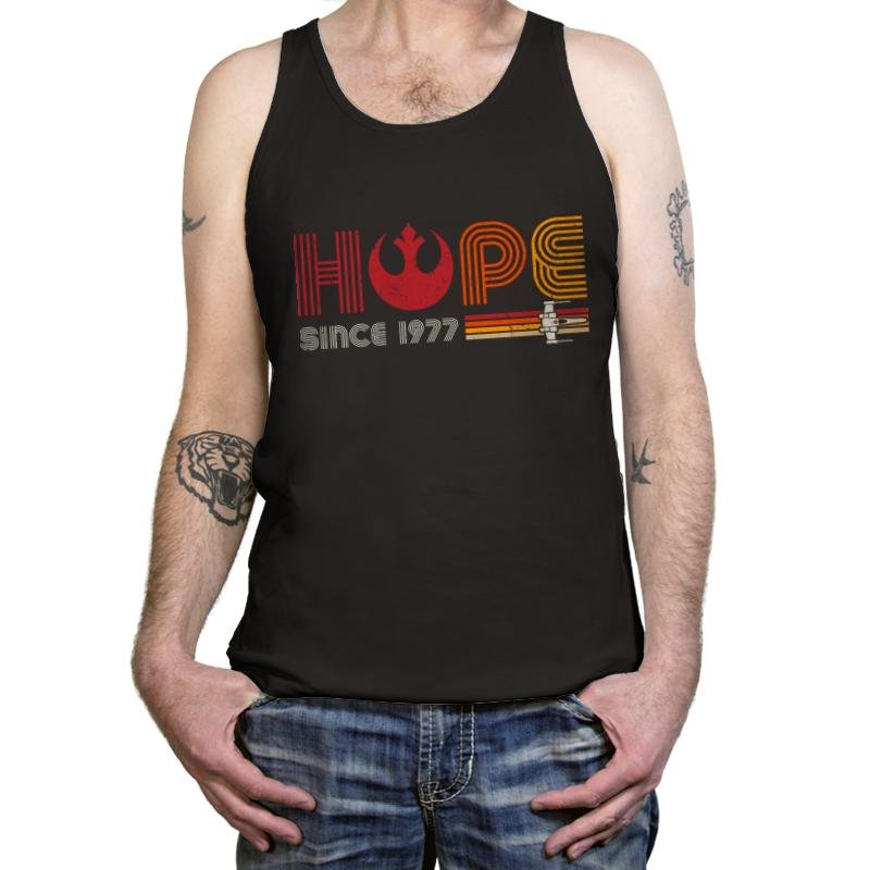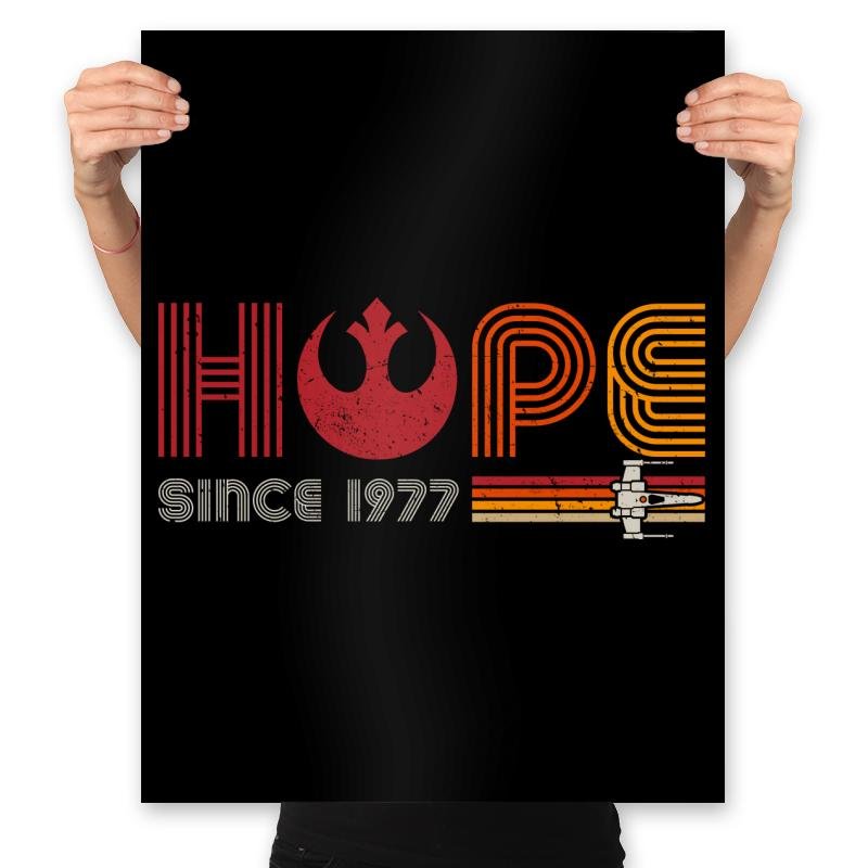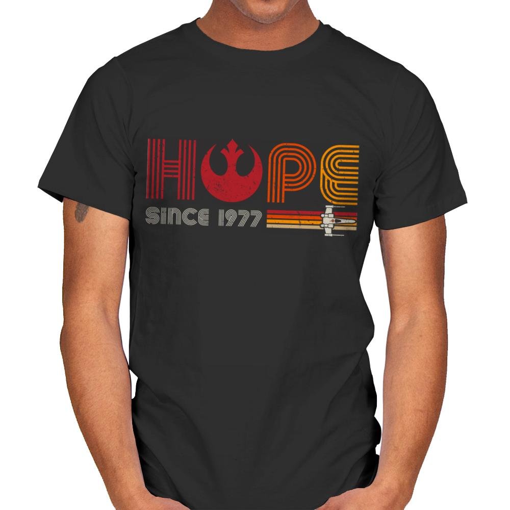 This design blends iconic Star Wars imagery with a retro, vibrant style, showcasing the word “HOPE” alongside the famous Rebel Alliance symbol and an X-wing fighter. The design is a tribute to the beginning of an era, starting in 1977, that sparked the imaginations of millions. The bold typography and striking colors represent the timeless hope that the Star Wars saga embodies, with a nod to the classic aesthetic of the original trilogy. Whether you’re a Star Wars die-hard or just love a good retro throwback, this design channels optimism with a dose of sci-fi nostalgia.