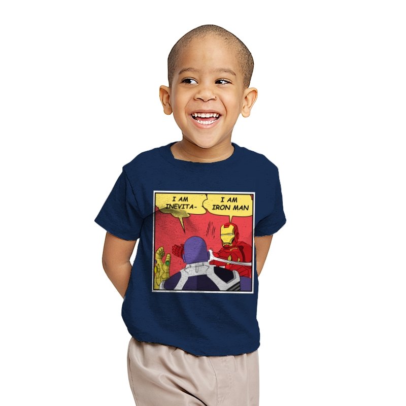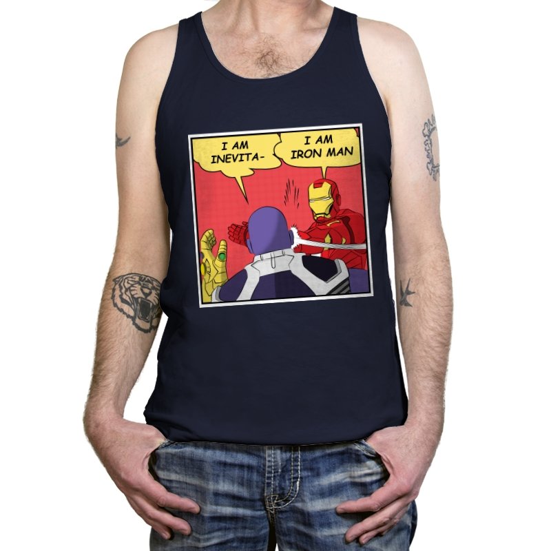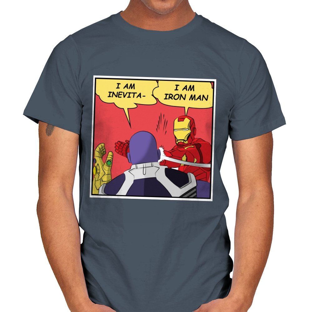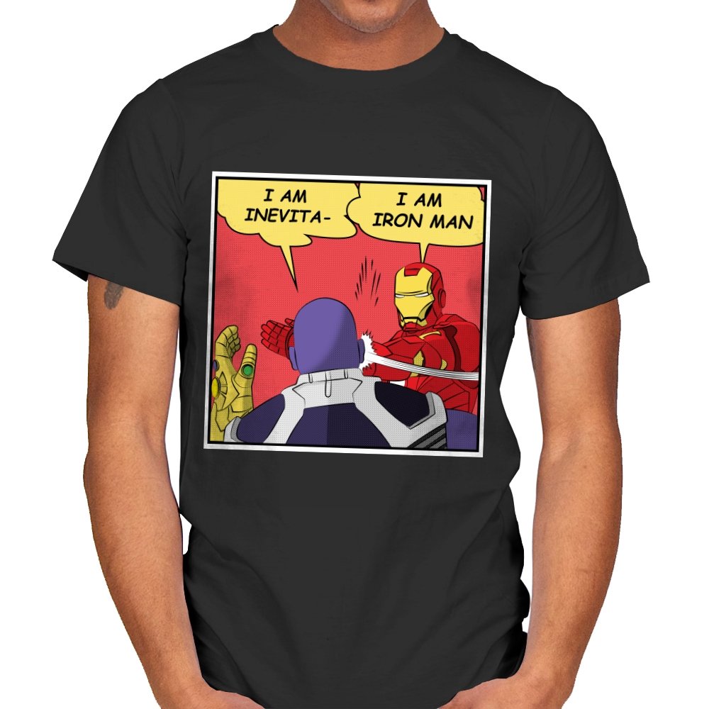 A comic style panel freezes at the exact moment an armored hero cuts off a hulking purple tyrant with a slap and a one liner. Speech bubbles collide, swapping a dramatic cosmic declaration for a much more grounded identity check. Fans already know the original scene, so the rewrite lands harder as a parody of final act seriousness. It is a visual reminder that sometimes the funniest punchline is a literal punch.