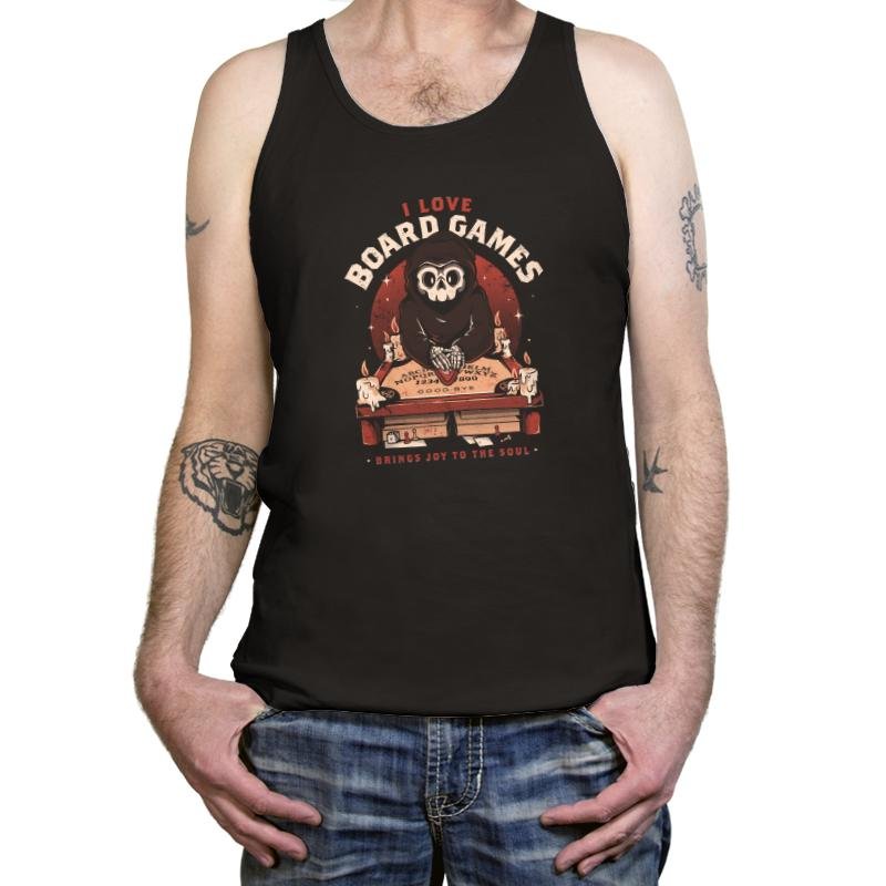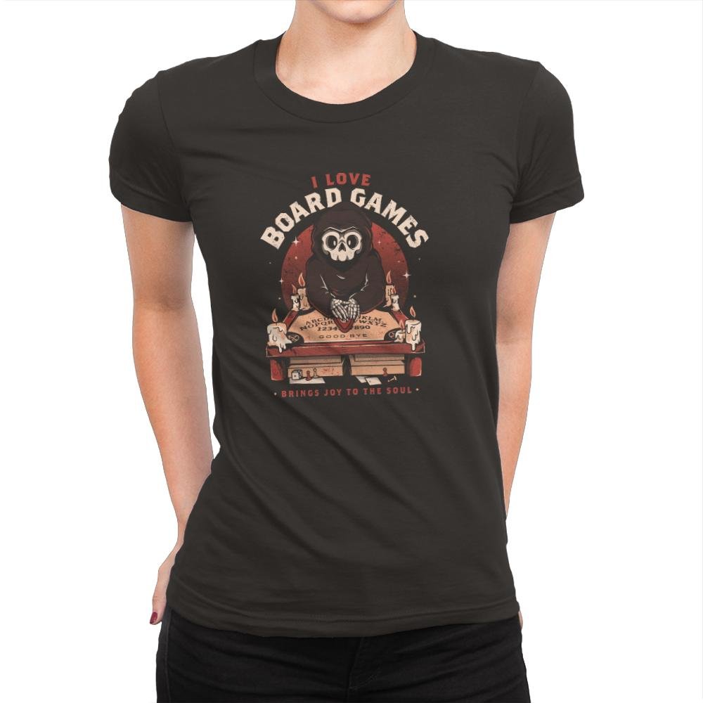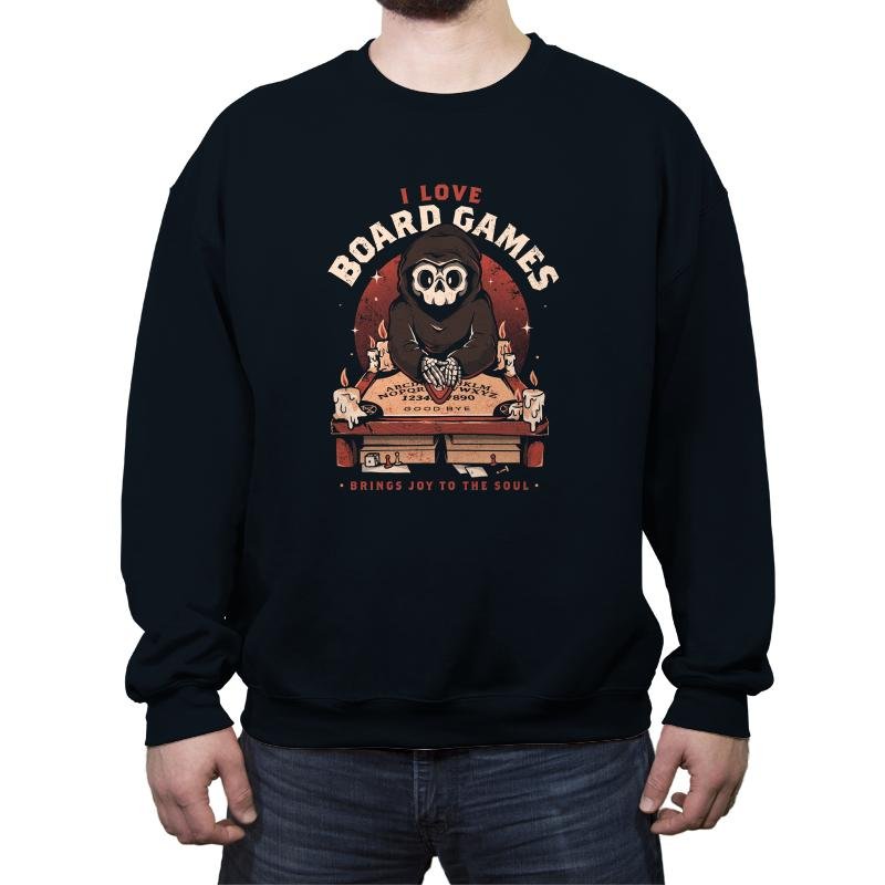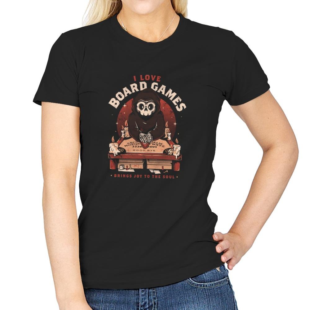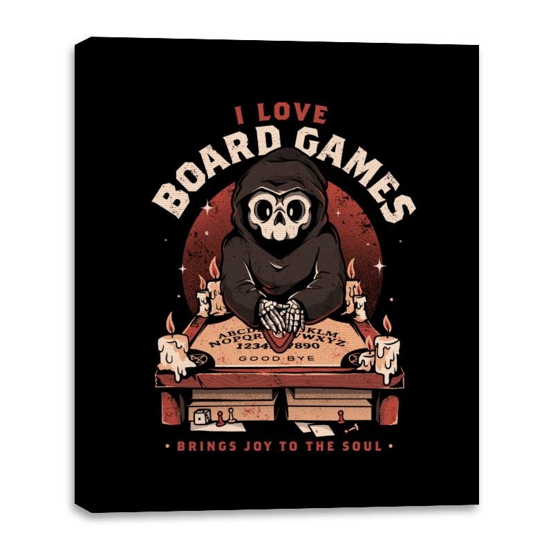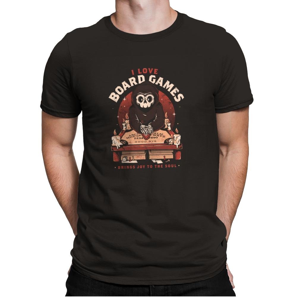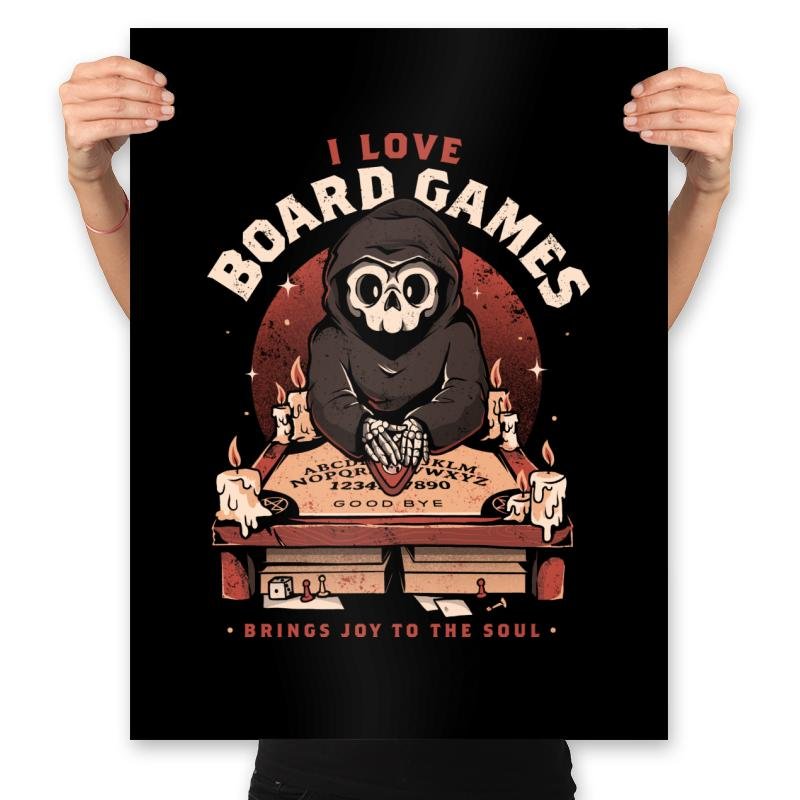 This design features a hooded skeletal figure behind a candlelit board, hands resting on a well-worn planchette. The joke lands in the contrast between ominous ritual visuals and the simple confession above it. Vintage textures, warm reds, and scattered wax drips give it the feel of an old game box found on a dusty shelf. If you know, you know, and the design never overexplains itself.