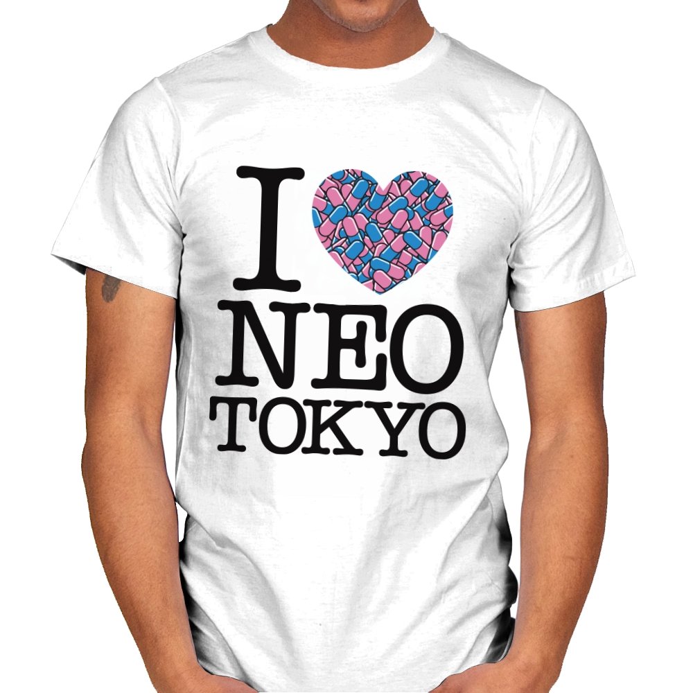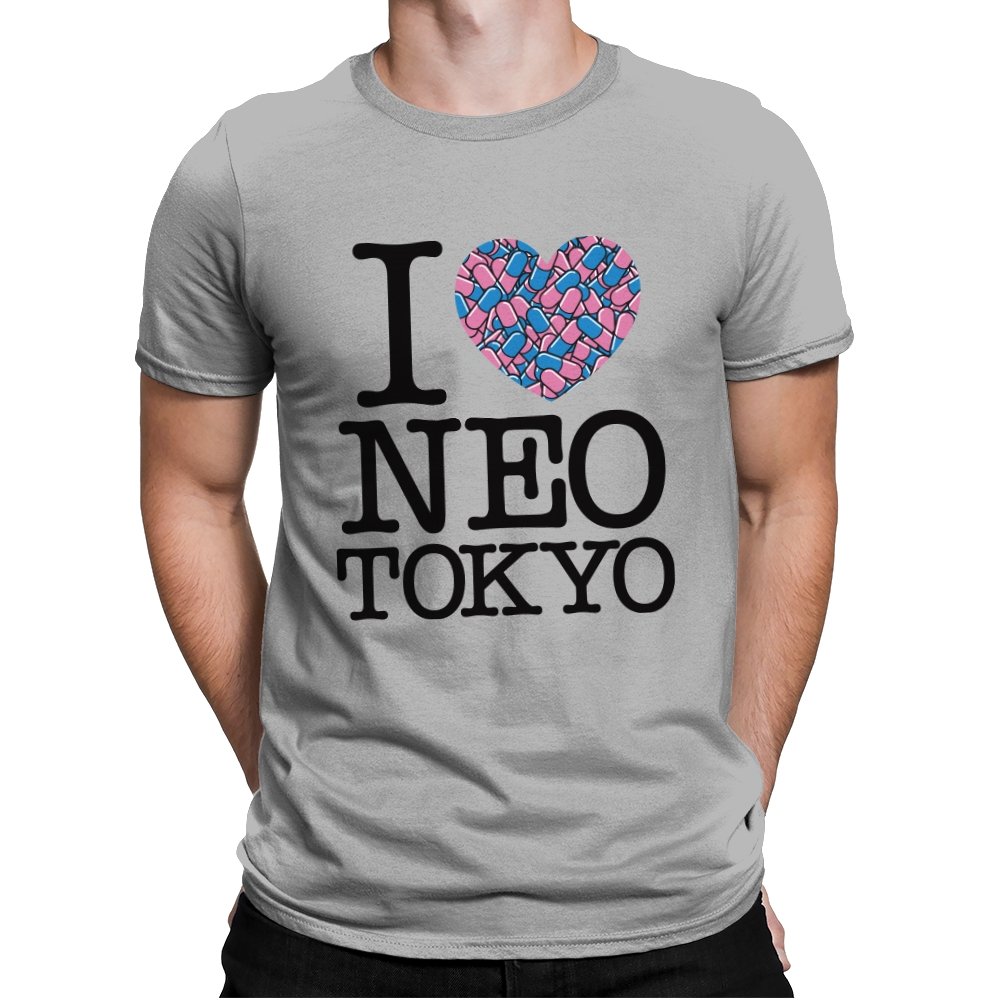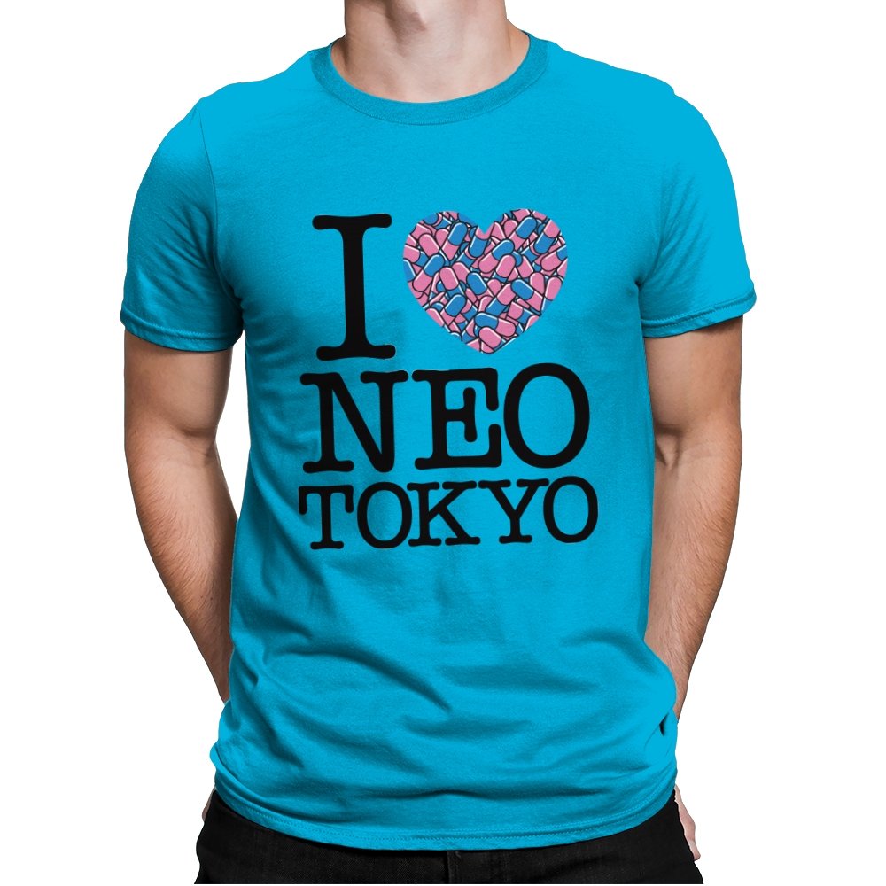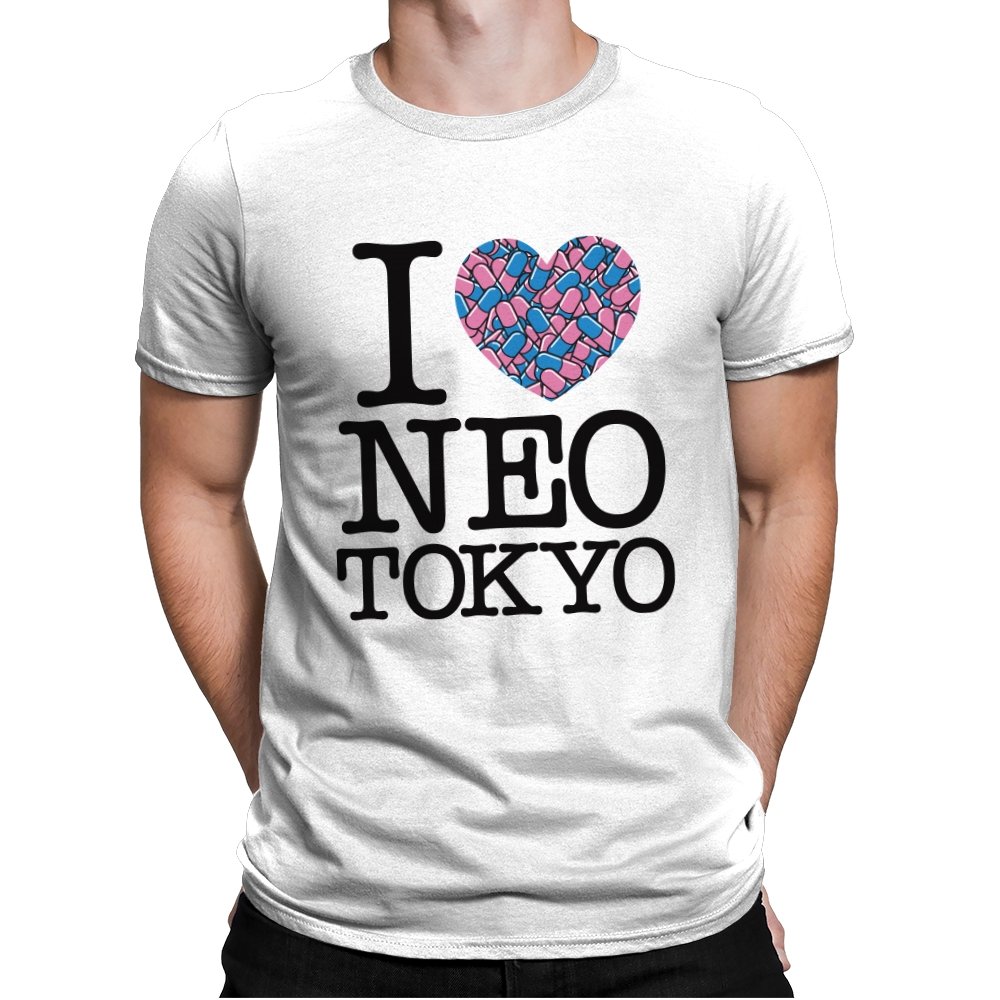This design takes the classic “I heart” format and rewires it for a certain cyberpunk metropolis. Instead of a plain red heart, the love is expressed through a swarm of pastel capsules that hint at the city’s favorite coping mechanism. Bold serif lettering spells out Neo Tokyo beneath, keeping the layout iconic and easy to read. Fans already know the pills, the bikes, and the chaos that made this city unforgettable.