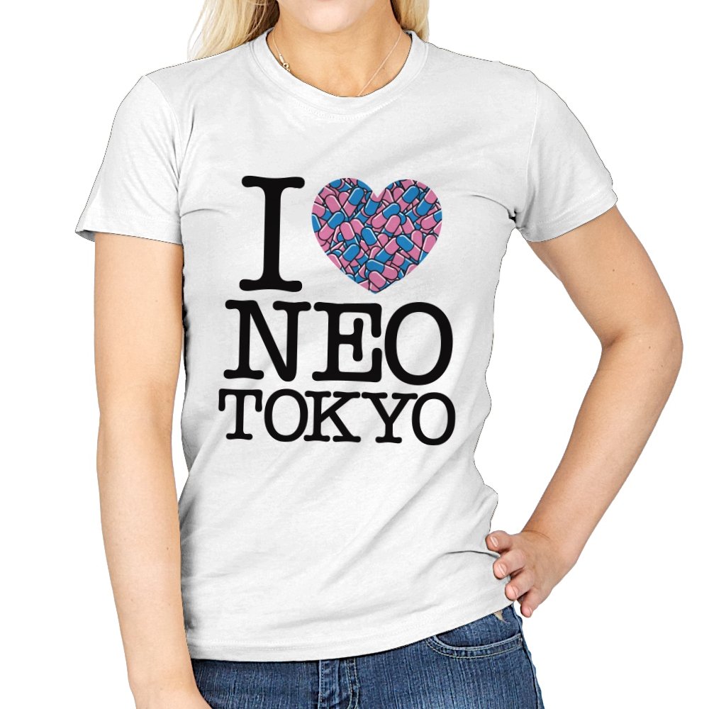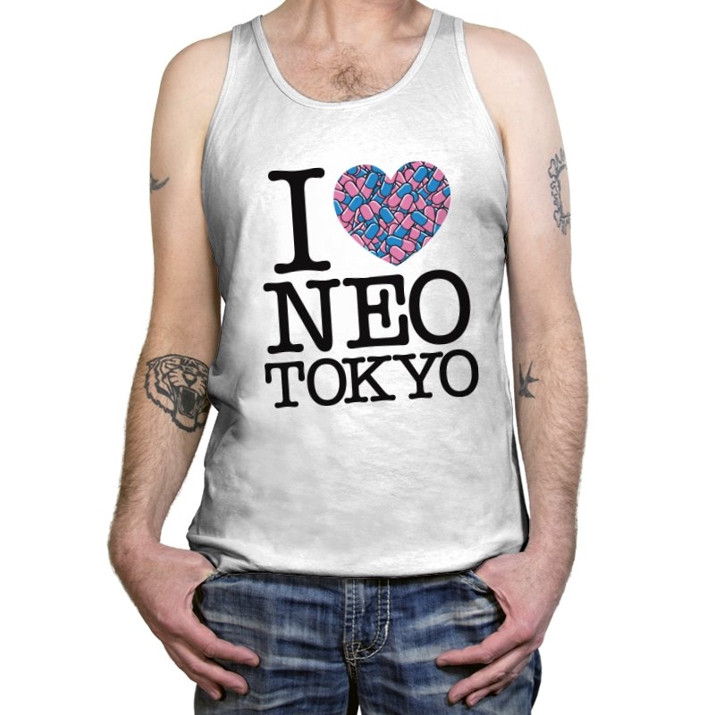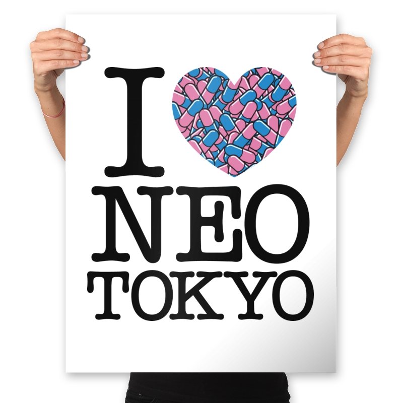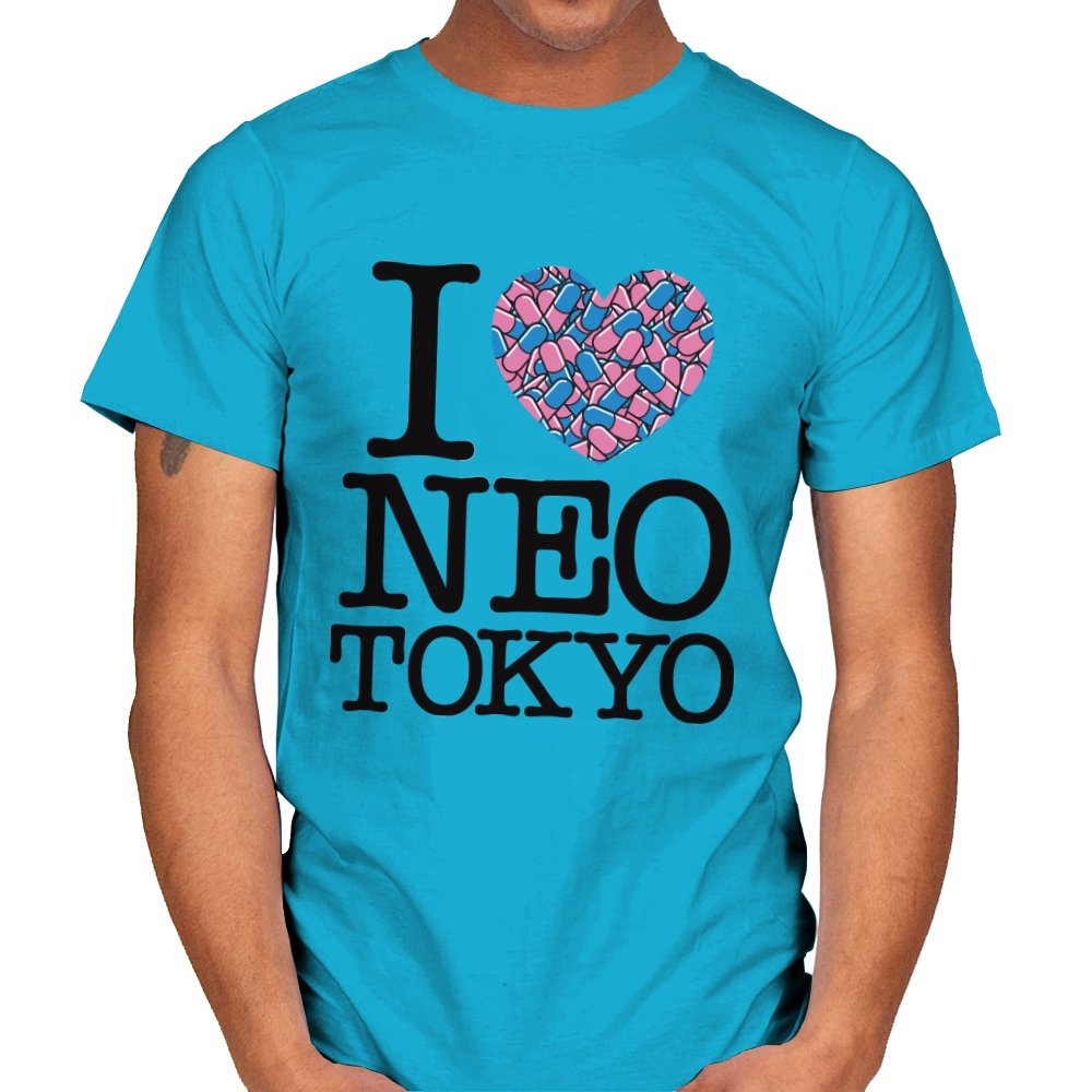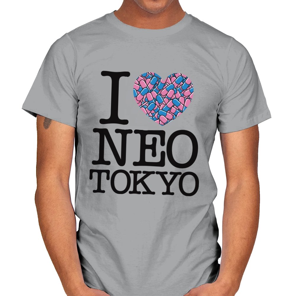 This design takes the classic “I heart” format and rewires it for a certain cyberpunk metropolis. Instead of a plain red heart, the love is expressed through a swarm of pastel capsules that hint at the city’s favorite coping mechanism. Bold serif lettering spells out Neo Tokyo beneath, keeping the layout iconic and easy to read. Fans already know the pills, the bikes, and the chaos that made this city unforgettable.