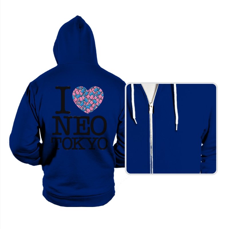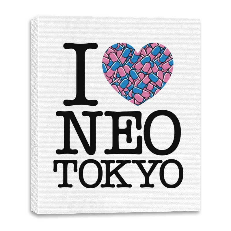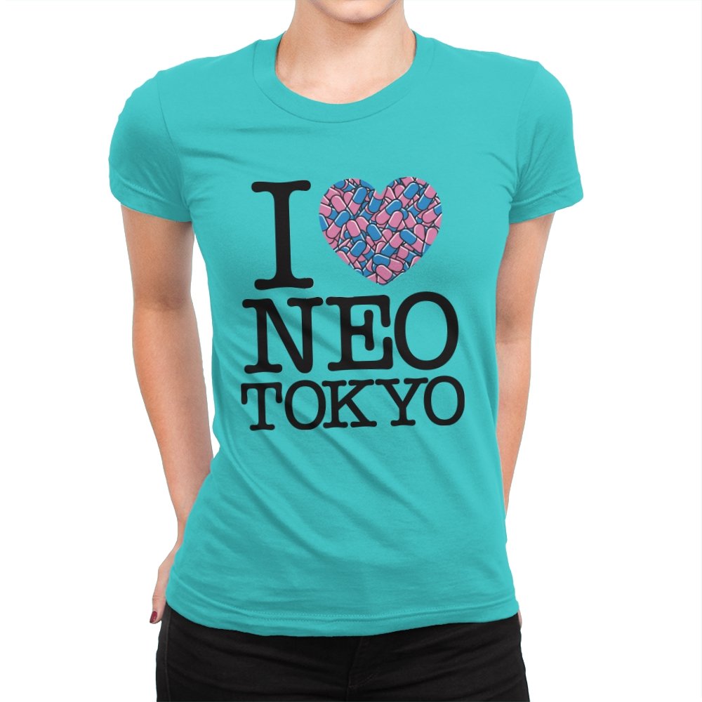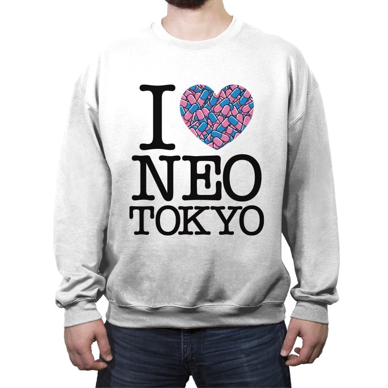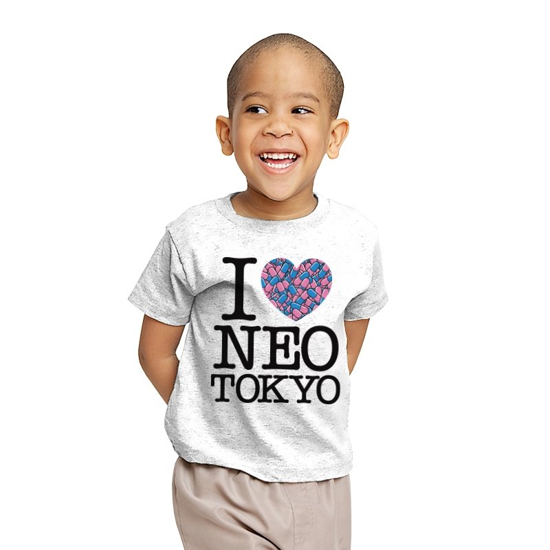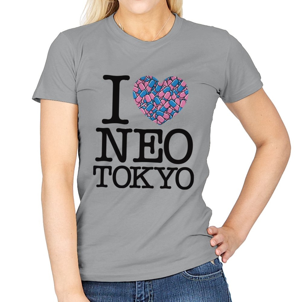 This design takes the classic “I heart” format and rewires it for a certain cyberpunk metropolis. Instead of a plain red heart, the love is expressed through a swarm of pastel capsules that hint at the city’s favorite coping mechanism. Bold serif lettering spells out Neo Tokyo beneath, keeping the layout iconic and easy to read. Fans already know the pills, the bikes, and the chaos that made this city unforgettable.