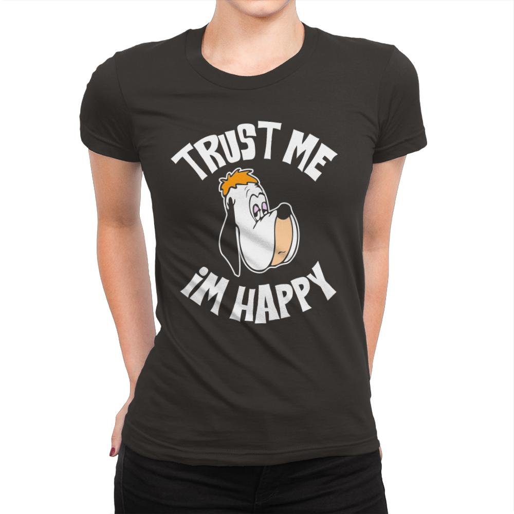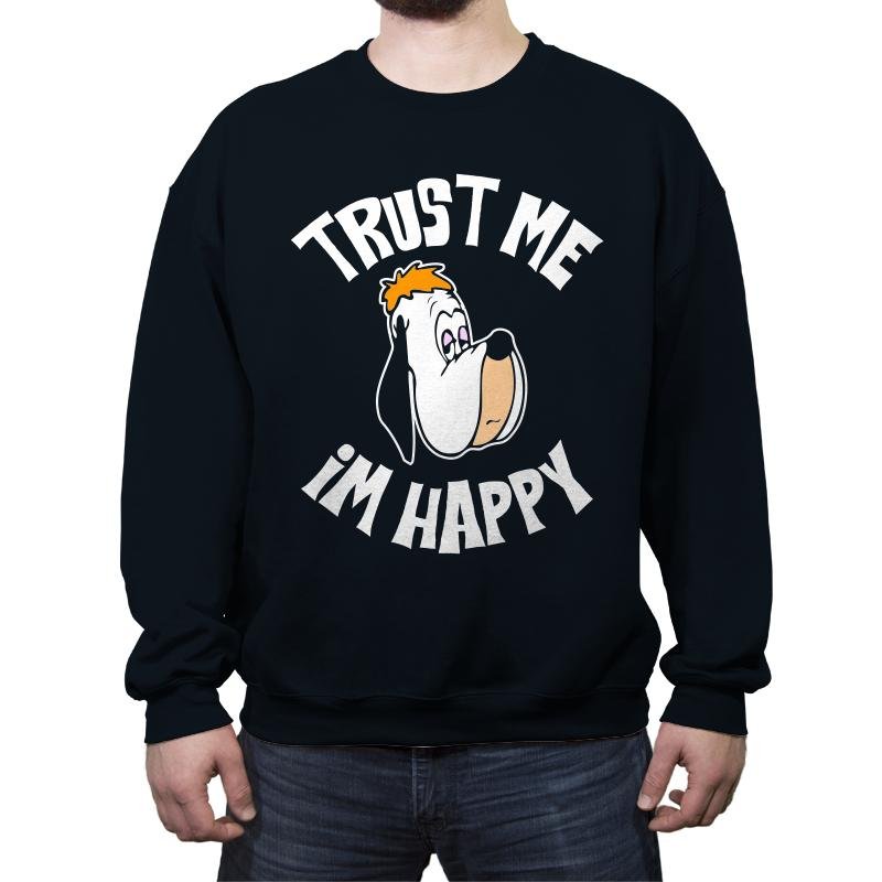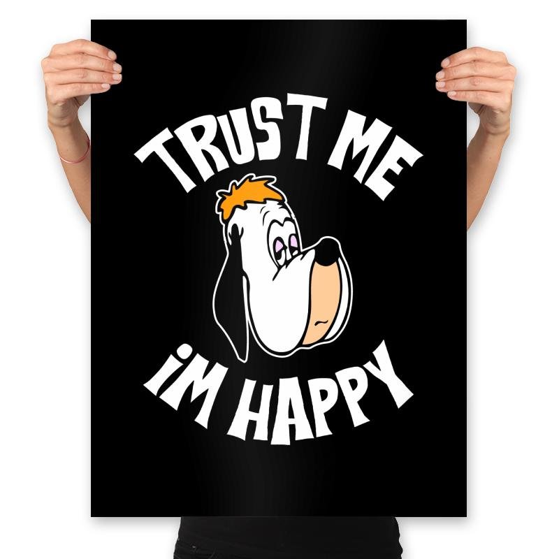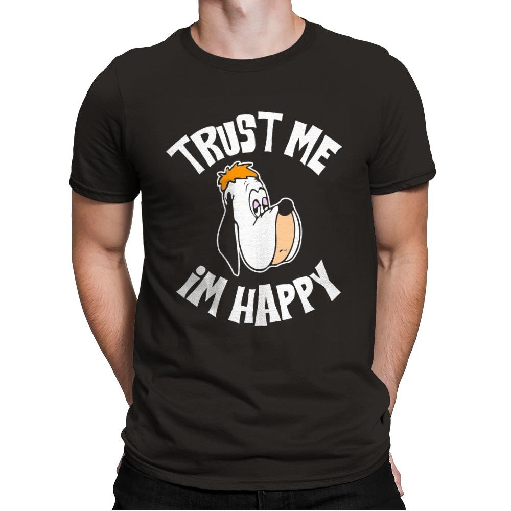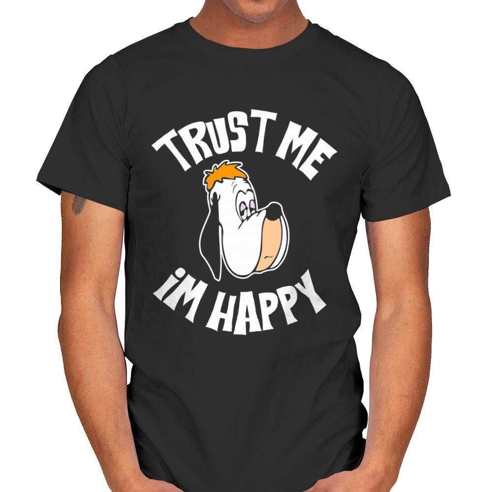 This playful design features a laid-back, smiling dog with the text “Trust Me, I’m Happy.” The character’s relaxed expression and the bold, friendly lettering create a lighthearted and fun vibe. It’s a whimsical way to show off positivity and humor, drawing from the lovable charm of classic animated characters.