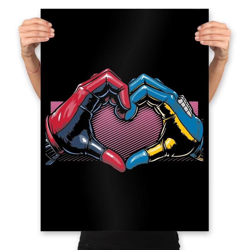 This design says everything without saying much at all. Two gloved hands, each in a familiar color scheme, meet in the center to form a simple heart against a dark backdrop. The style feels bold and graphic, almost like a comic panel frozen at the exact right moment. If you know the reference, the message lands instantly and without explanation.
