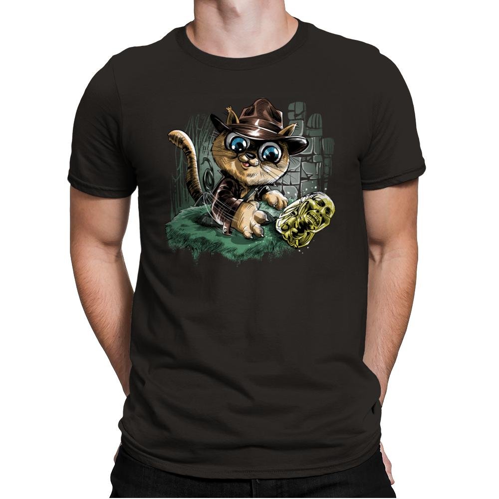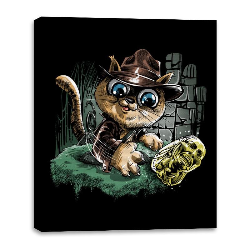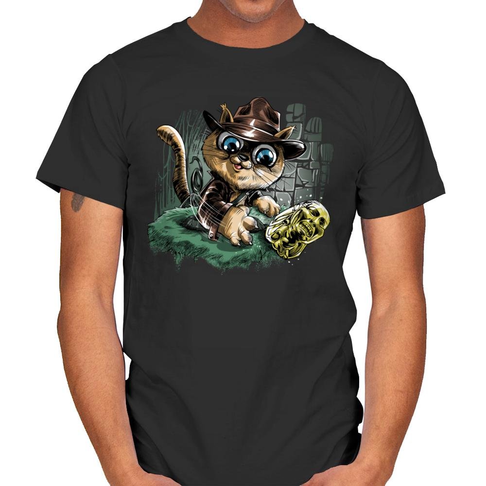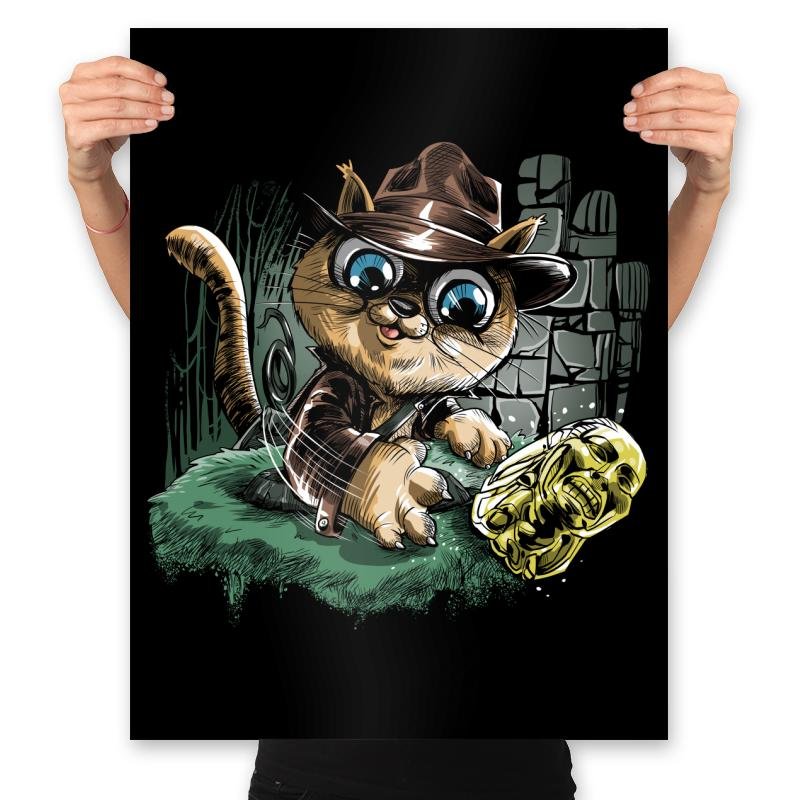 This design turns a treasure hunting feline loose in an ancient ruin. The cat sports a weathered fedora and leather jacket as it reaches for a gleaming golden idol. Stone blocks, vines, and motion lines sell the action moment, with the cat’s oversized eyes adding extra drama. Fans will instantly recognize the pulp adventure reference filtered through kitten mischief.