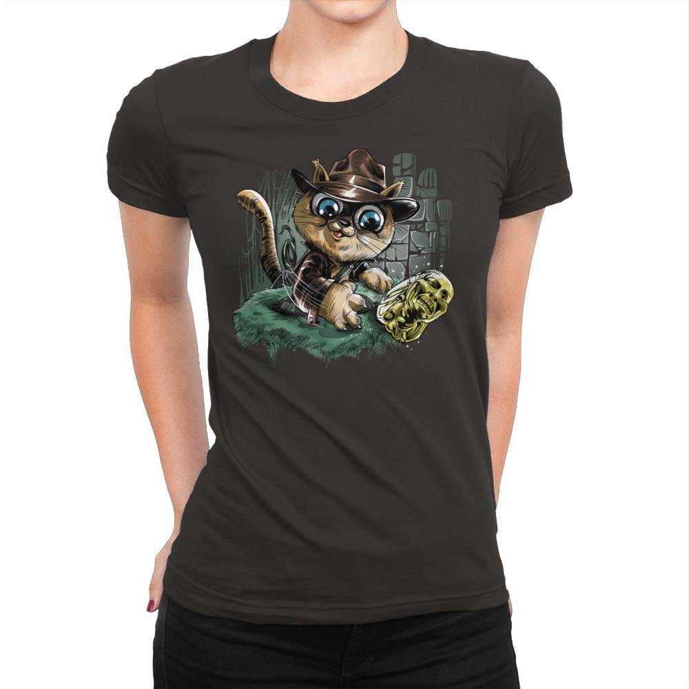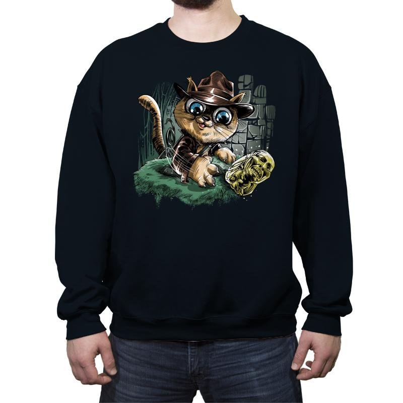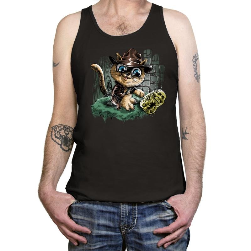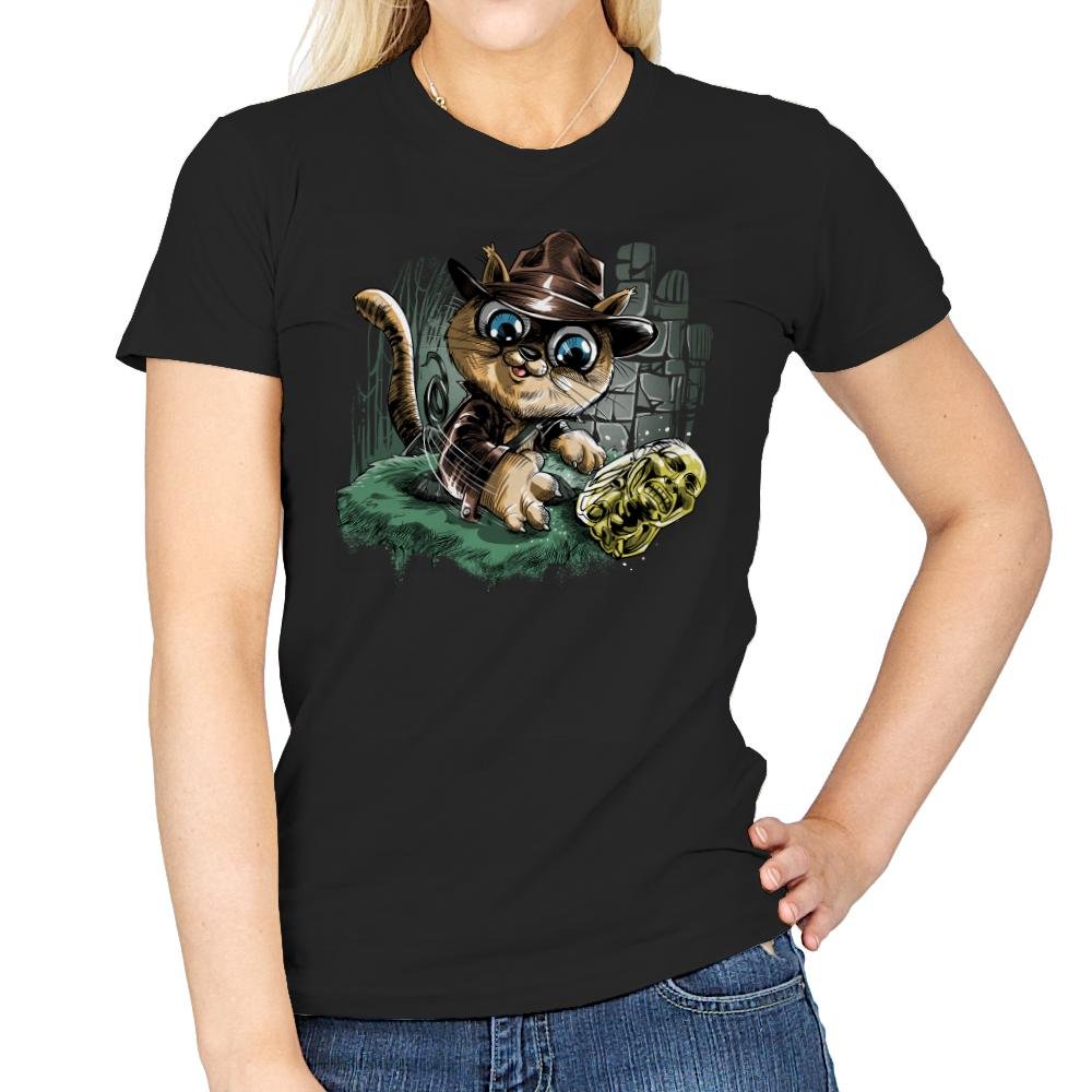 This design turns a treasure hunting feline loose in an ancient ruin. The cat sports a weathered fedora and leather jacket as it reaches for a gleaming golden idol. Stone blocks, vines, and motion lines sell the action moment, with the cat’s oversized eyes adding extra drama. Fans will instantly recognize the pulp adventure reference filtered through kitten mischief.