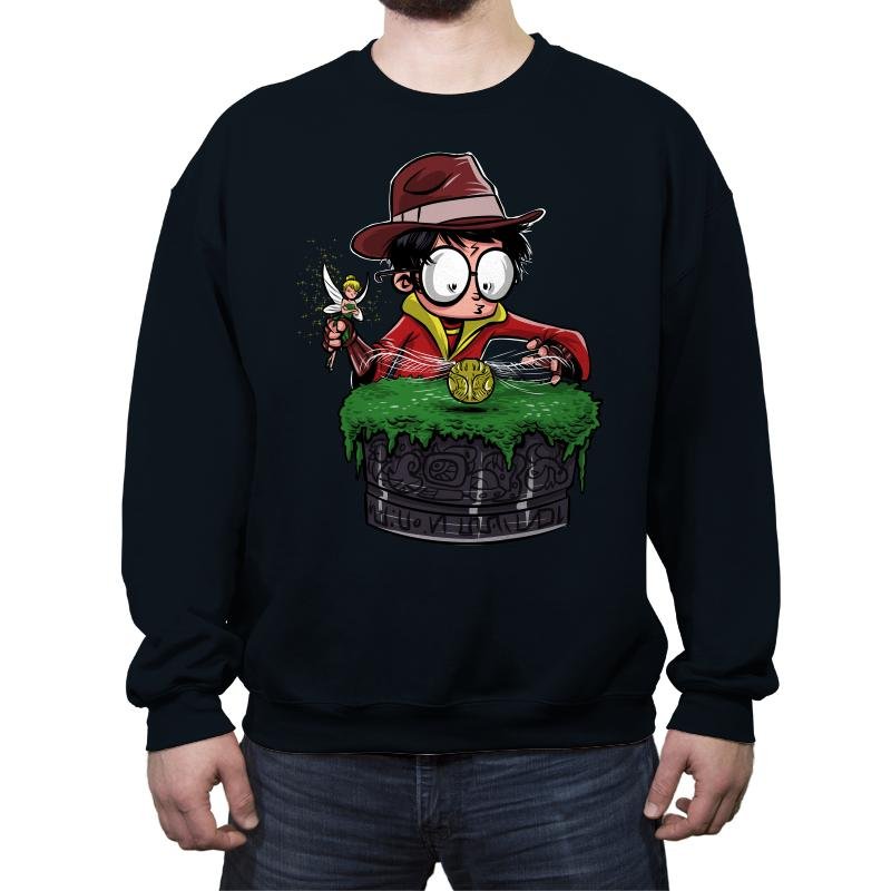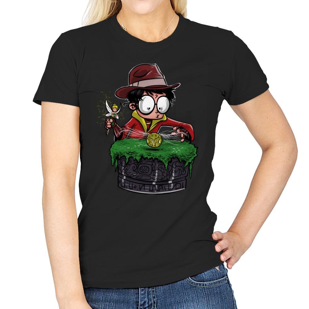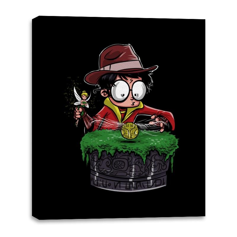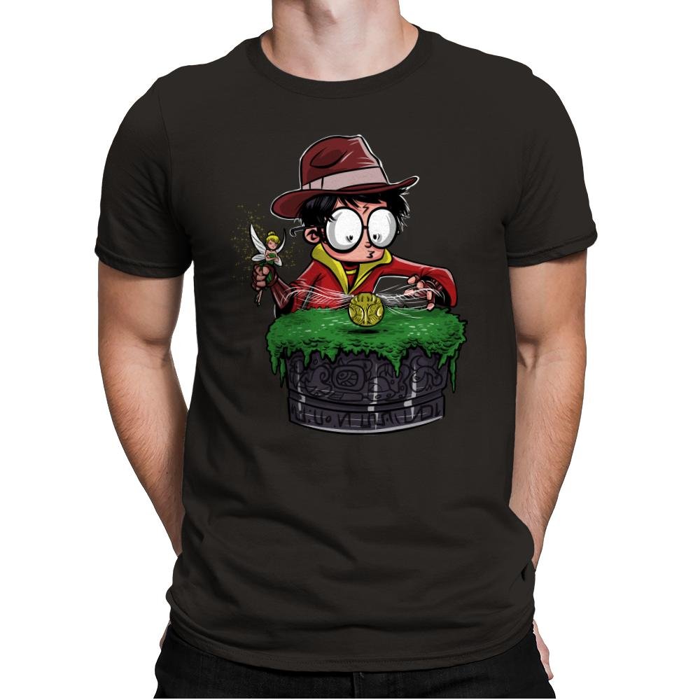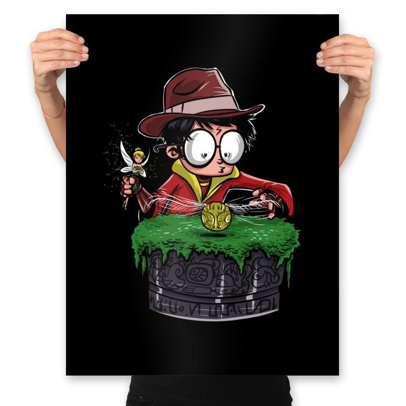 This design drops a familiar young wizard into full relic hunter mode. Round glasses, a fedora, and a wand held like a tool of exploration set the tone, while a mossy stone pedestal and glowing artifact sell the mashup instantly. It reads like a lost scene where magic meets ancient traps and poor life choices. If you know both worlds, the joke lands without explanation.