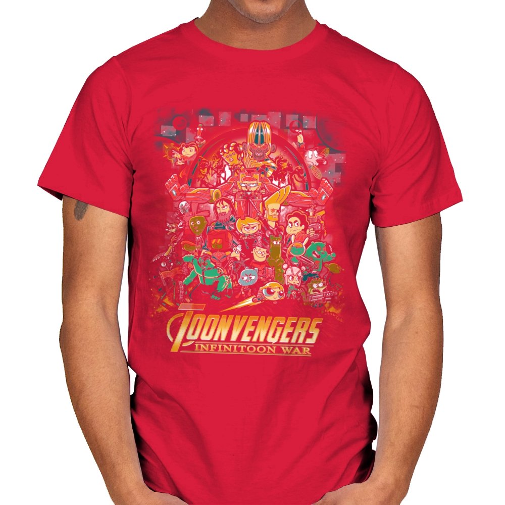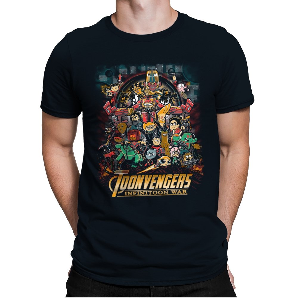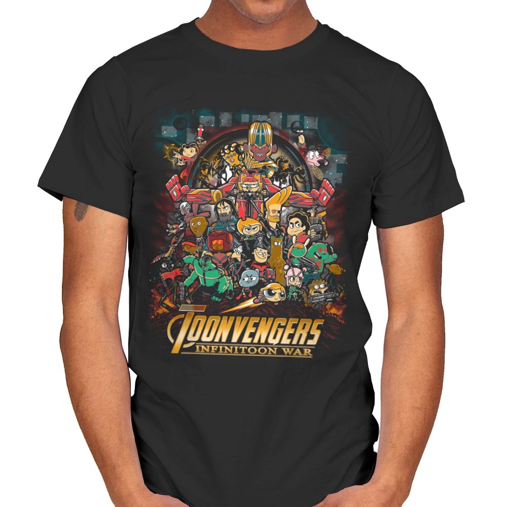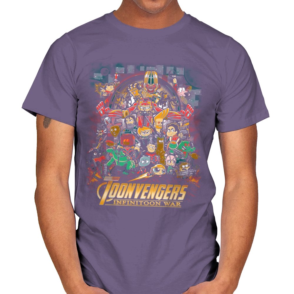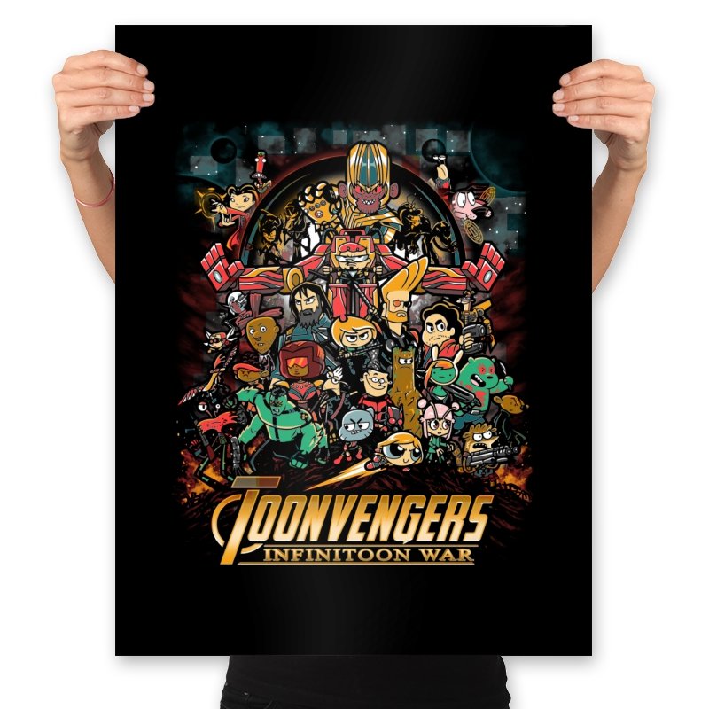 This artwork stages a sprawling crossover battle where classic Saturday morning cartoon heroes take on a cosmic tyrant with a shiny gauntlet of power. The cast is huge and chaotic, with characters from different eras packed into one busy composition. Each figure holds their signature weapon or pose, creating a parody of splash page drama filtered through slapstick animation logic. Fans will recognize the movie poster reference immediately and laugh at how the stakes feel both silly and epic.