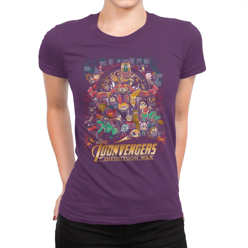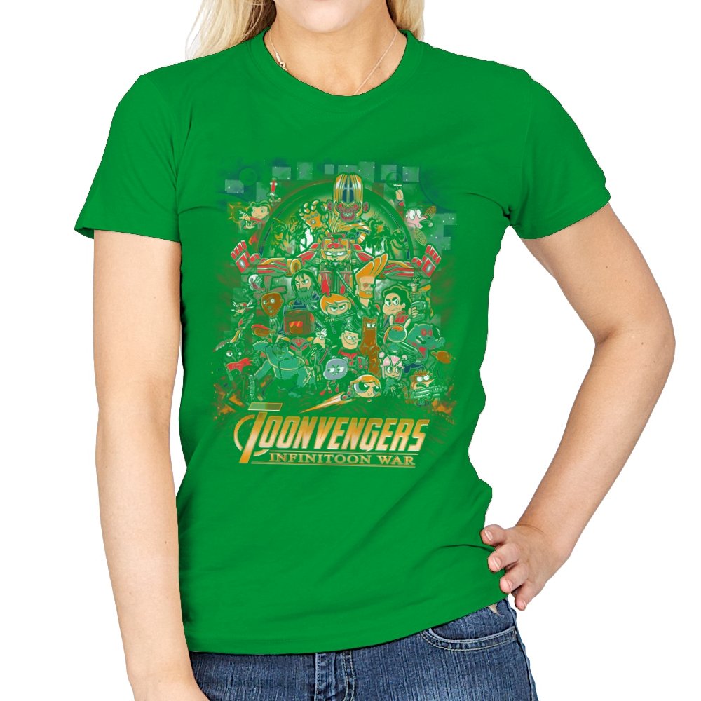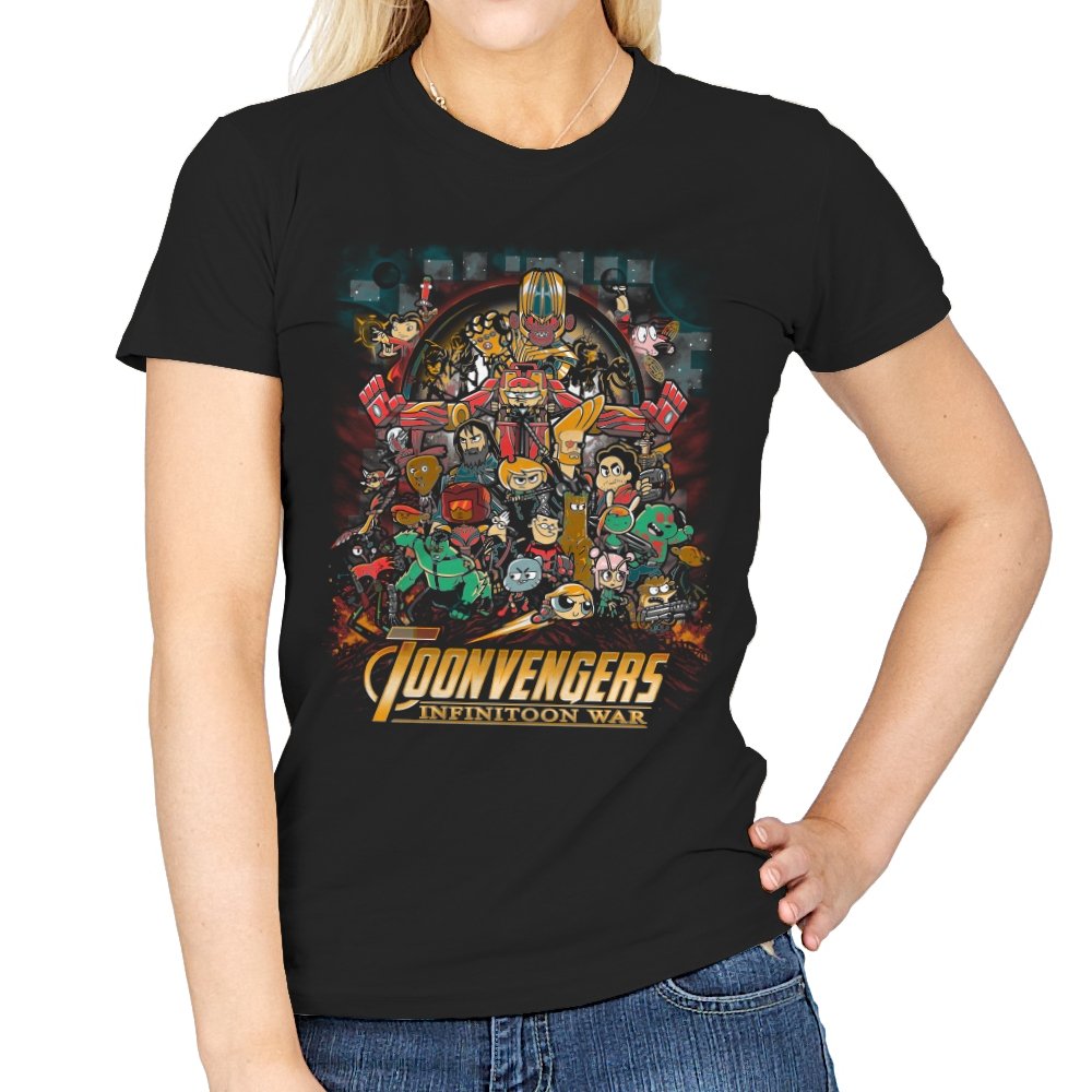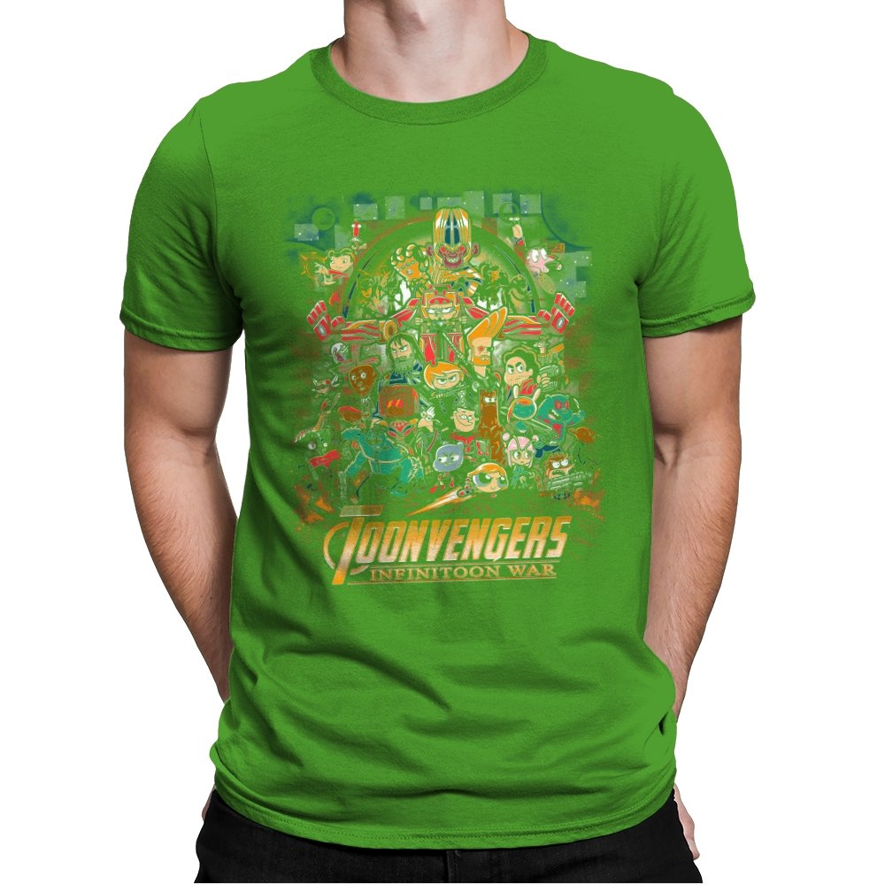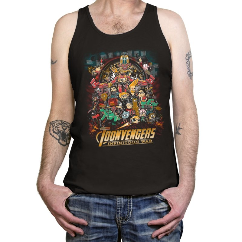 This artwork stages a sprawling crossover battle where classic Saturday morning cartoon heroes take on a cosmic tyrant with a shiny gauntlet of power. The cast is huge and chaotic, with characters from different eras packed into one busy composition. Each figure holds their signature weapon or pose, creating a parody of splash page drama filtered through slapstick animation logic. Fans will recognize the movie poster reference immediately and laugh at how the stakes feel both silly and epic.