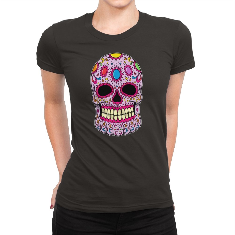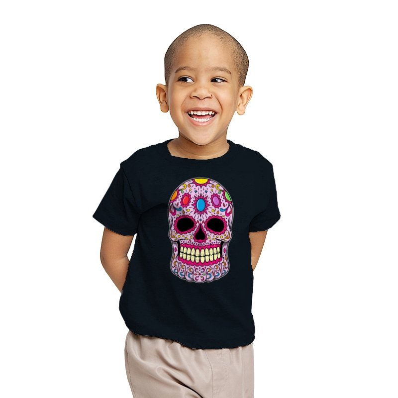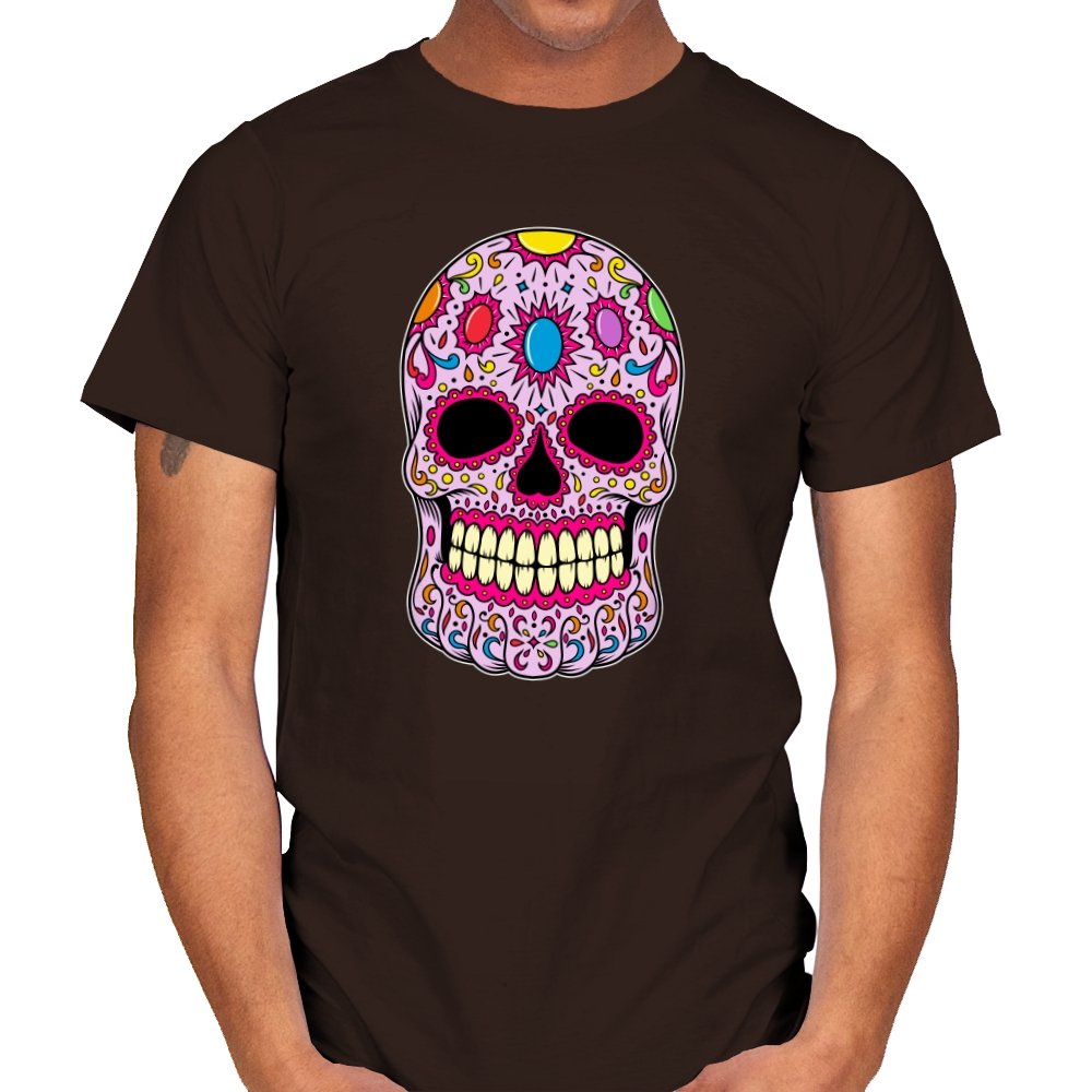 Infinity Calavera leans into the bold, candy-bright tradition of decorated skulls. Floral shapes sprawl across the forehead and cheekbones, while gem-like ovals sit where cosmic power emblems might go. The teeth are drawn in clean rows that look almost too perfect, which adds to the playful contrast between mortality and celebration. The whole design blends folk ornament with comic book spectacle without needing to explain itself.