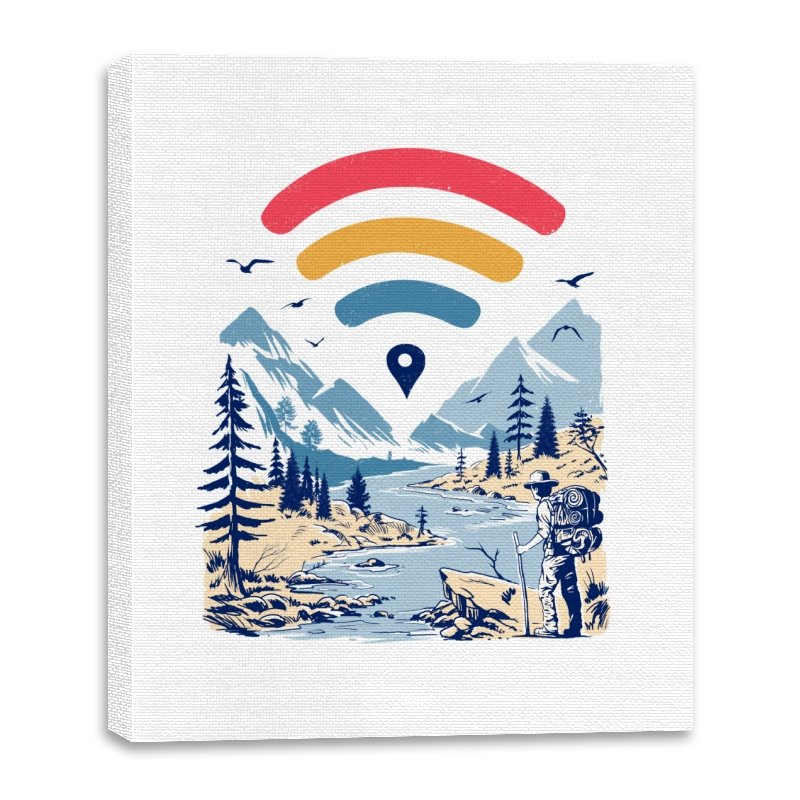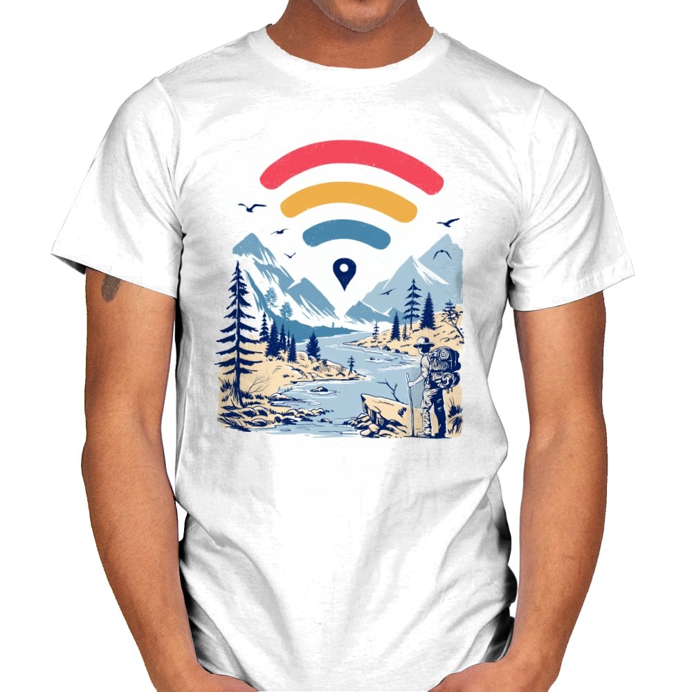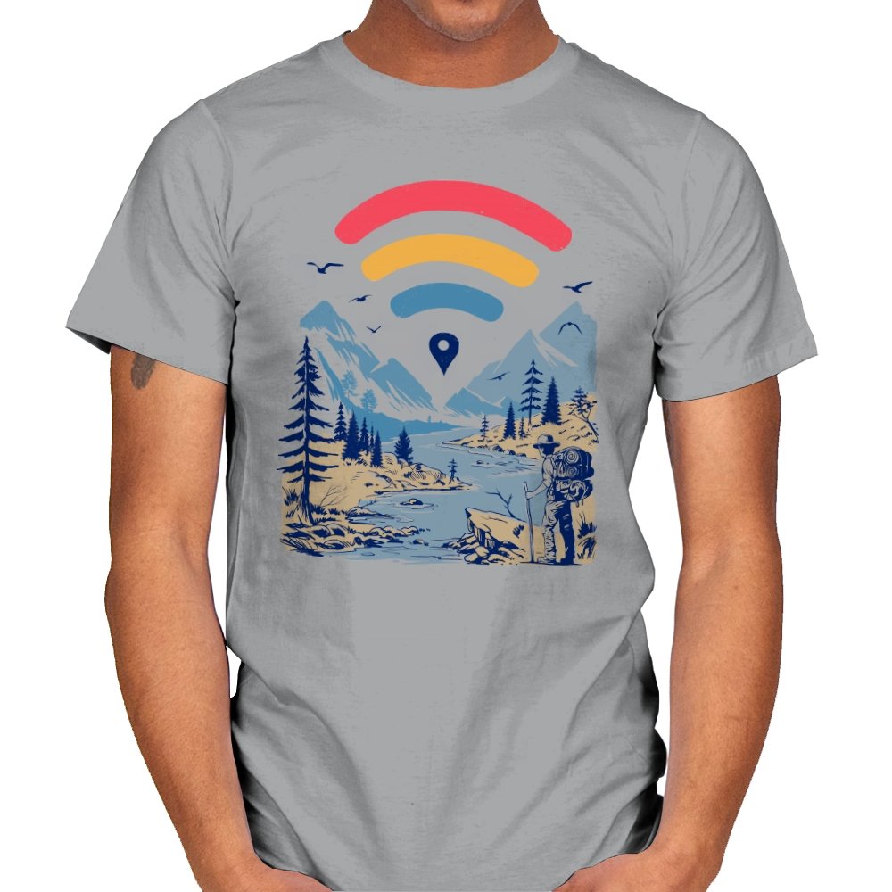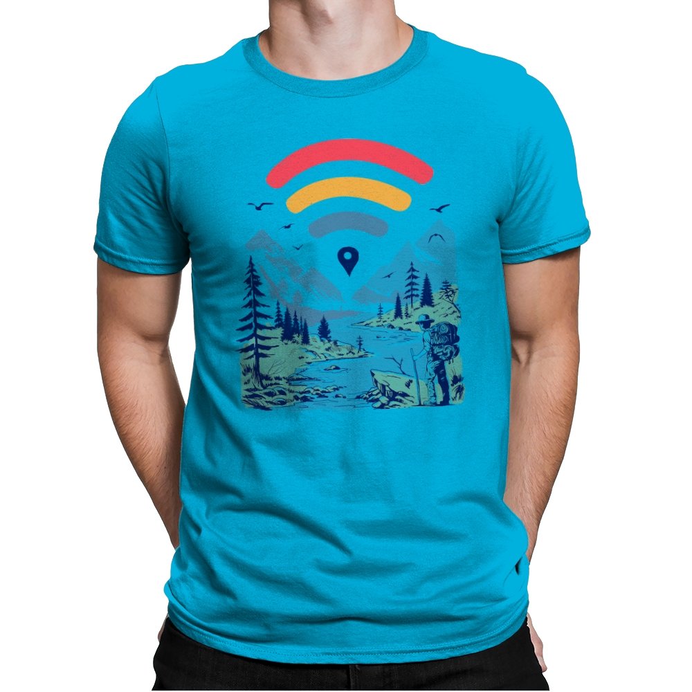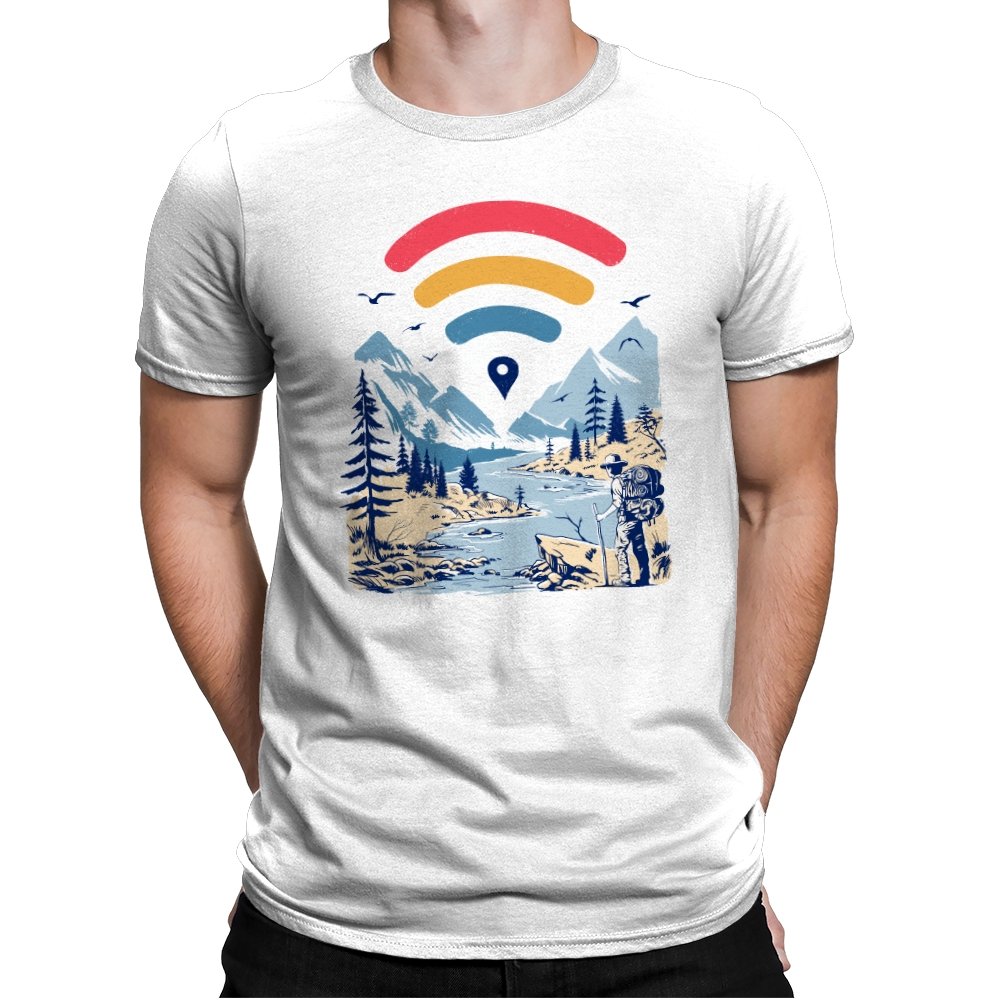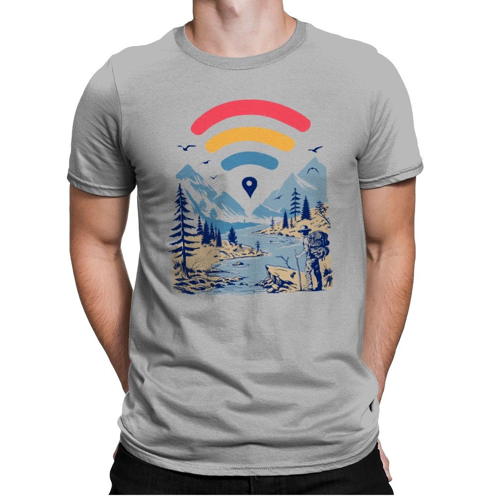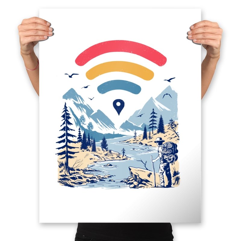 This design blends outdoor poster art with a quiet technology joke. A hiker stands at the edge of a river valley, mountains rising behind them, while a familiar signal icon floats overhead like a modern compass. The contrast between untouched landscape and digital navigation is the entire point. If you have ever relied on a loading bar to find somewhere remote, the reference lands immediately.