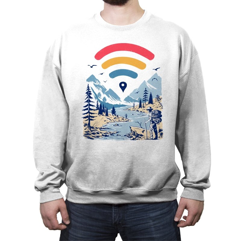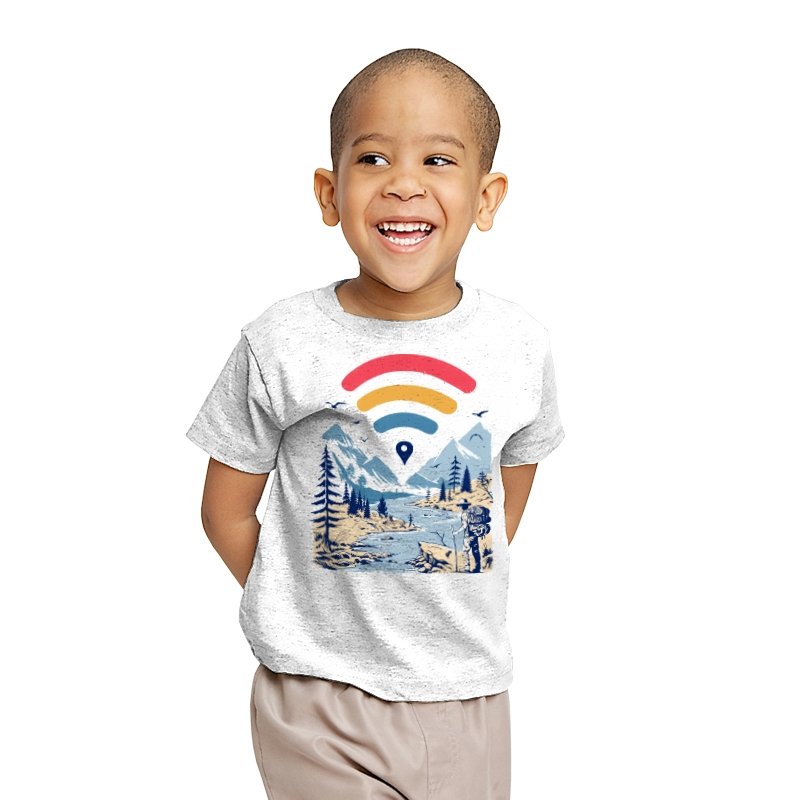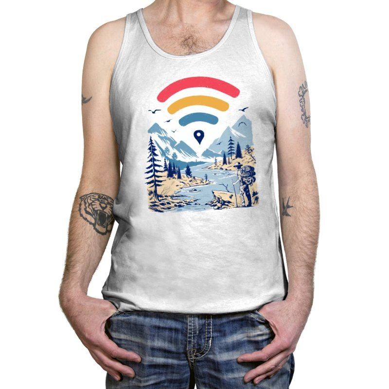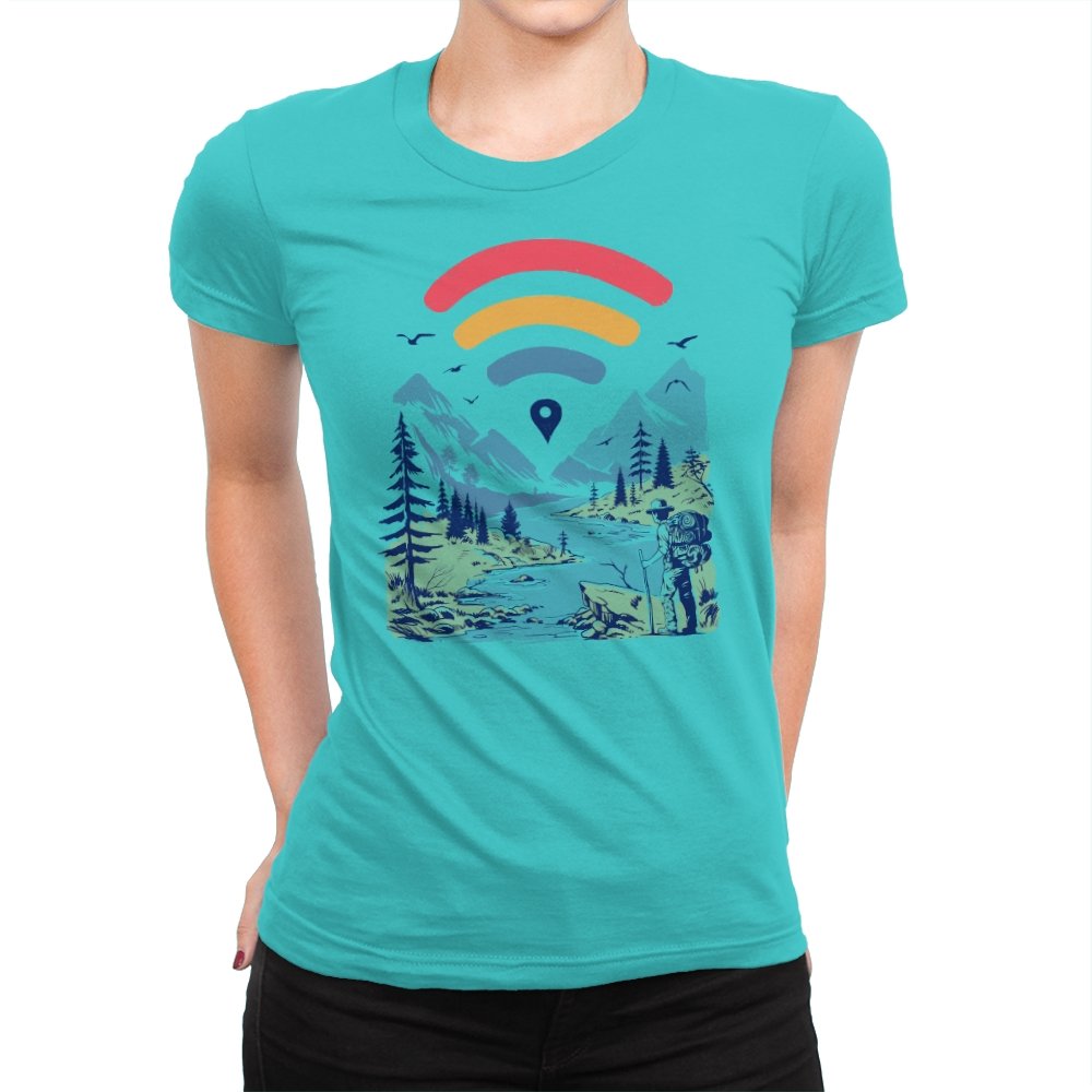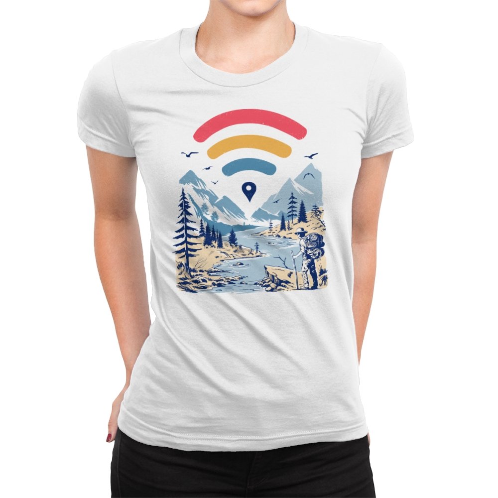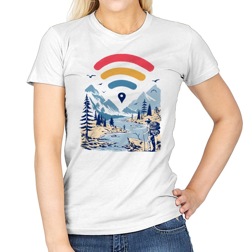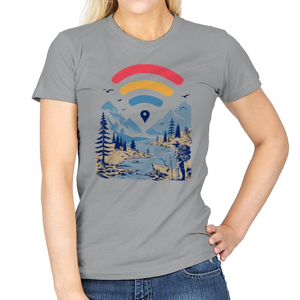 This design blends outdoor poster art with a quiet technology joke. A hiker stands at the edge of a river valley, mountains rising behind them, while a familiar signal icon floats overhead like a modern compass. The contrast between untouched landscape and digital navigation is the entire point. If you have ever relied on a loading bar to find somewhere remote, the reference lands immediately.