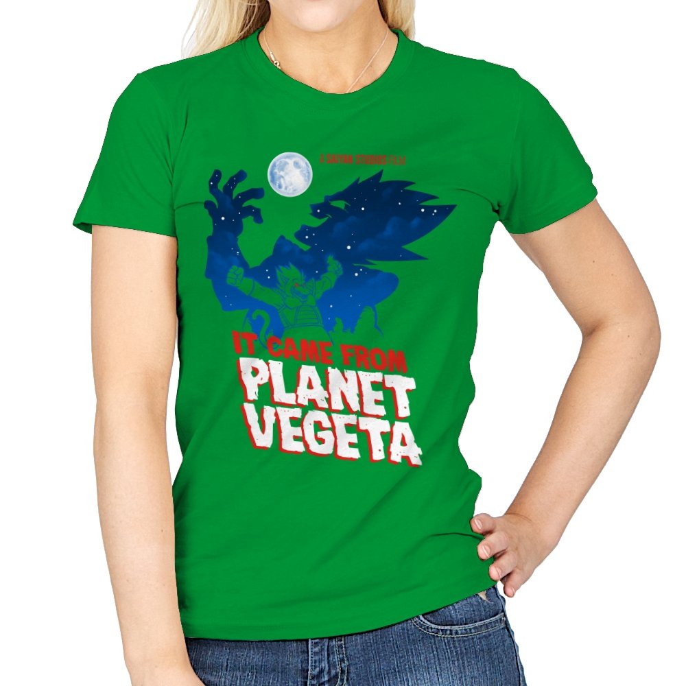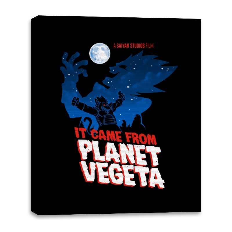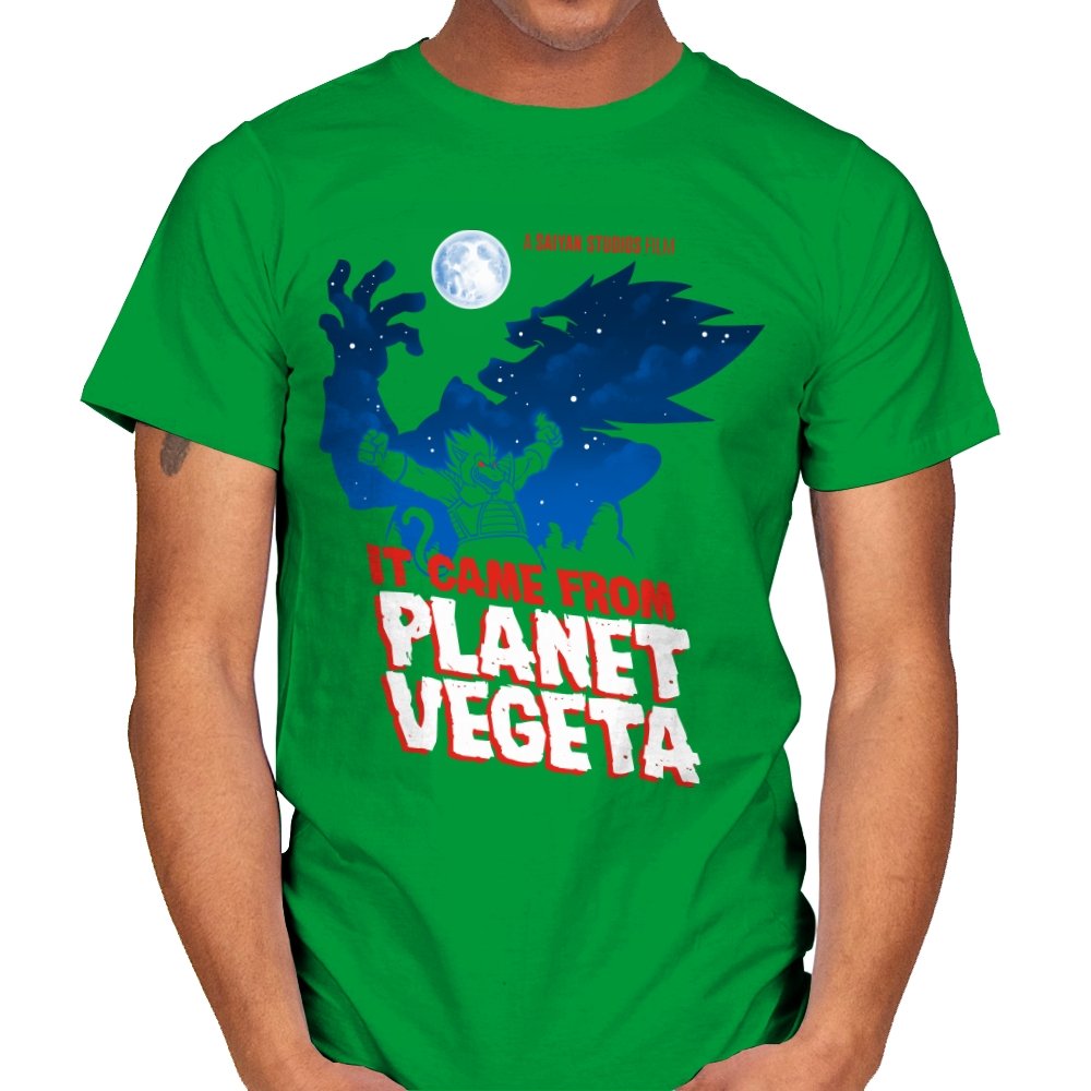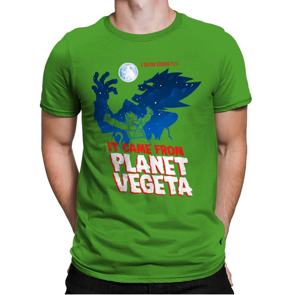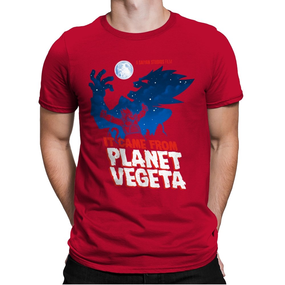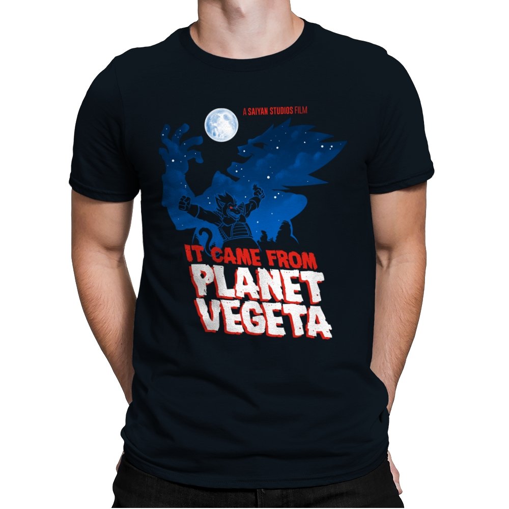 This design frames a familiar origin story through the lens of classic creature features. A lone figure rises against a moonlit sky, cape spread wide like a monster silhouette from a midnight movie poster. The bold title typography leans into vintage sci-fi horror, blending pulpy cinema aesthetics with unmistakable anime energy. It trusts the viewer to recognize the planet, the power, and the attitude without spelling it out.