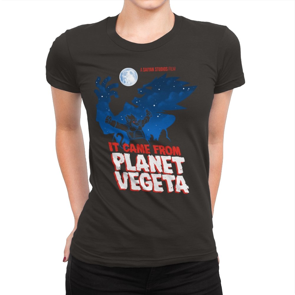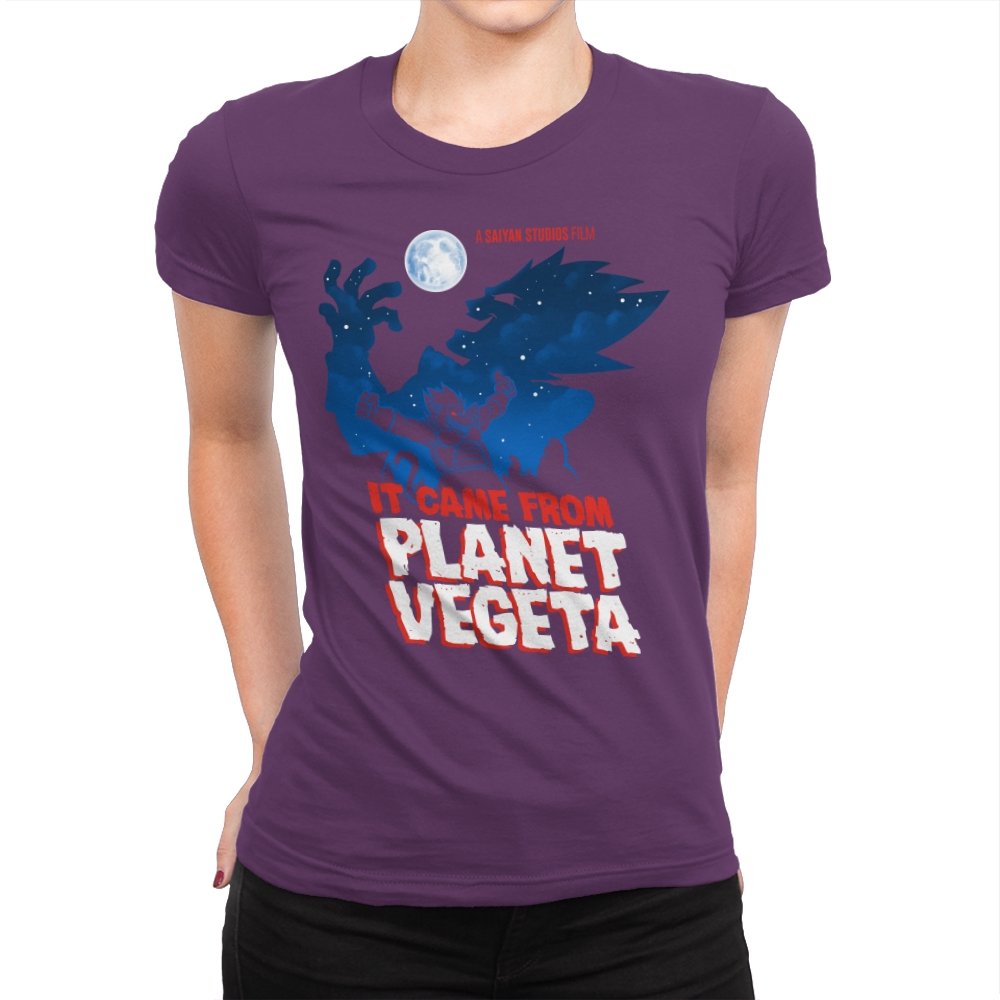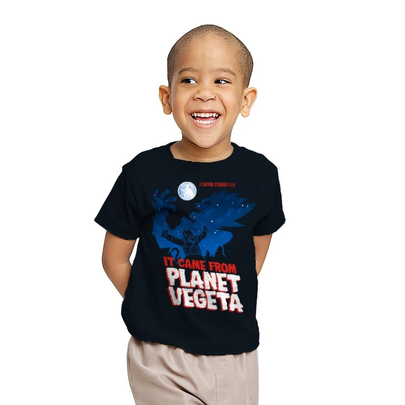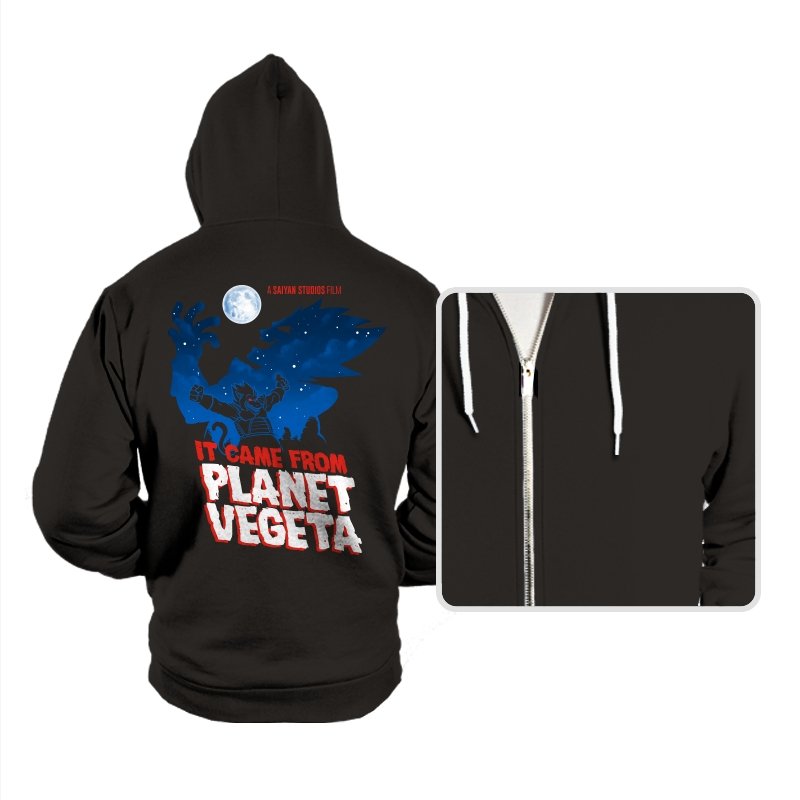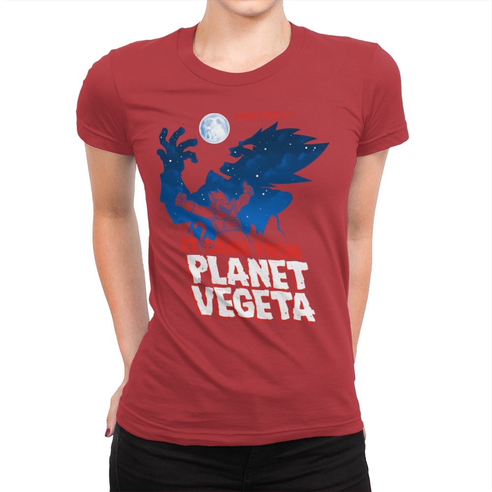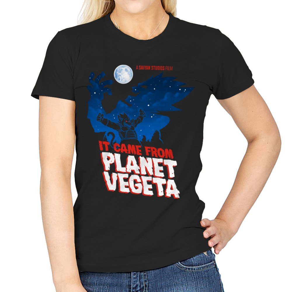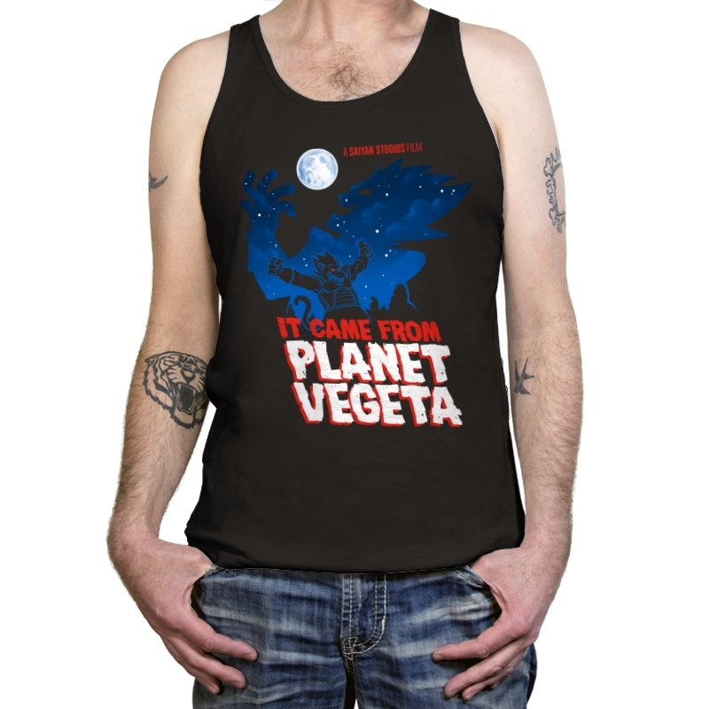 This design frames a familiar origin story through the lens of classic creature features. A lone figure rises against a moonlit sky, cape spread wide like a monster silhouette from a midnight movie poster. The bold title typography leans into vintage sci-fi horror, blending pulpy cinema aesthetics with unmistakable anime energy. It trusts the viewer to recognize the planet, the power, and the attitude without spelling it out.