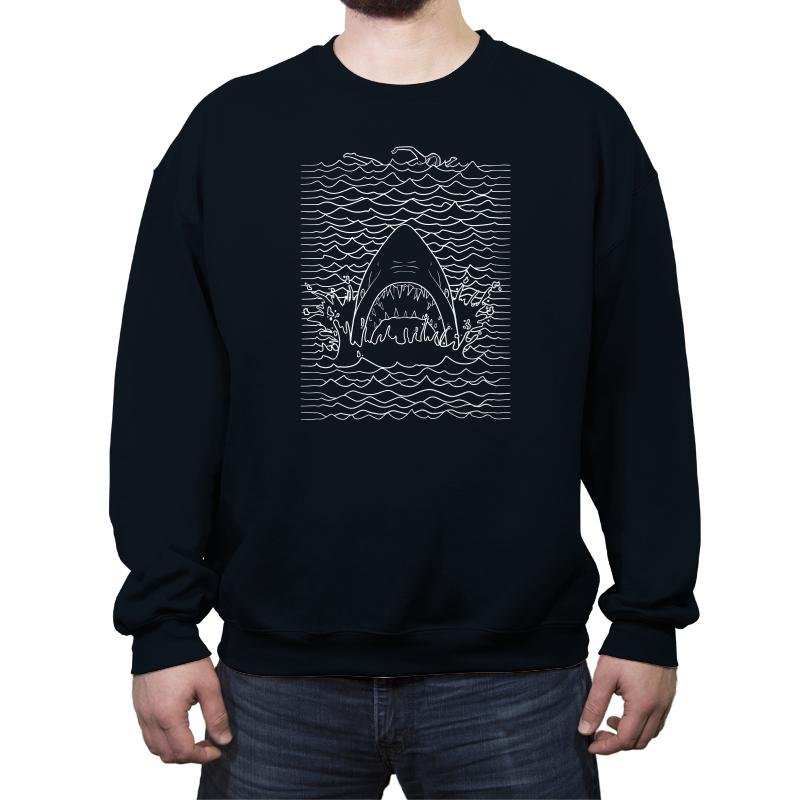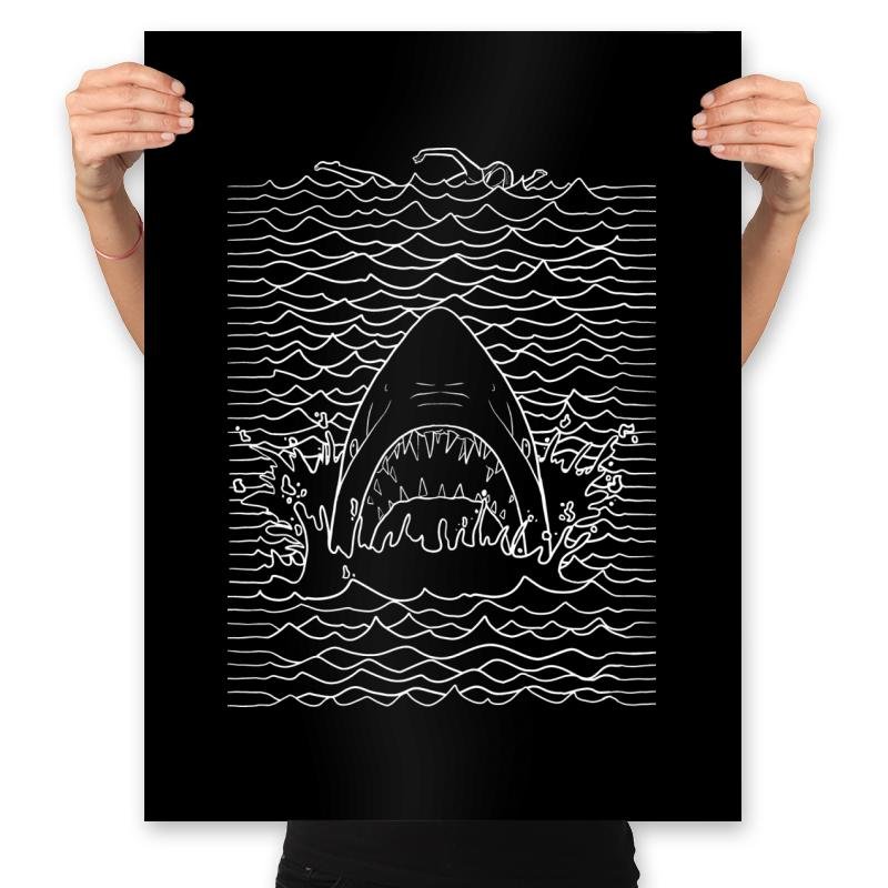 This design strips a familiar ocean nightmare down to its rawest form. A massive set of jaws breaks the surface, rendered in stark white lines against deep black, with nothing but teeth, water, and tension in frame. The minimal linework does all the work, letting negative space and repetition of waves build dread instead of detail. It feels graphic, cold, and deliberate, like a warning sign you noticed too late.