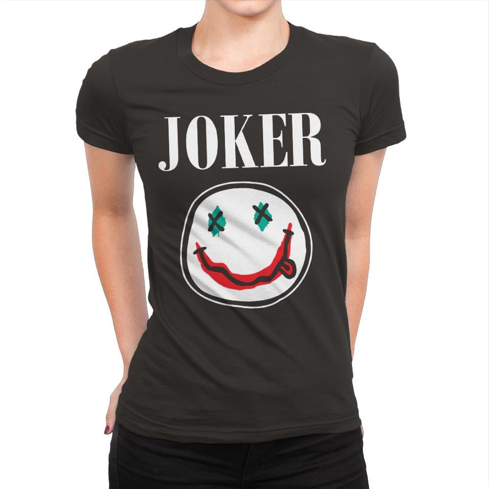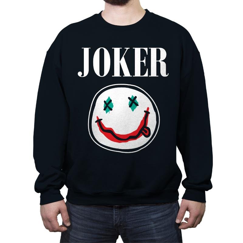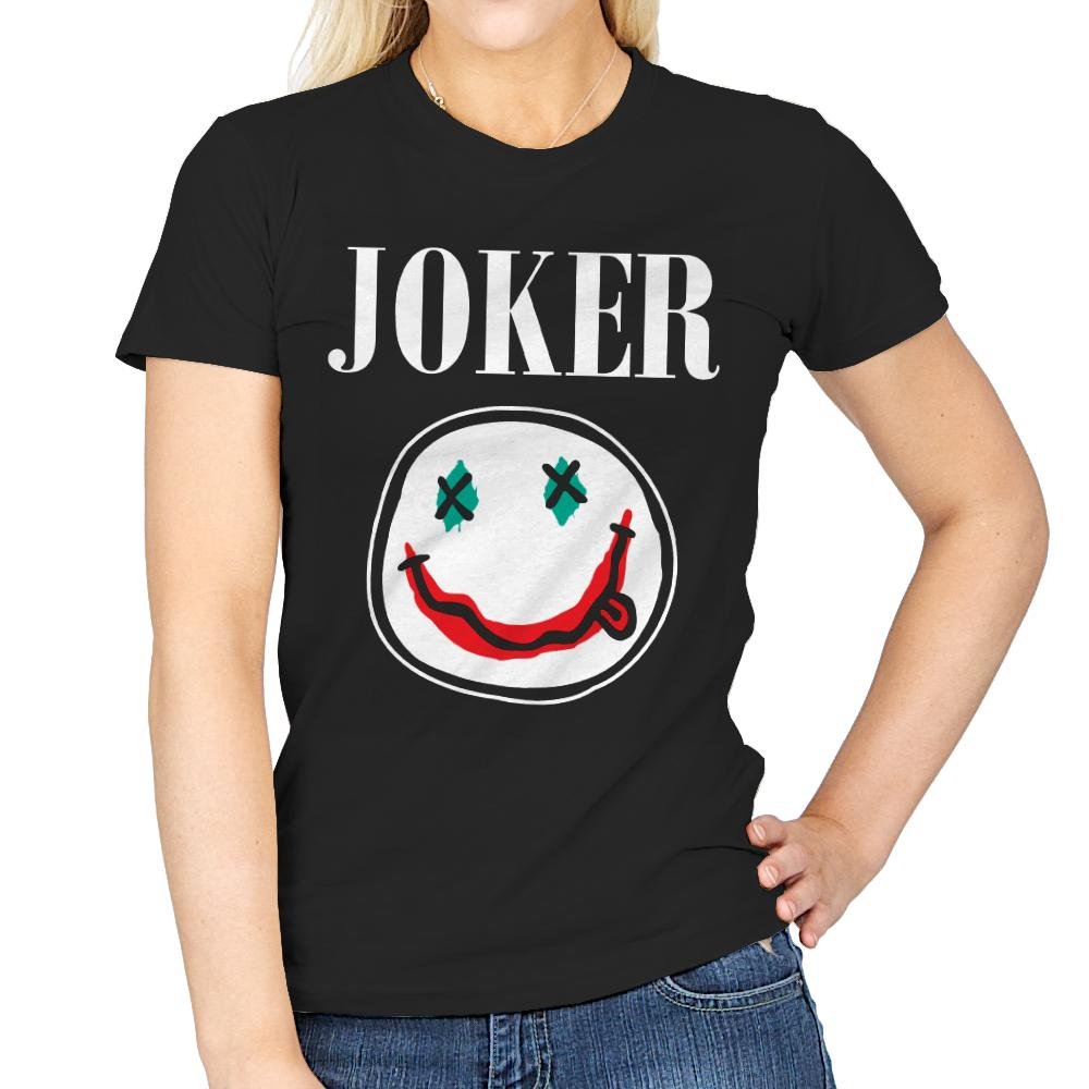 This design strips a familiar clown prince archetype down to raw symbols. The word “Joker” sits stark at the top like a magazine masthead, while a loose, crayon style smiley dominates the center. The eyes are simple X marks in teal and the smeared red grin carries all the chaos you need to recognize. Against the black field, the rough strokes feel like graffiti or a sketch torn from a notebook, which is the fun of it for anyone who gets the reference.