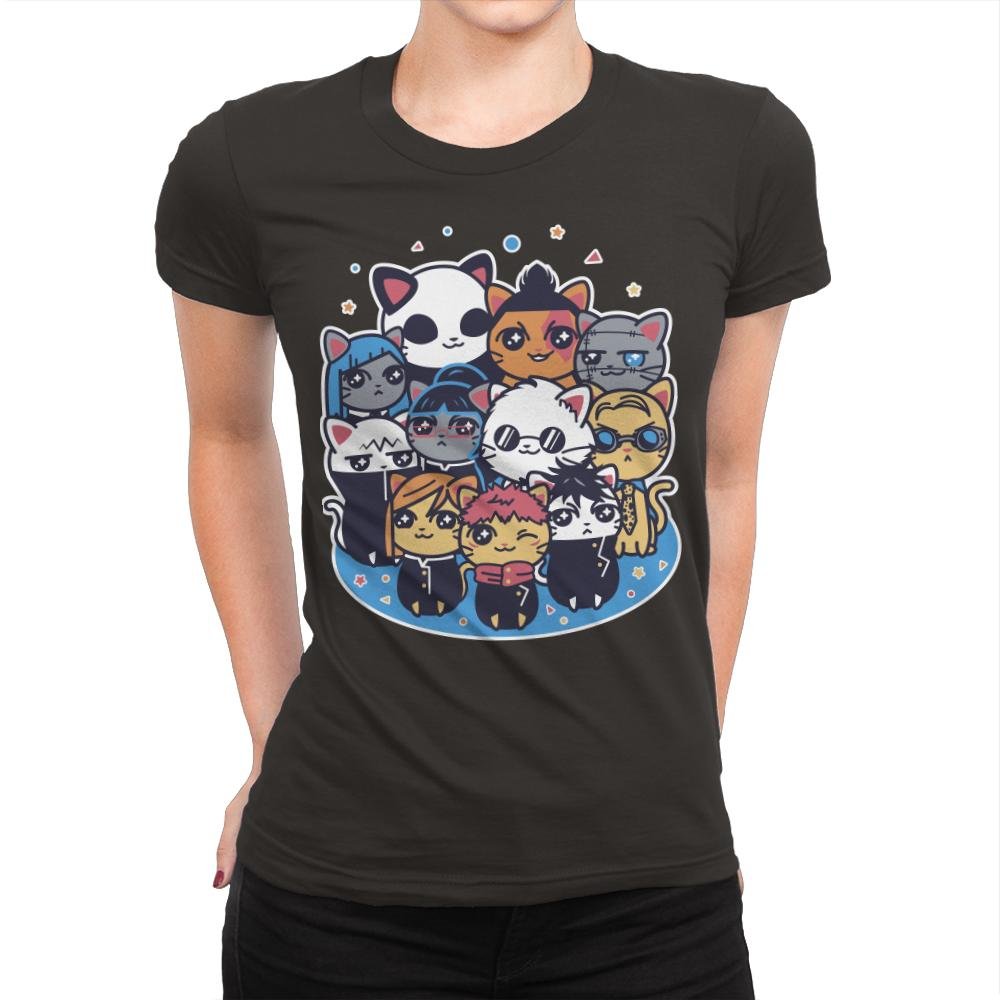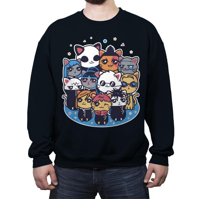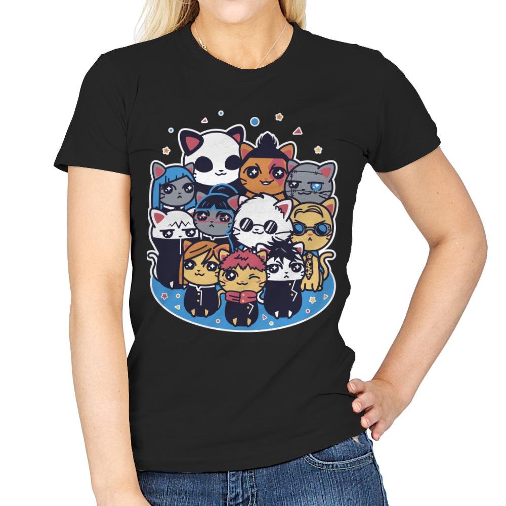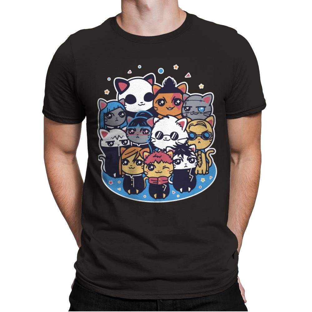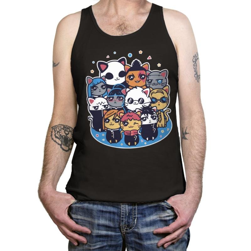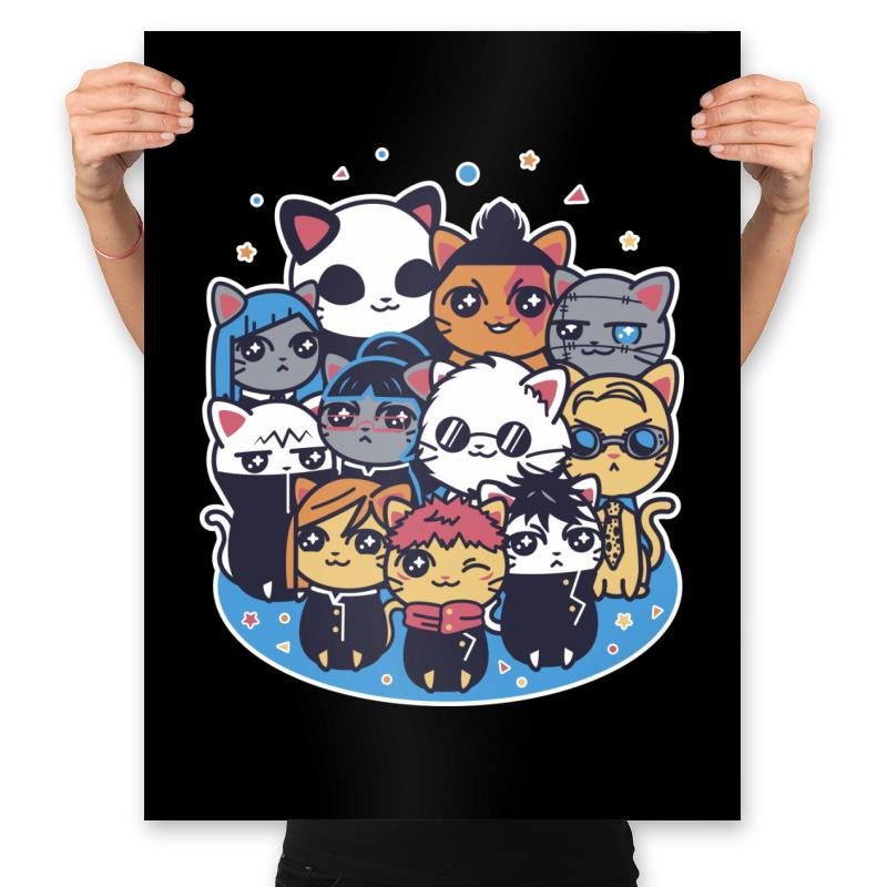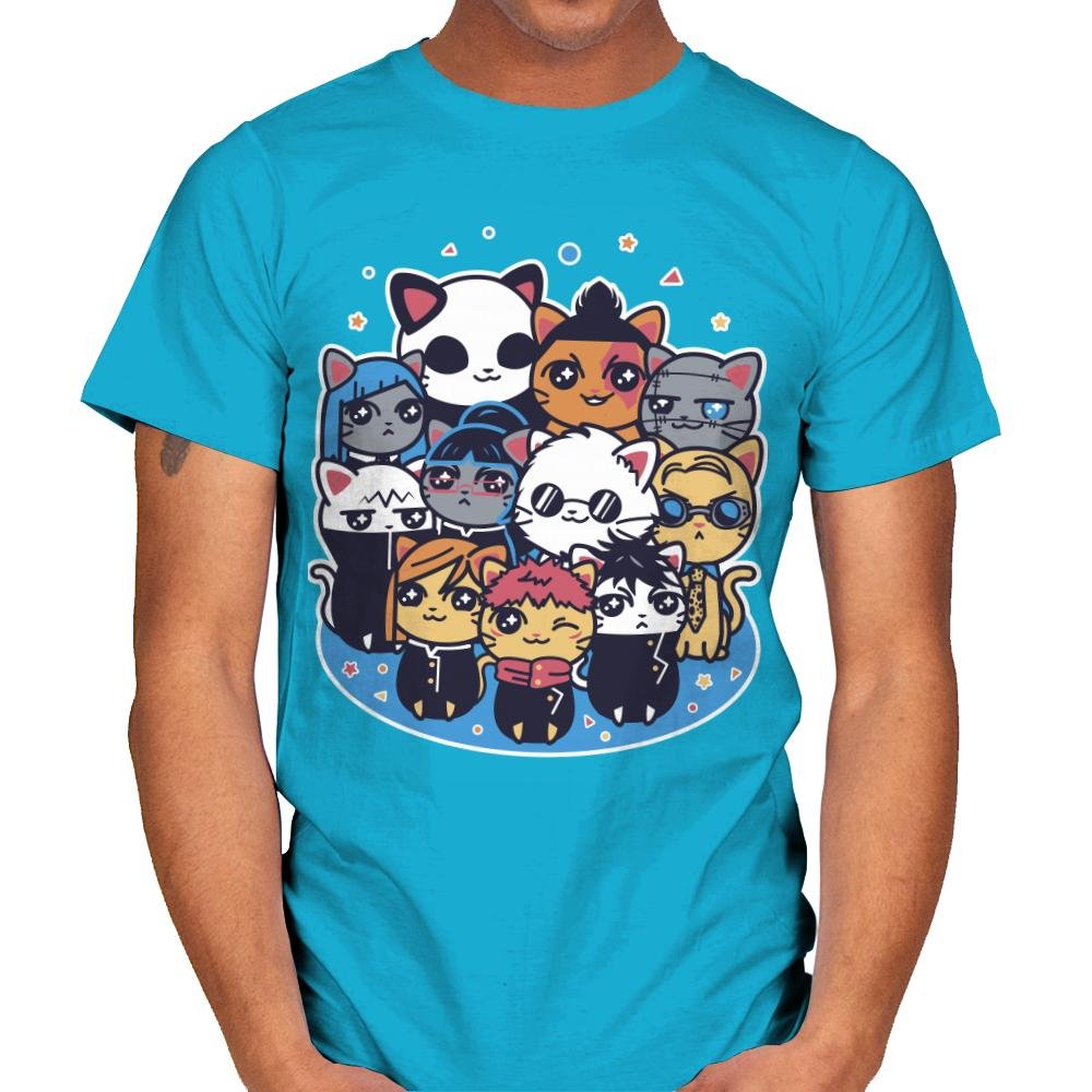 This design turns a full cast of sorcerer misfits into round cheeked cats and stacks them into a squad portrait. Each kitty carries a recognizable hairstyle, quirk, or accessory, from blindfolded cool guy to spiky pink rookie, plus the panda sized bruiser in the back. The palette flips between muted greys and bright accents, which keeps things readable even with so many characters in one cluster. Fans will instantly recognize the roster without a single name being spoken.