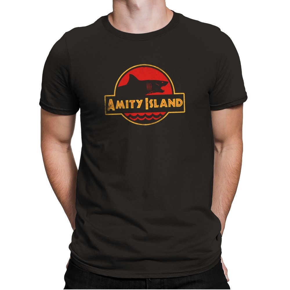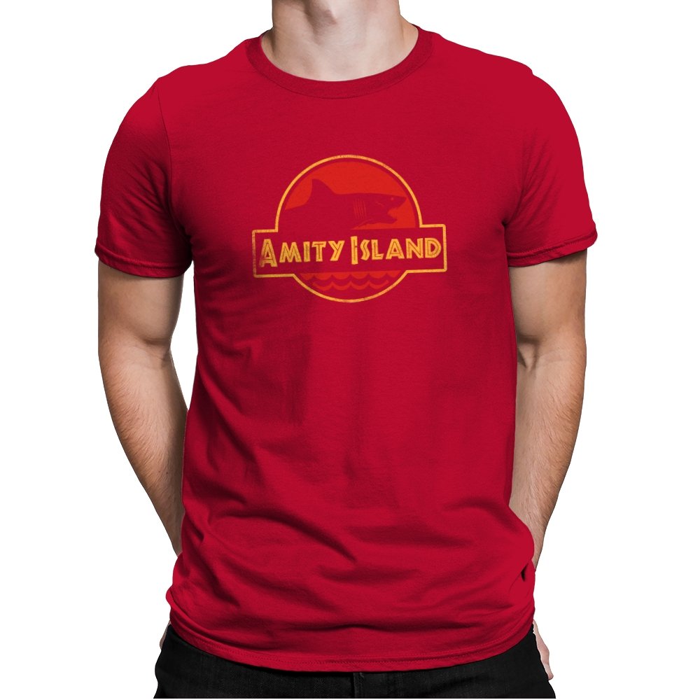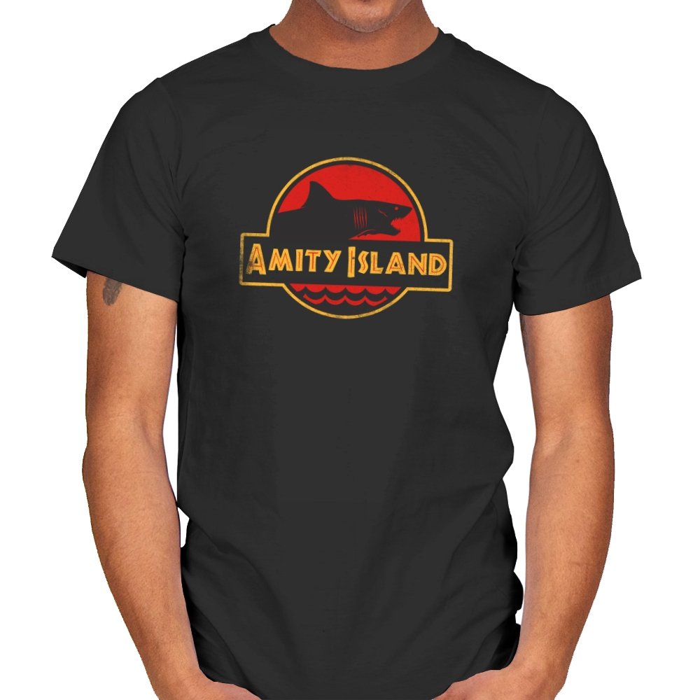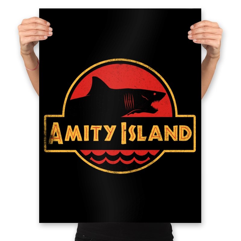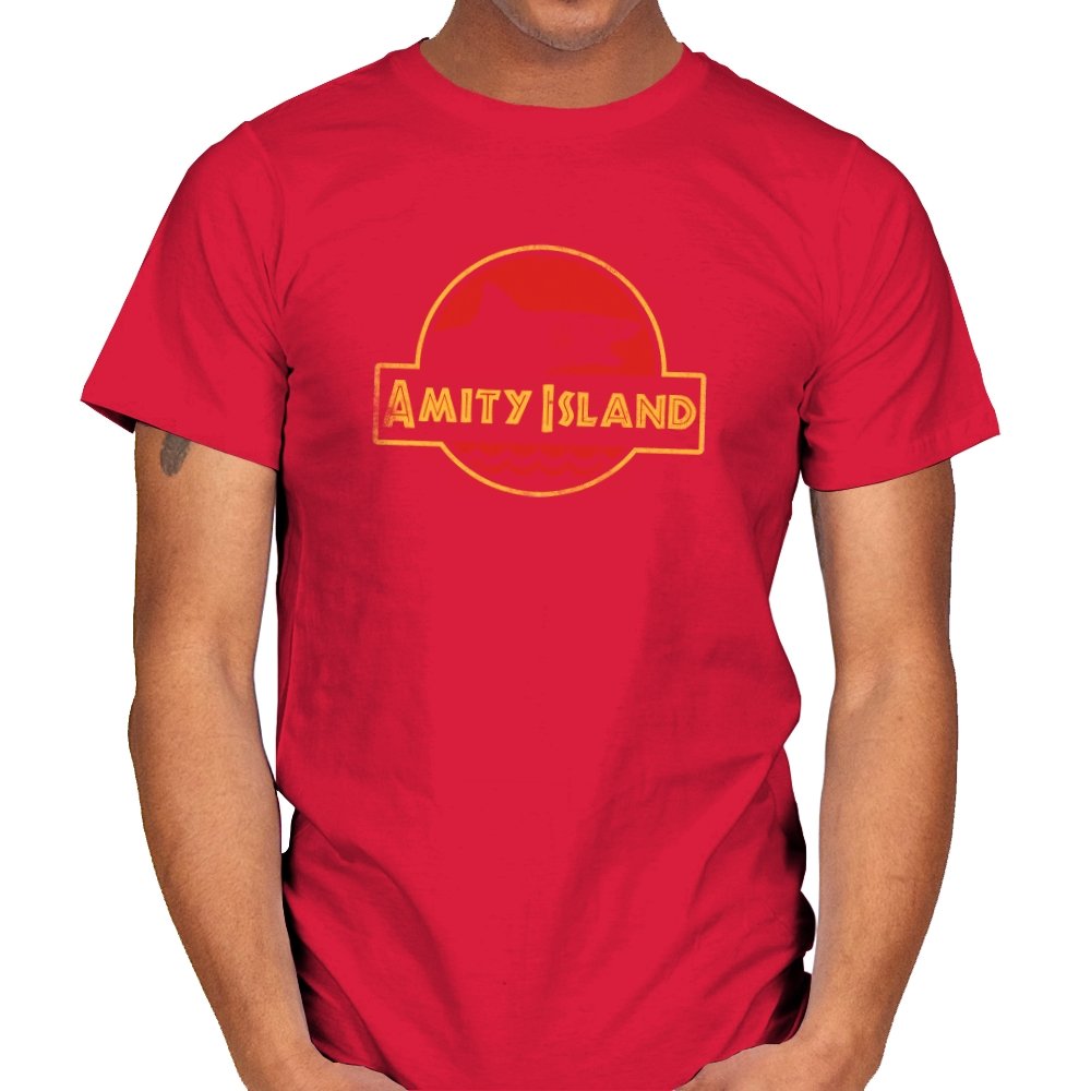 The design merges two iconic warning signs into a single, ominous emblem. A stark shark silhouette cuts across a red sun, framed by a circular badge that feels equal parts theme park logo and coastal alert. The typography anchors the image like official signage, calm and authoritative despite what it implies. Fans immediately recognize how prehistoric terror and seaside dread are folded into one clean mark.