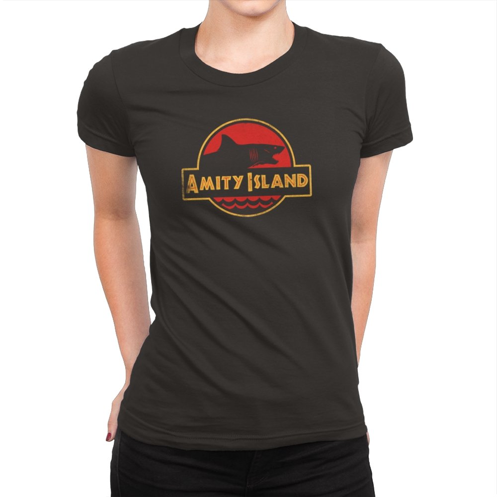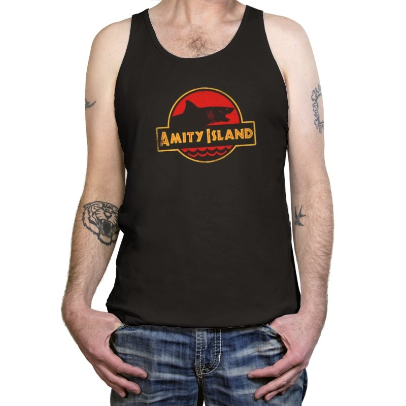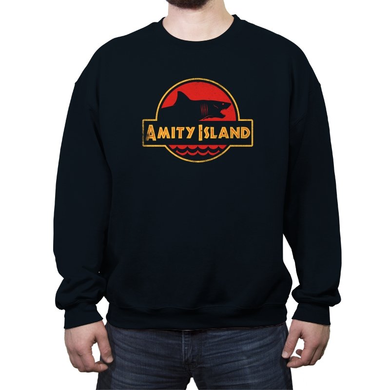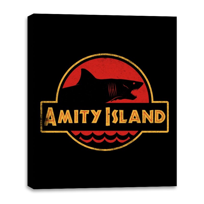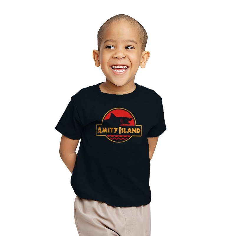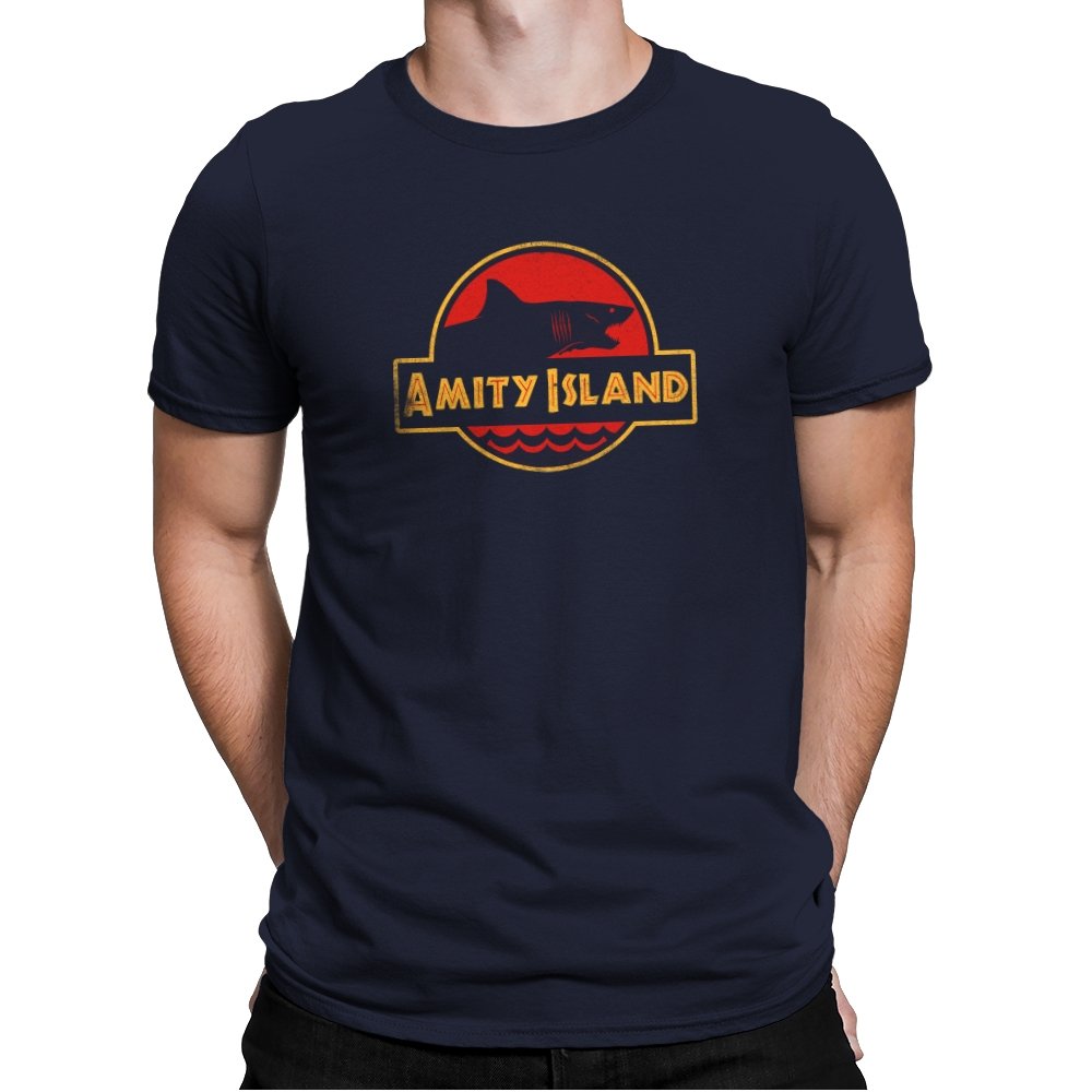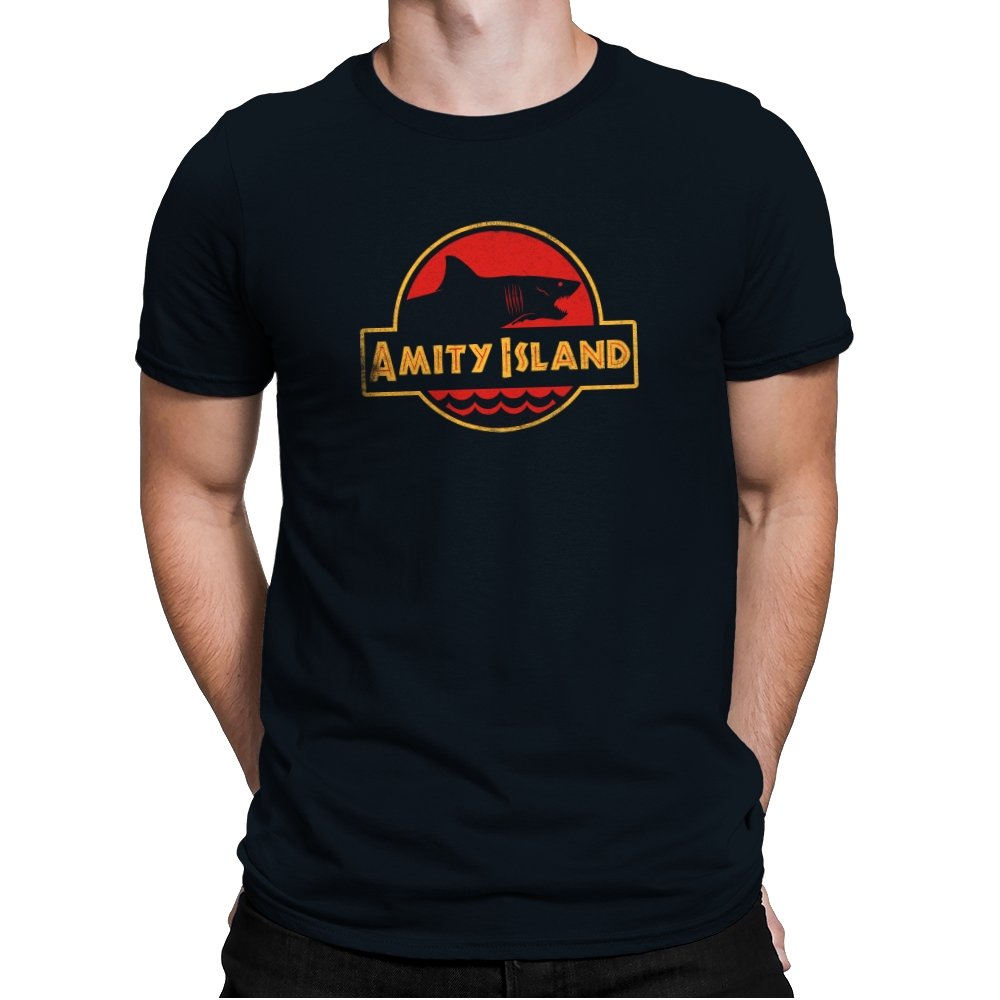 The design merges two iconic warning signs into a single, ominous emblem. A stark shark silhouette cuts across a red sun, framed by a circular badge that feels equal parts theme park logo and coastal alert. The typography anchors the image like official signage, calm and authoritative despite what it implies. Fans immediately recognize how prehistoric terror and seaside dread are folded into one clean mark.
