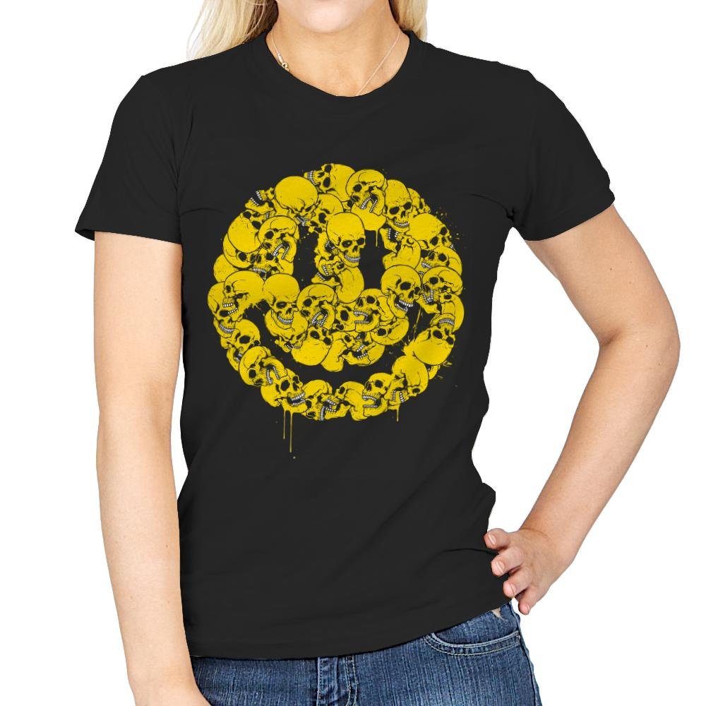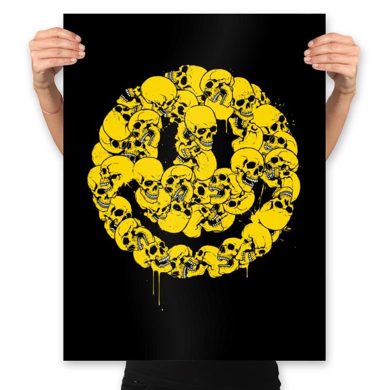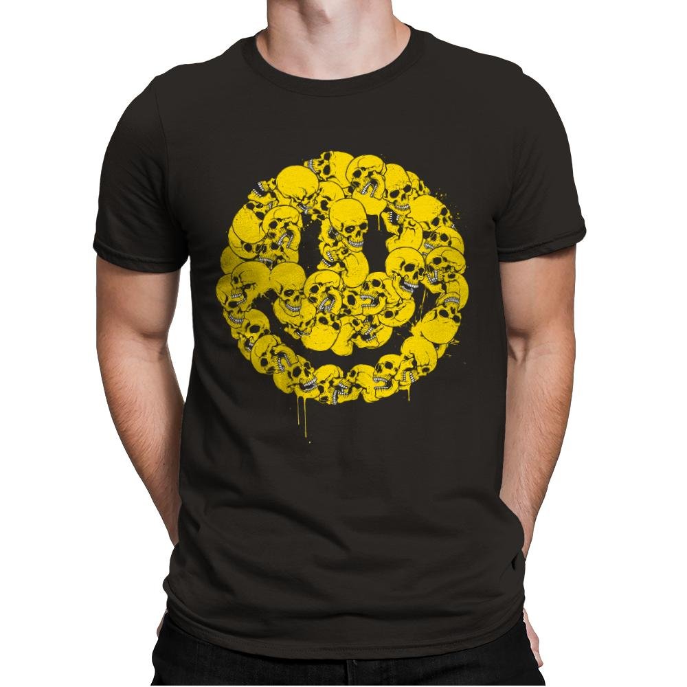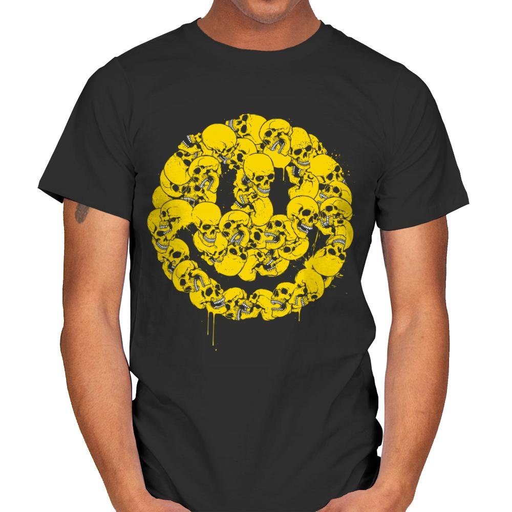 This design takes a universally friendly symbol and rebuilds it from something less comforting. A dense cluster of skulls forms a familiar smiley shape, rendered in bright yellow with drips that suggest motion and wear. The contrast between color and subject is deliberate, letting irony do the work instead of spelling it out. If you appreciate humor that stays sharp while looking cheerful at a distance, the image clicks fast.