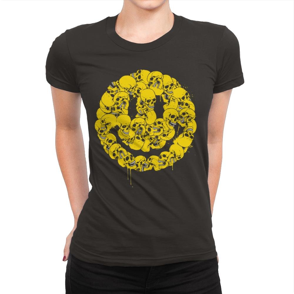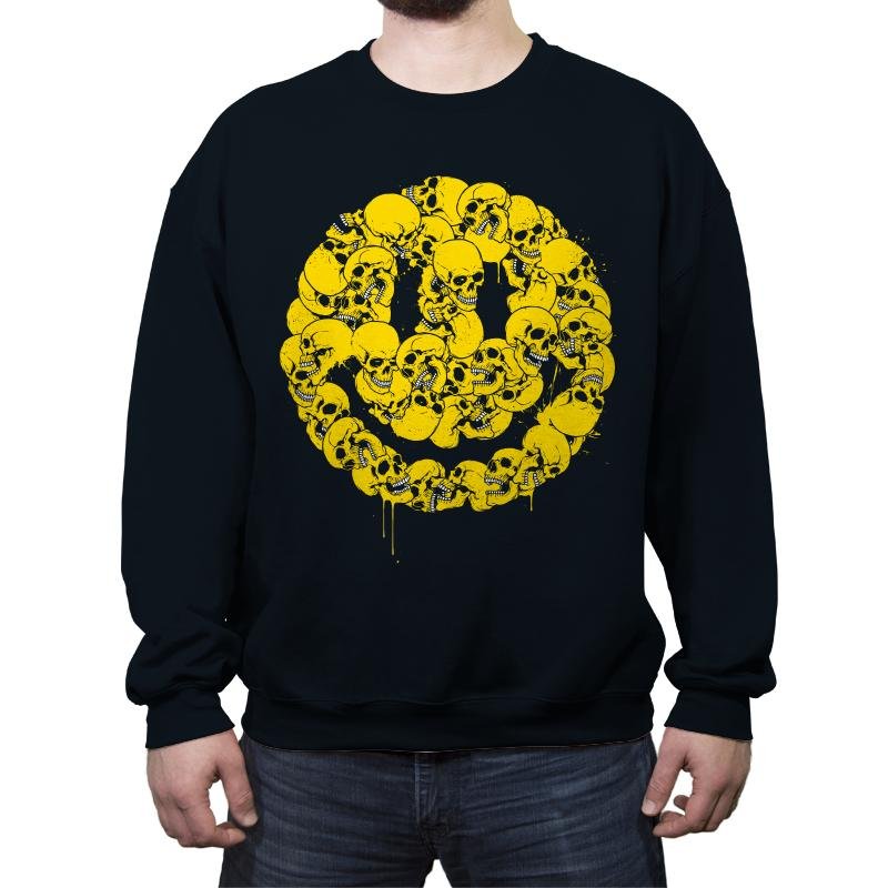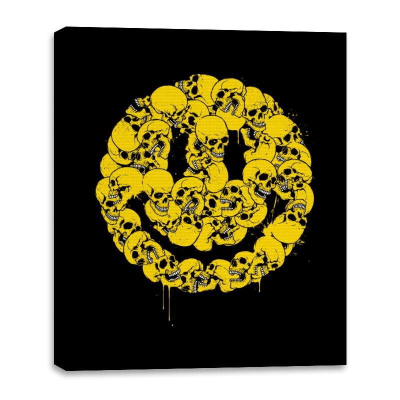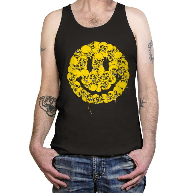 This design takes a universally friendly symbol and rebuilds it from something less comforting. A dense cluster of skulls forms a familiar smiley shape, rendered in bright yellow with drips that suggest motion and wear. The contrast between color and subject is deliberate, letting irony do the work instead of spelling it out. If you appreciate humor that stays sharp while looking cheerful at a distance, the image clicks fast.