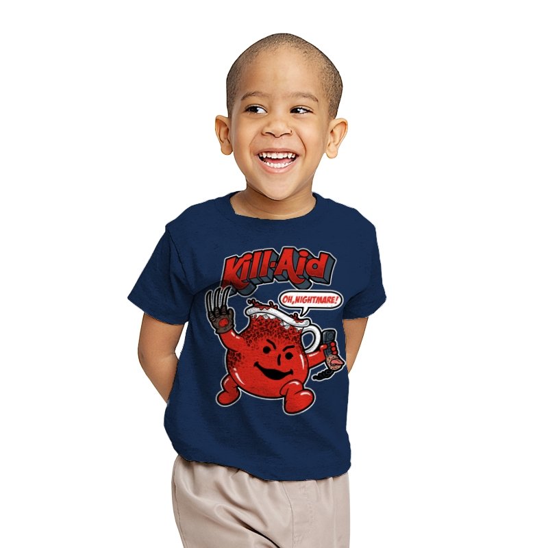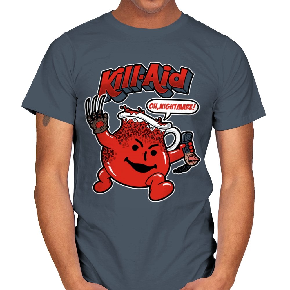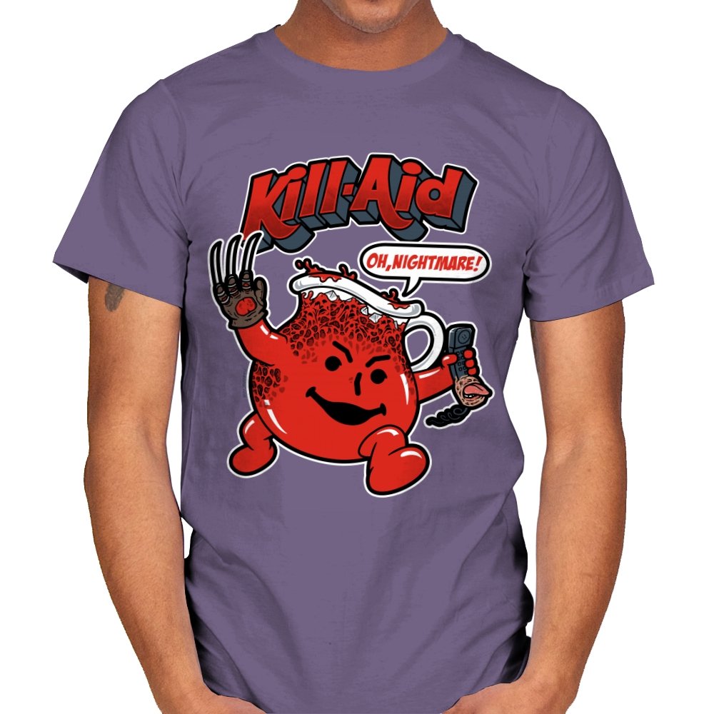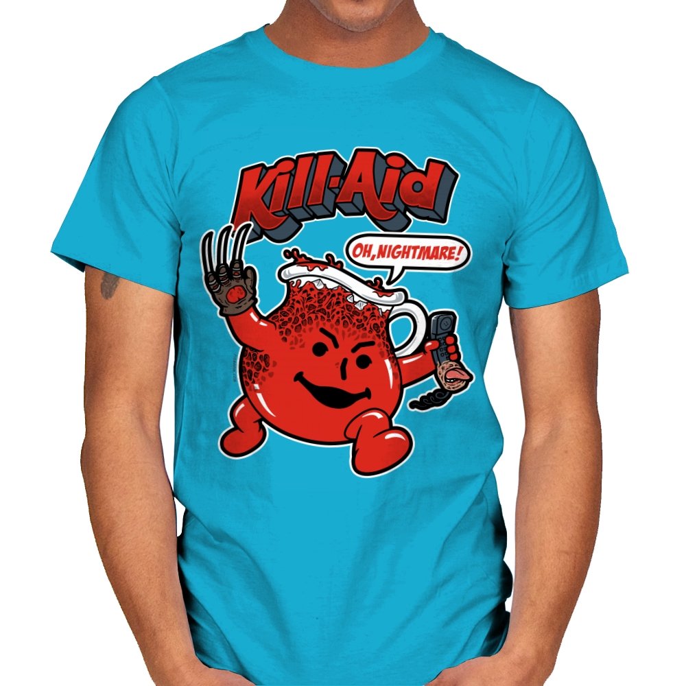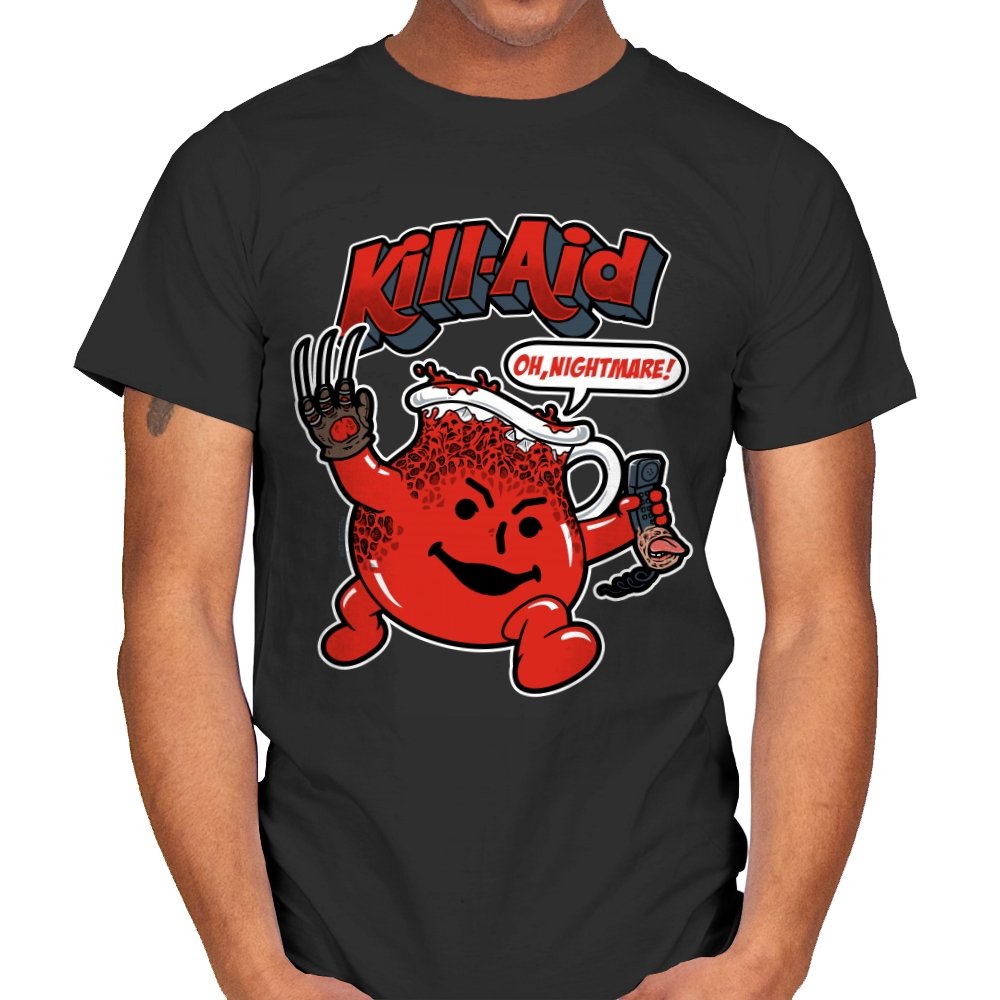“Kill-Aid” offers a hilarious twist on the classic Kool-Aid character, transforming him into a nightmarish figure with a gruesome twist. This quirky design features the iconic red pitcher character now sporting Freddy Krueger’s claws, dripping with horror and humor. The playful text “Oh, Nightmare!” adds to the terror-fueled fun, making it a perfect mashup for fans of horror and nostalgia.
