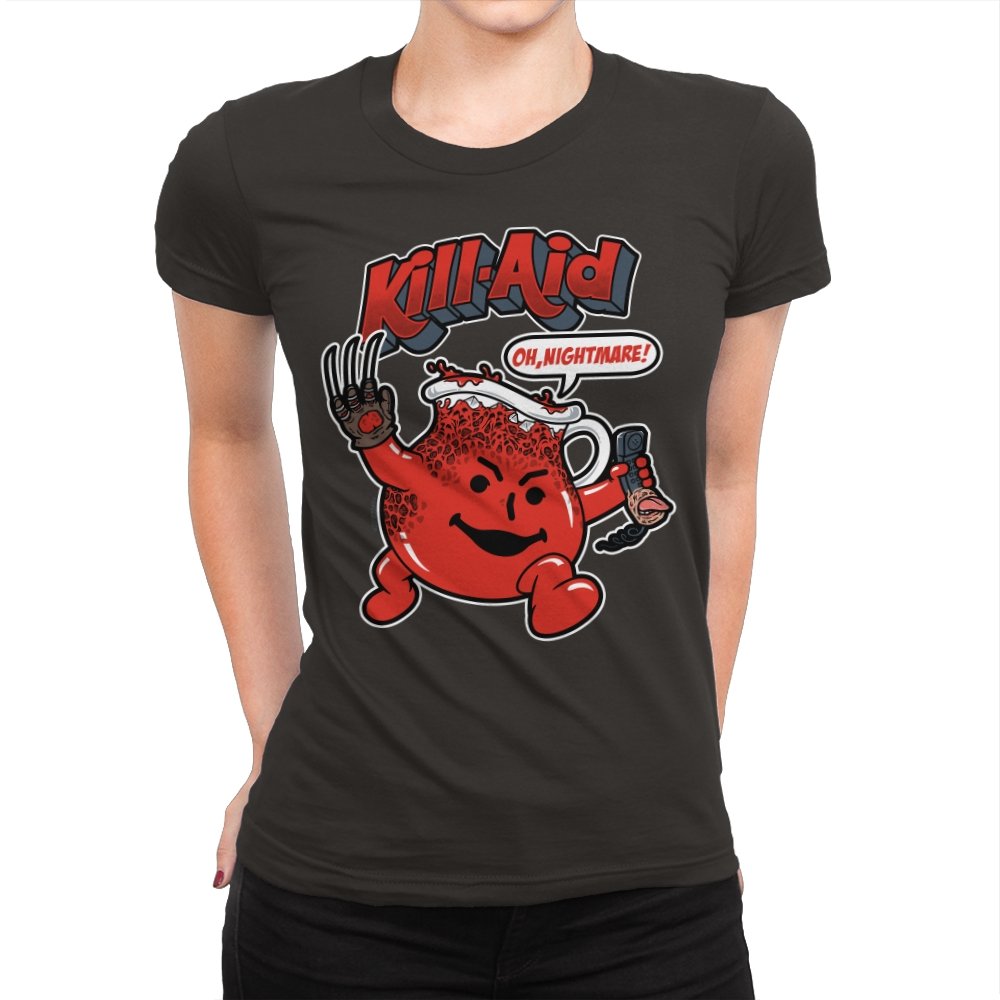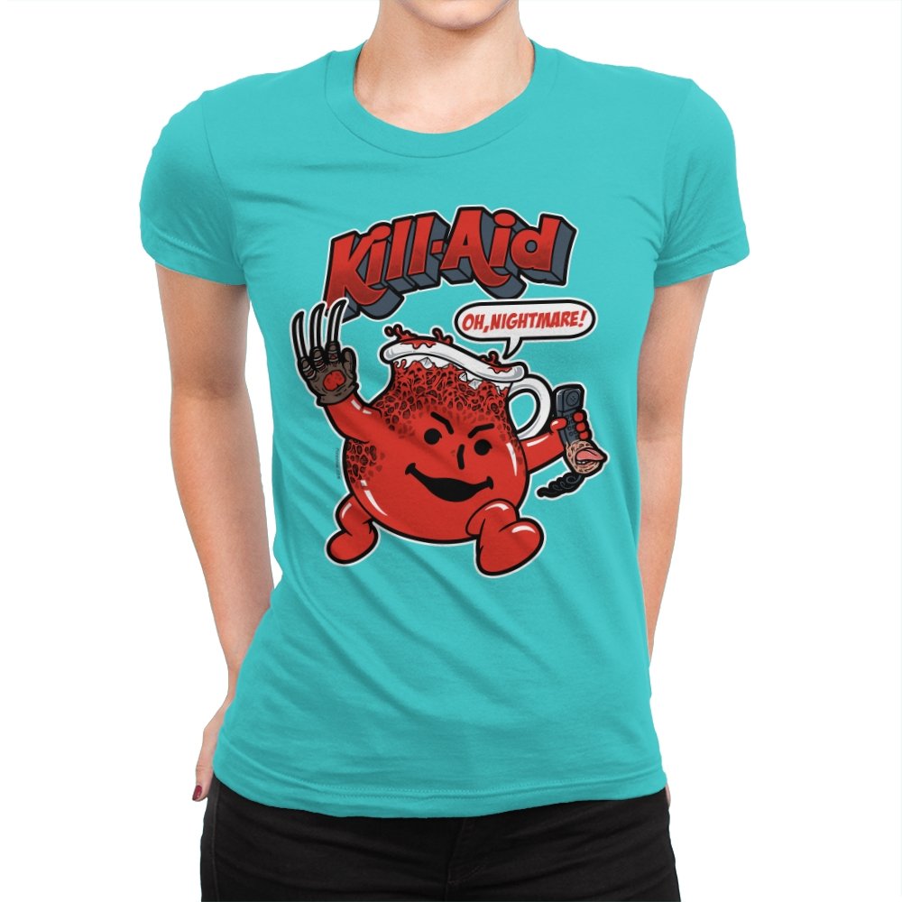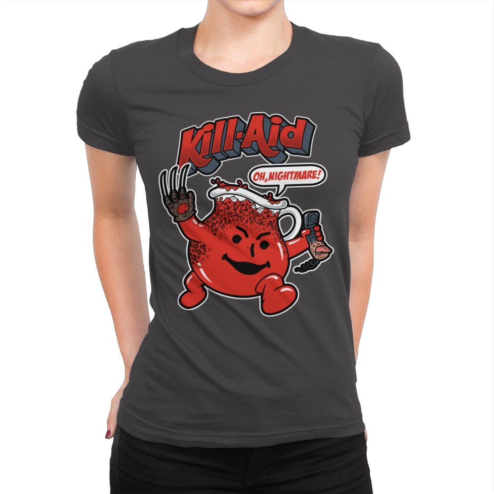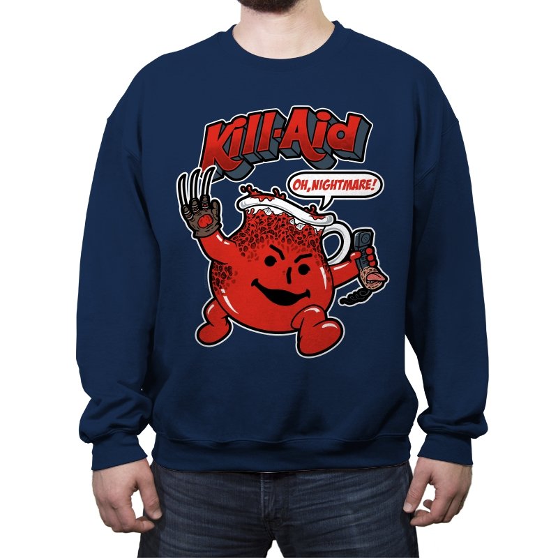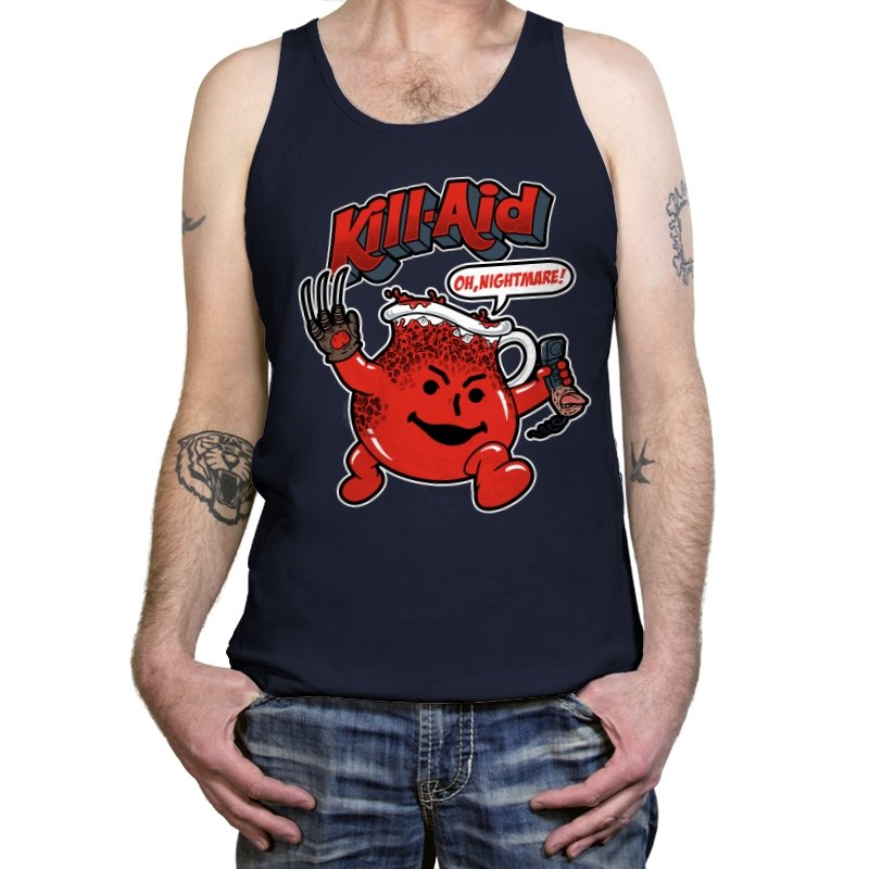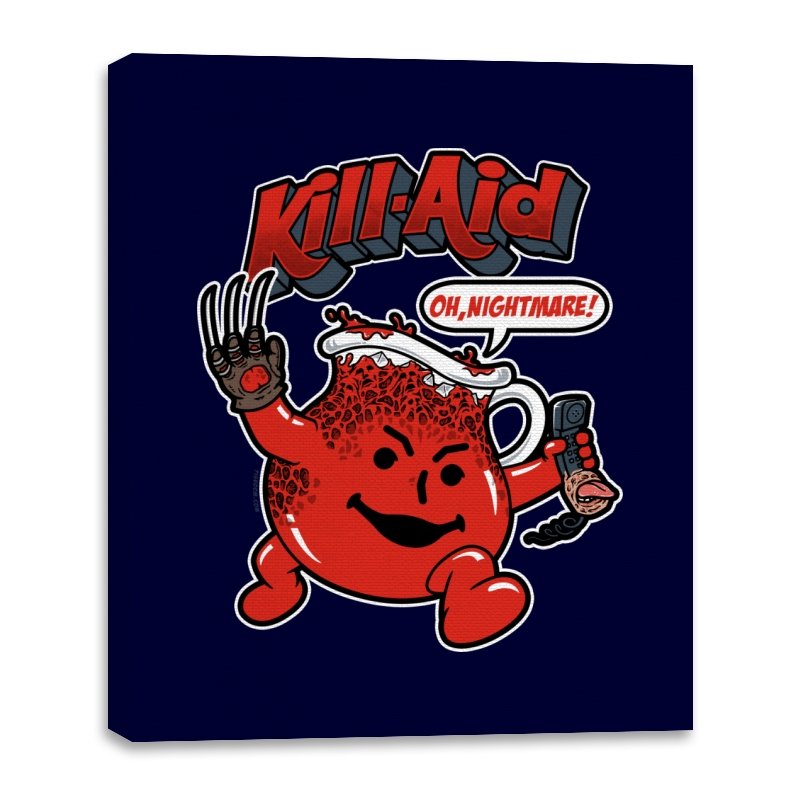“Kill-Aid” offers a hilarious twist on the classic Kool-Aid character, transforming him into a nightmarish figure with a gruesome twist. This quirky design features the iconic red pitcher character now sporting Freddy Krueger’s claws, dripping with horror and humor. The playful text “Oh, Nightmare!” adds to the terror-fueled fun, making it a perfect mashup for fans of horror and nostalgia.