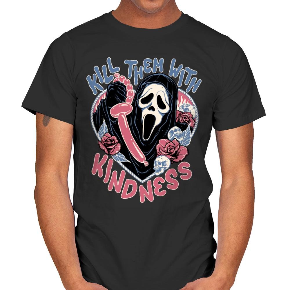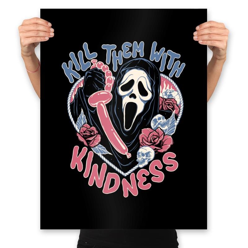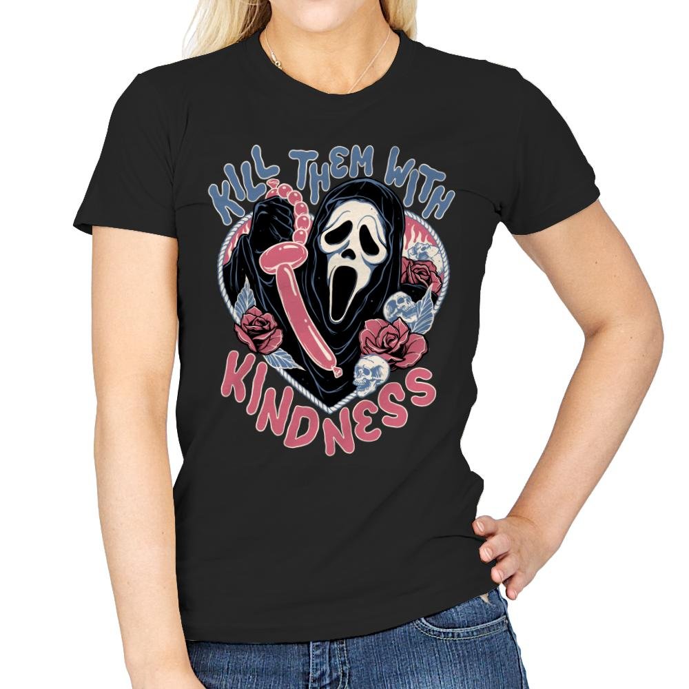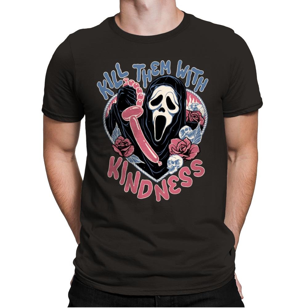 This design flips a familiar phrase into something darker and absurd. A ghostly masked figure holds a twisted balloon, surrounded by roses, lace details, and soft pastel tones that clash with the scream frozen on the face. The mix of cute colors and slasher energy is intentional, turning sweetness into a threat with a wink. Fans who get it understand the joke lives in that contrast.