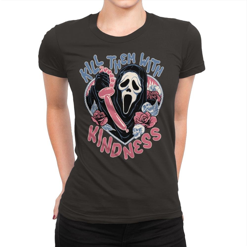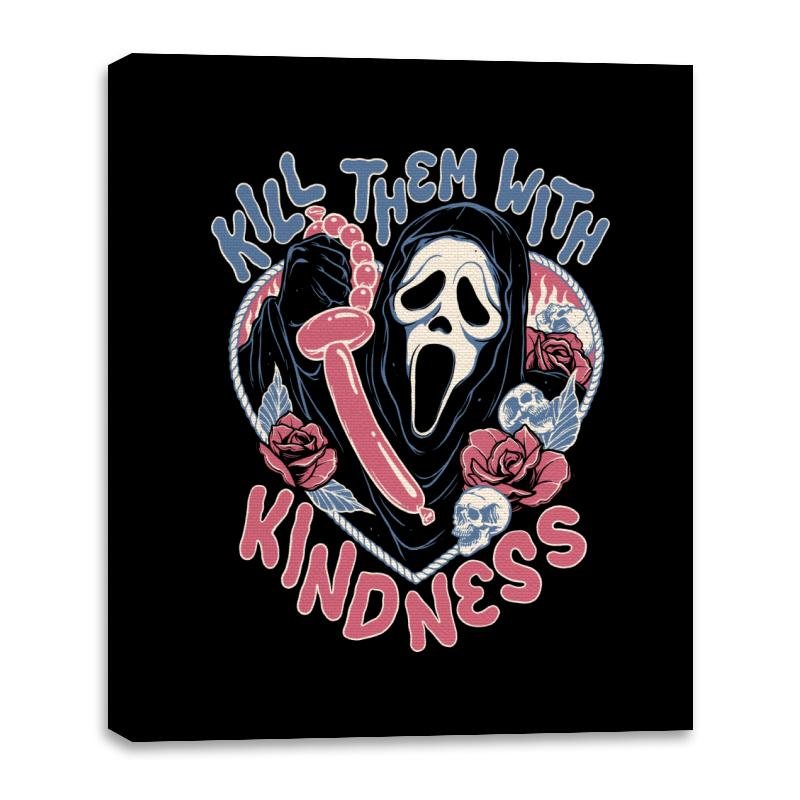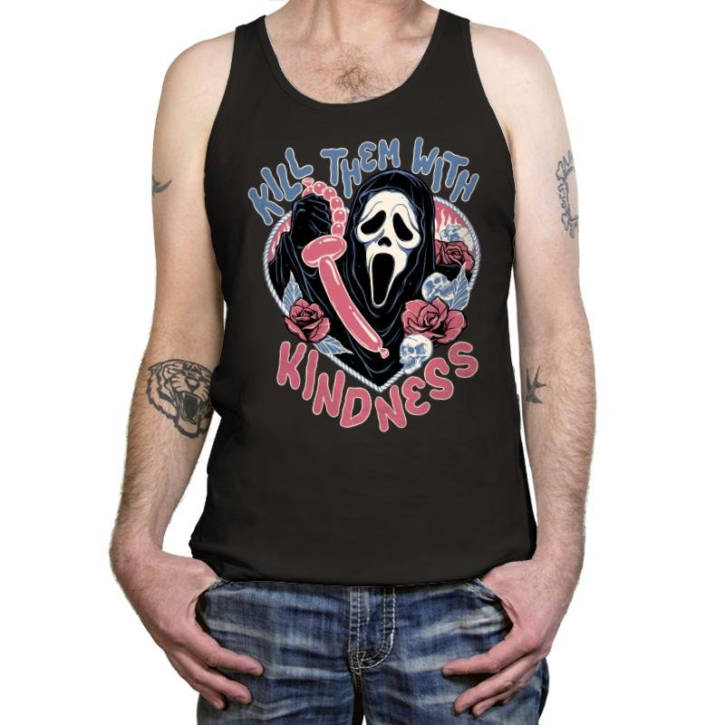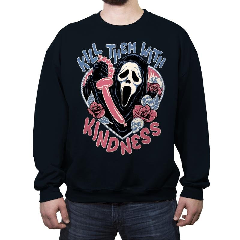 This design flips a familiar phrase into something darker and absurd. A ghostly masked figure holds a twisted balloon, surrounded by roses, lace details, and soft pastel tones that clash with the scream frozen on the face. The mix of cute colors and slasher energy is intentional, turning sweetness into a threat with a wink. Fans who get it understand the joke lives in that contrast.