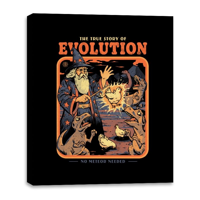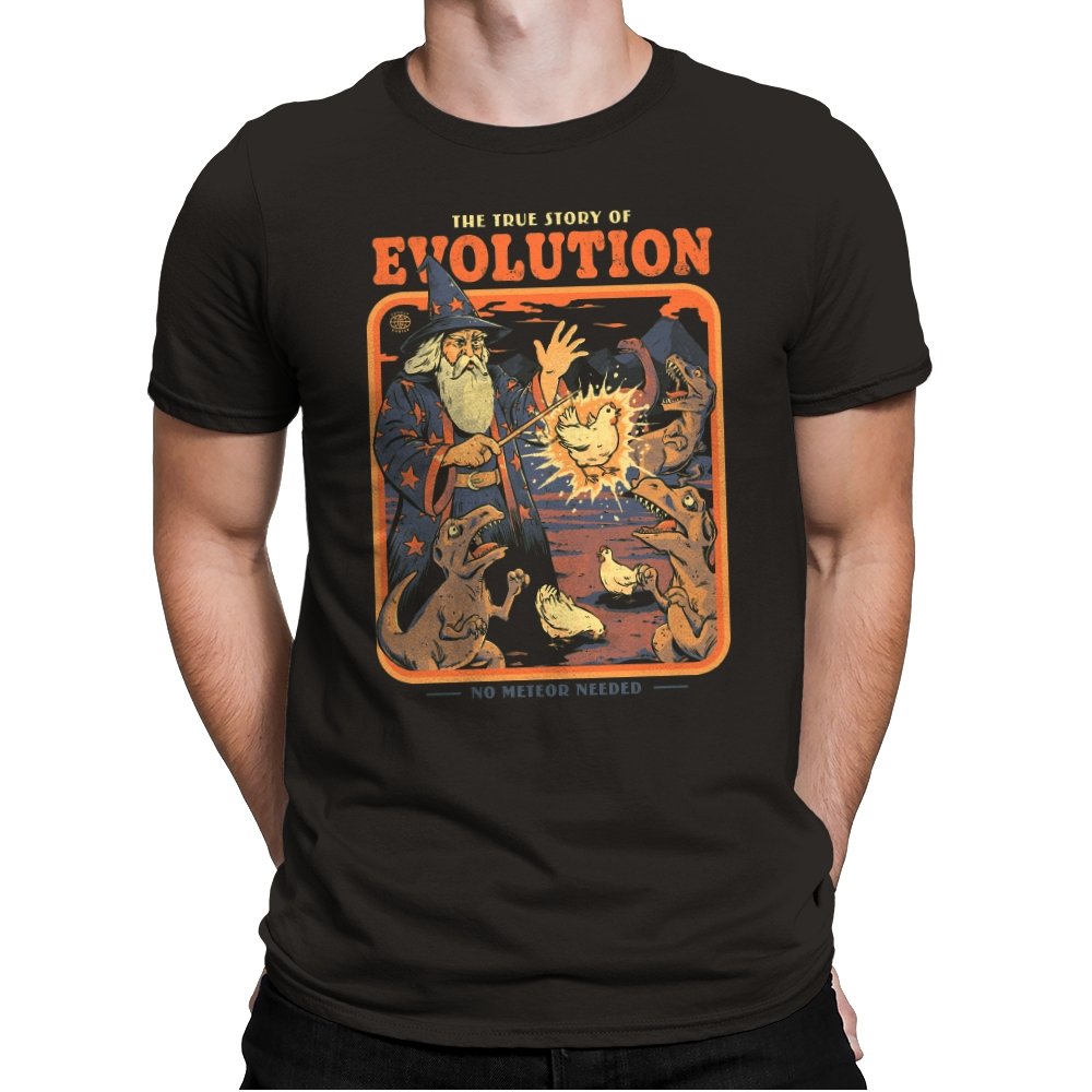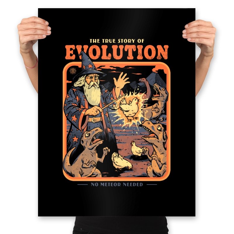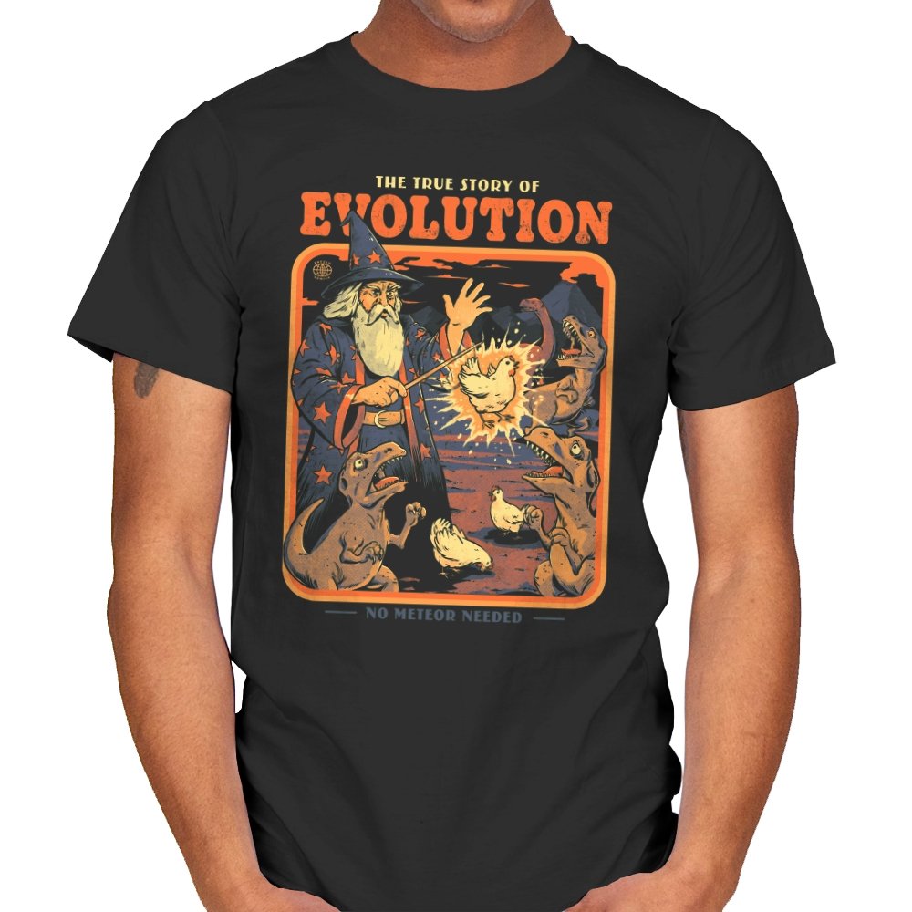 This design imagines the origin of birds not as a slow evolutionary process but as a magical intervention. A long bearded wizard in star covered robes waves his staff toward a pack of small, hungry dinosaurs, transforming one into a plump chicken in a burst of light. The banner at the top announces the “true story of evolution” while the bottom insists that no meteor was required. Fans of science jokes, fantasy tropes, and vintage textbook illustrations will get the overlap immediately.