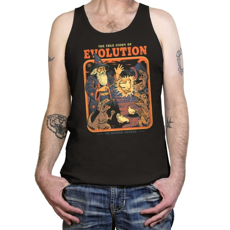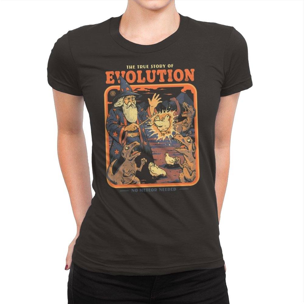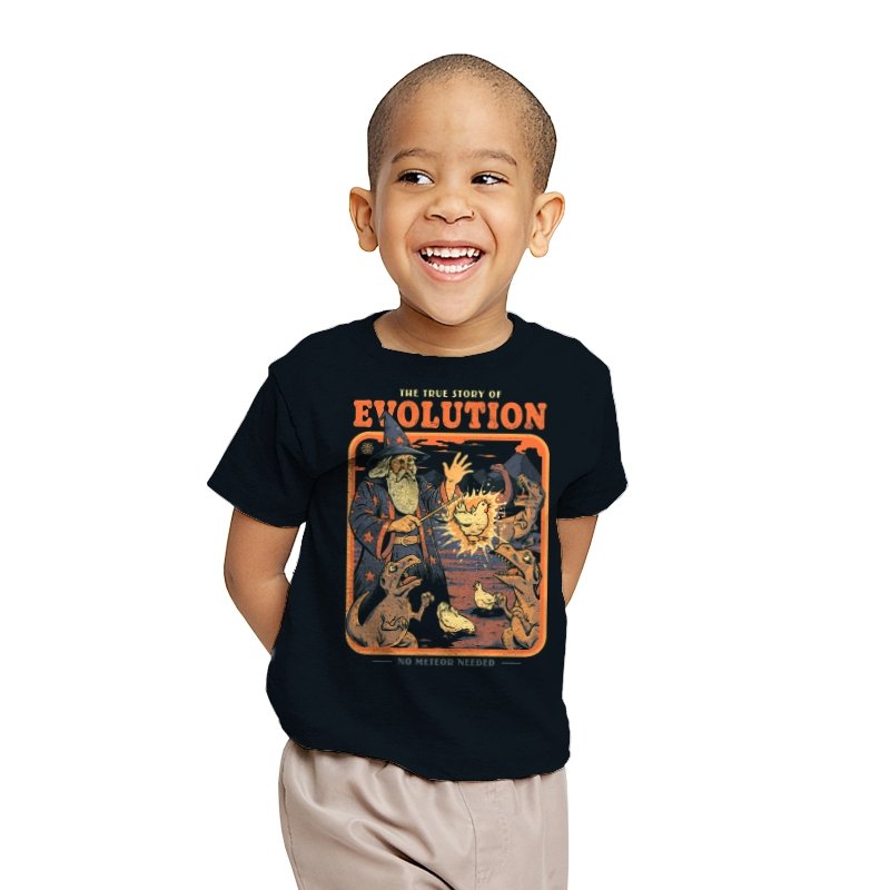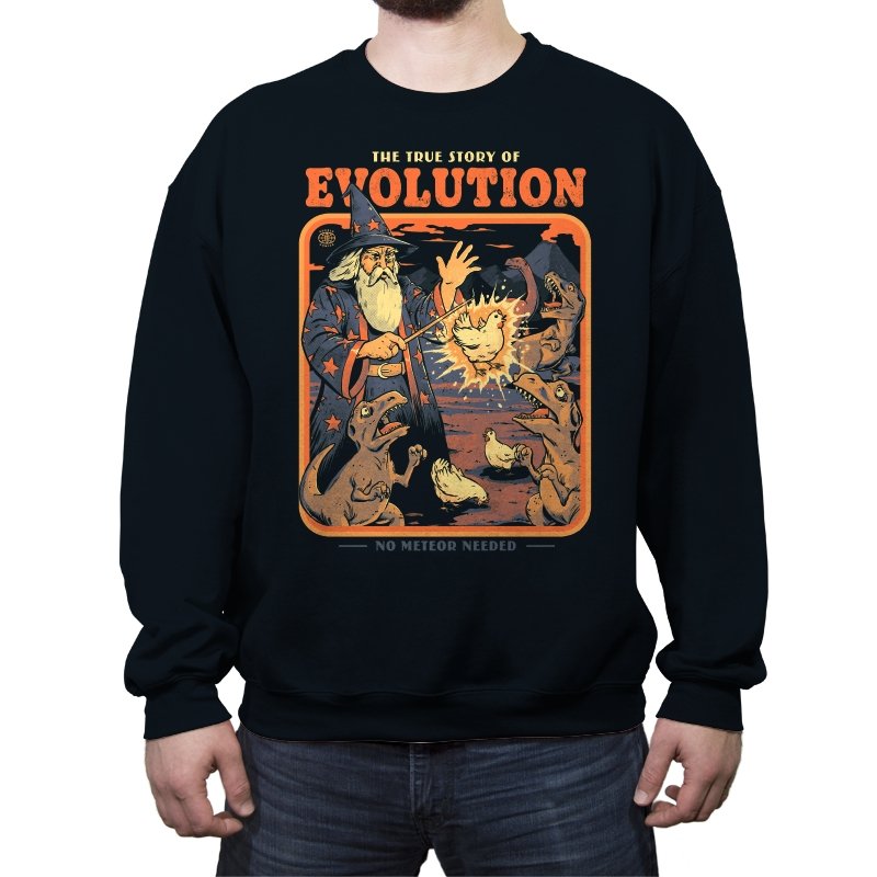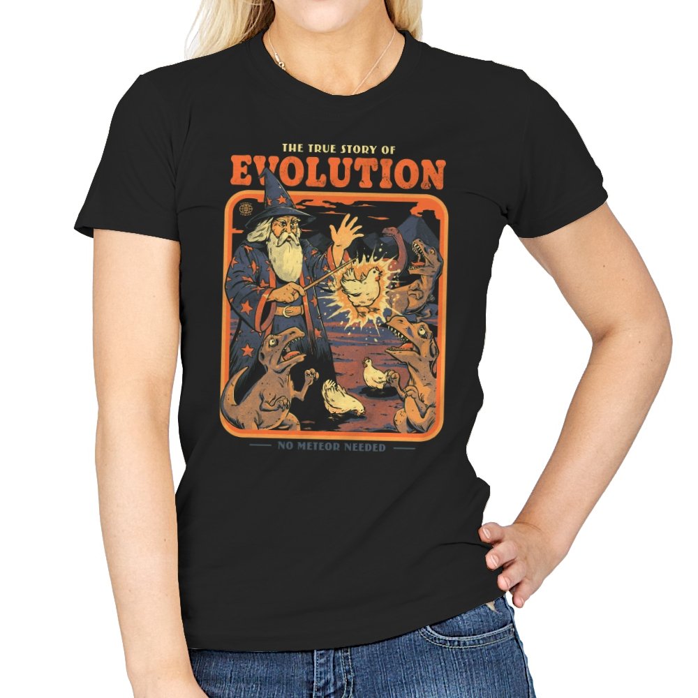 This design imagines the origin of birds not as a slow evolutionary process but as a magical intervention. A long bearded wizard in star covered robes waves his staff toward a pack of small, hungry dinosaurs, transforming one into a plump chicken in a burst of light. The banner at the top announces the “true story of evolution” while the bottom insists that no meteor was required. Fans of science jokes, fantasy tropes, and vintage textbook illustrations will get the overlap immediately.