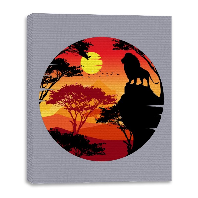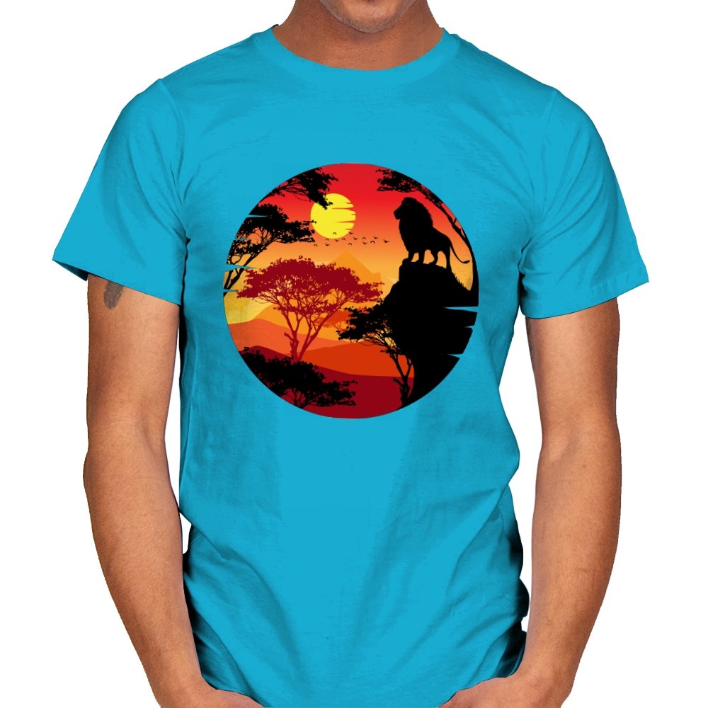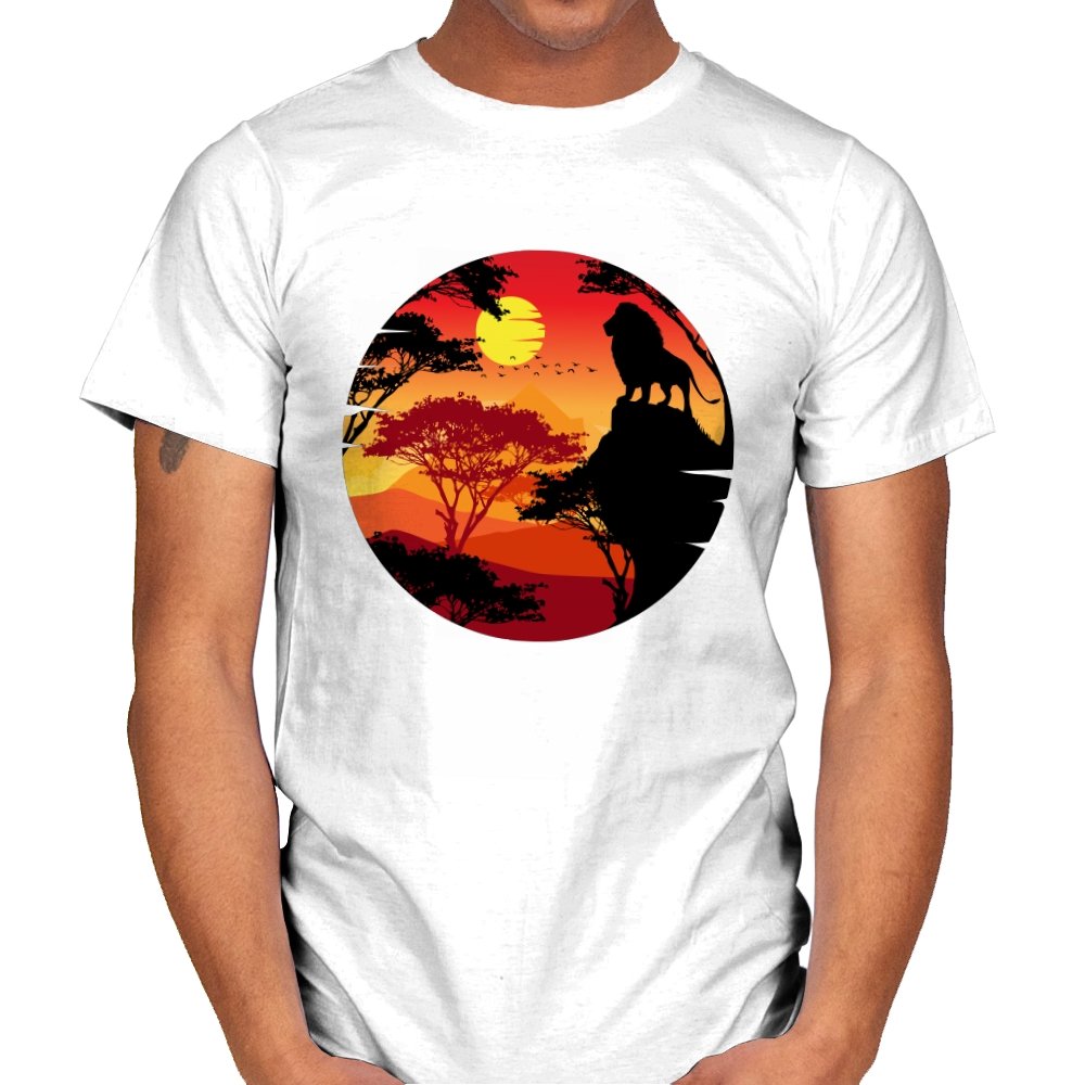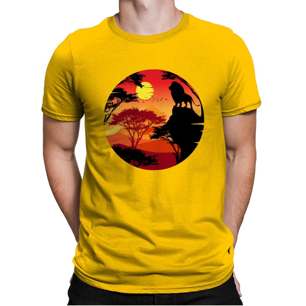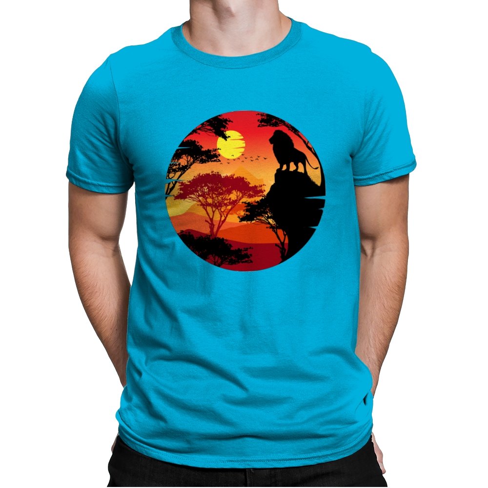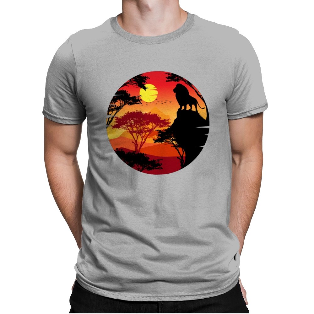 This design frames a quiet moment of power and balance. A lone lion stands in silhouette against a layered sunset, surrounded by acacia trees and distant hills that fade into warm reds and golds. The circular composition feels timeless, like a story paused at its most meaningful beat. Fans who recognize the reference will catch the symbolism without needing it spelled out.